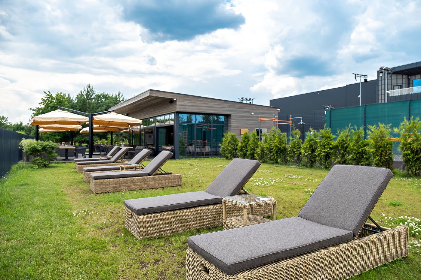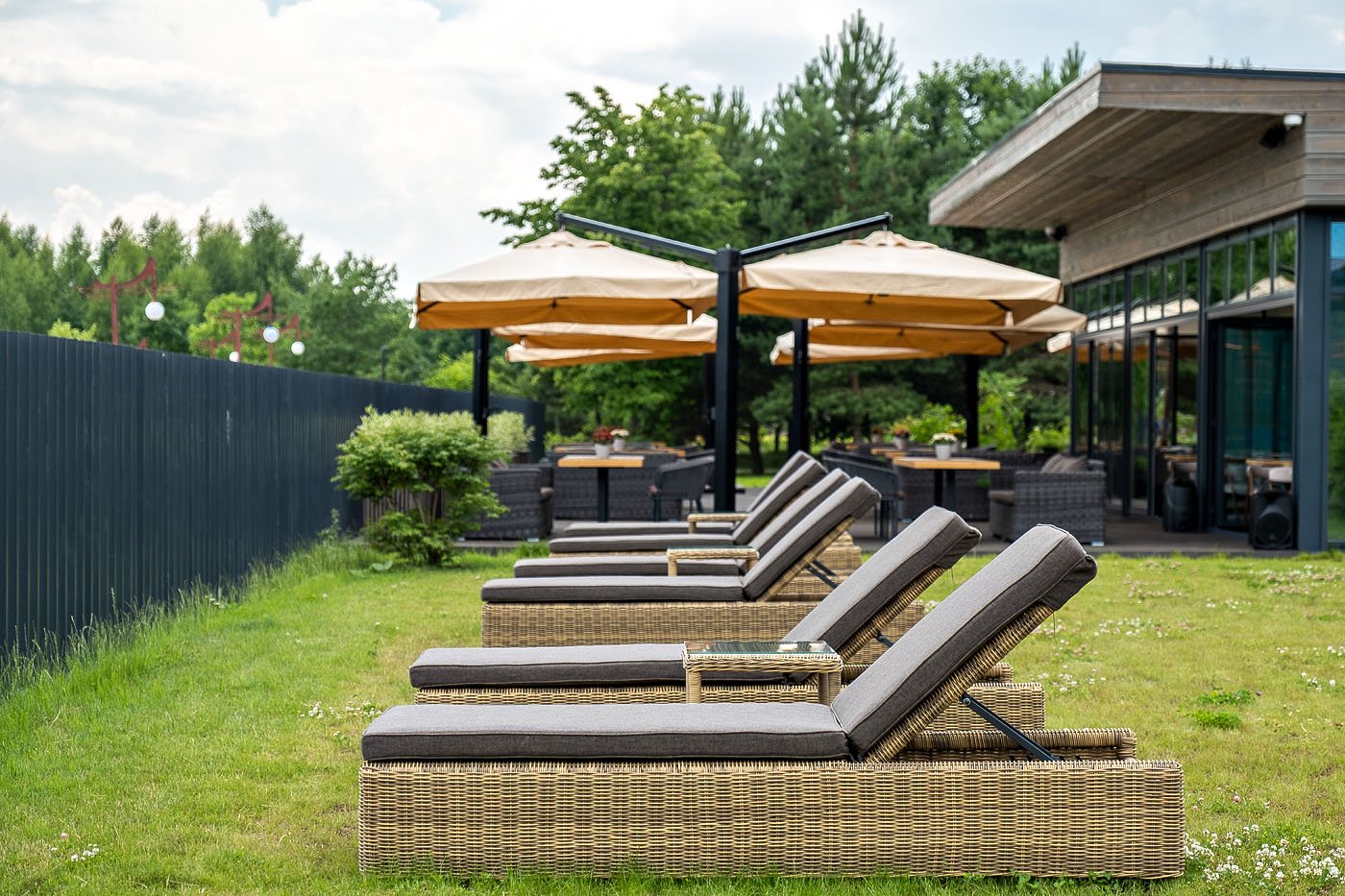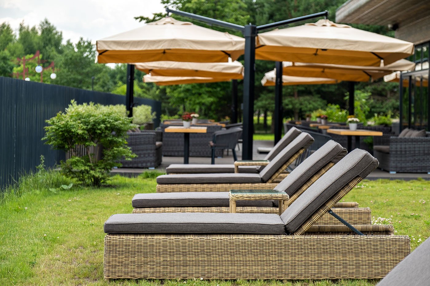 Есть несколько пазов, благодаря которым можно поднимать или опускать спинку. Также комфорт обеспечивает мягкий матрас. Съемный чехол серо-коричневого цвета изготовлен из 100%-го полиэстера с водоотталкивающим эффектом. Мебель оплетена вручную.