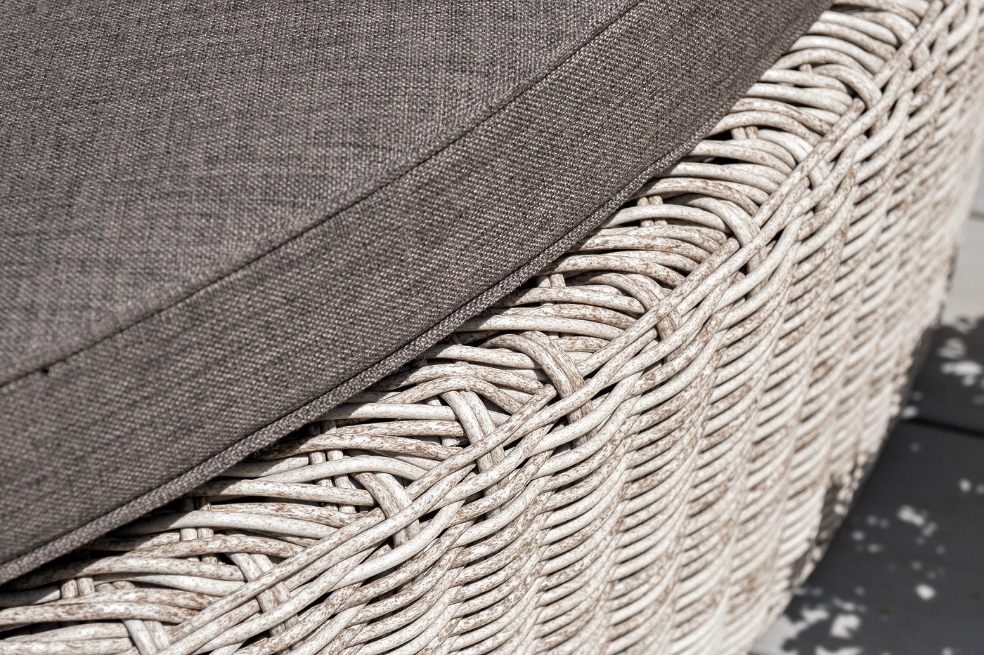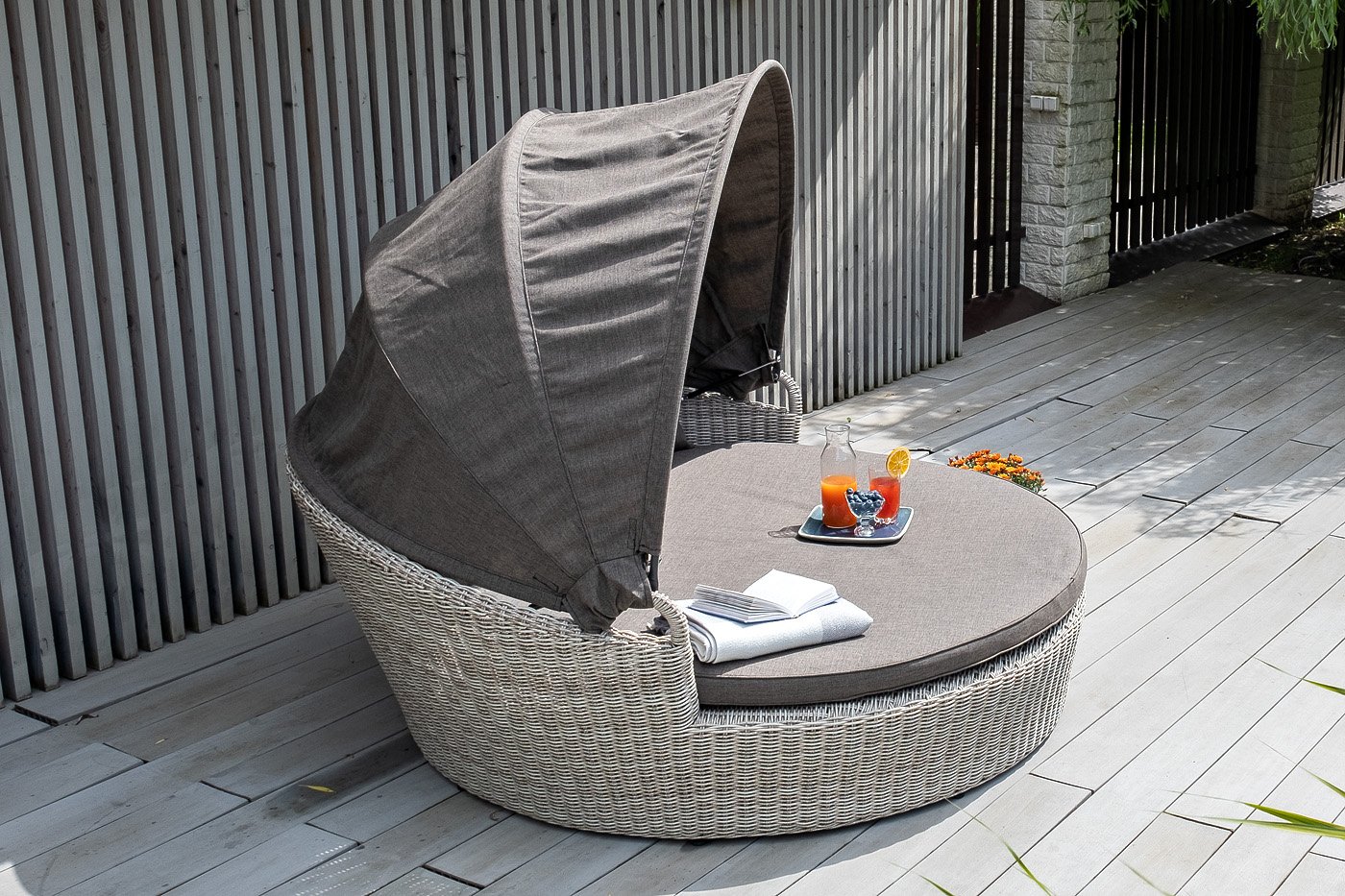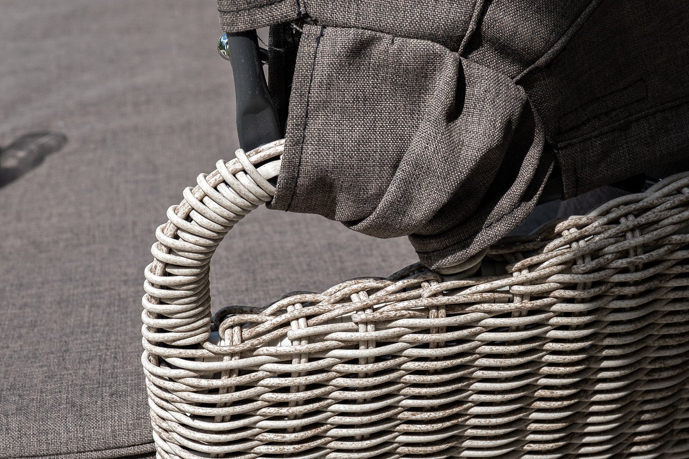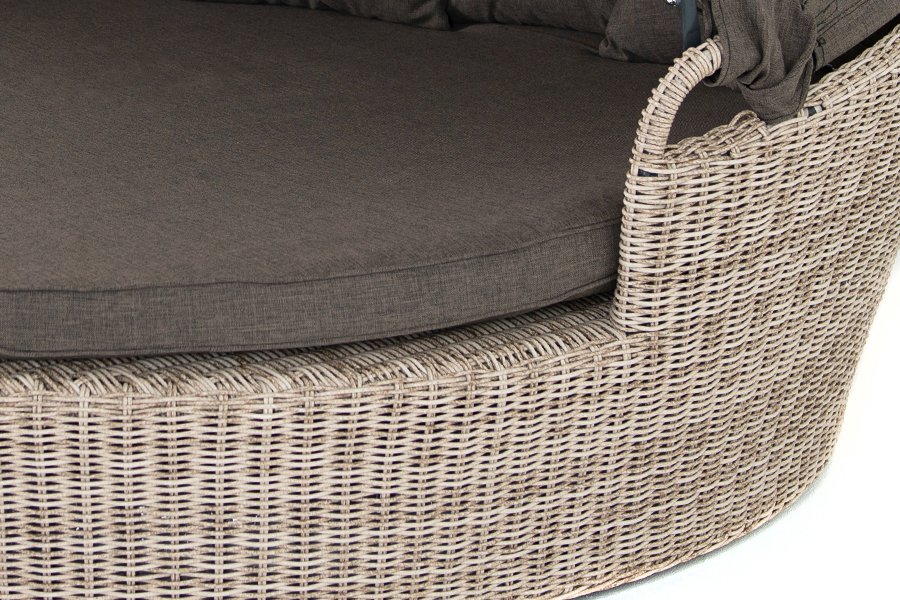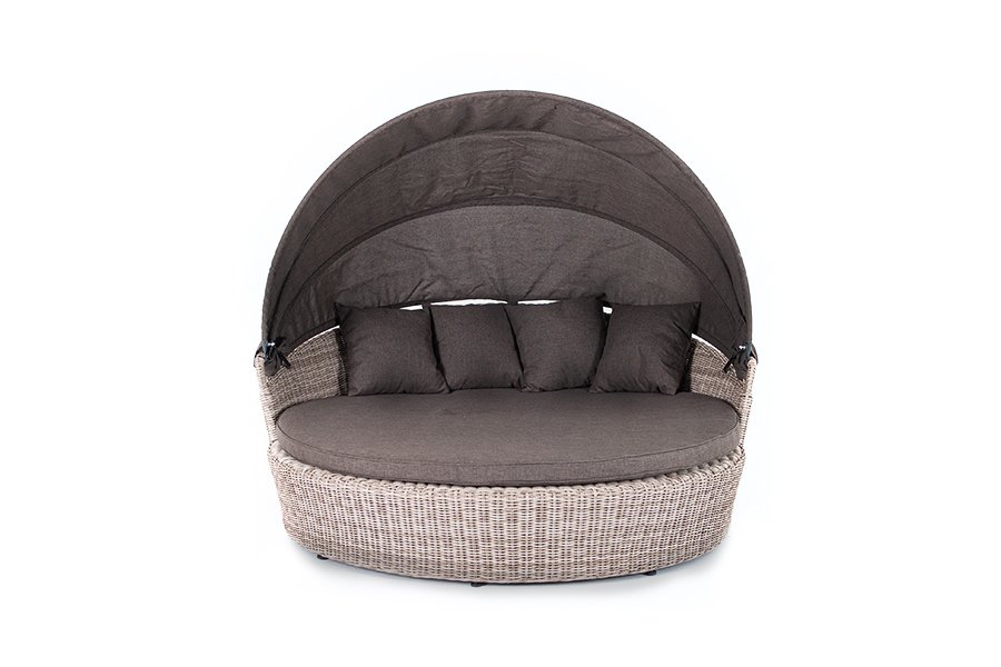 Данная модель имеет в основании прочный алюминиевый каркас, оплетенный вручную круглым ротангом светло-серого цвета и оснащена регулируемым козырьком, который ограничивает попадание солнечных лучей.