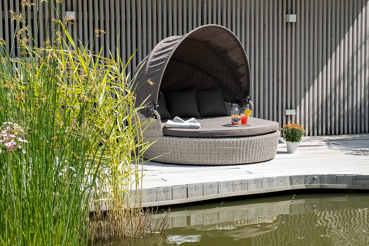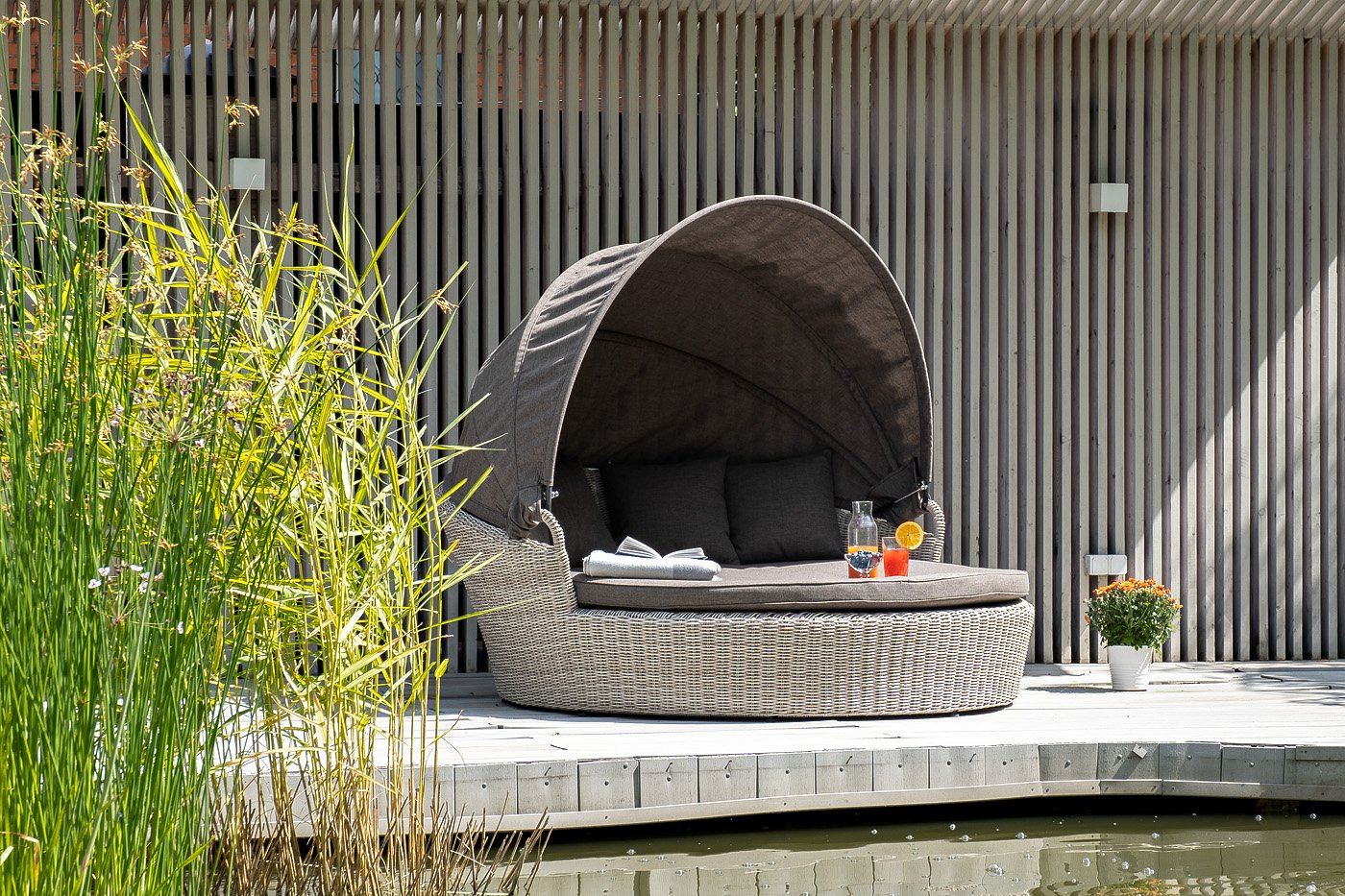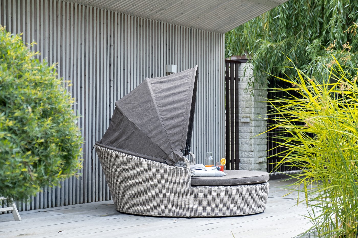 Данная модель имеет в основании прочный алюминиевый каркас, оплетенный вручную круглым ротангом светло-серого цвета и оснащена регулируемым козырьком, который ограничивает попадание солнечных лучей.
