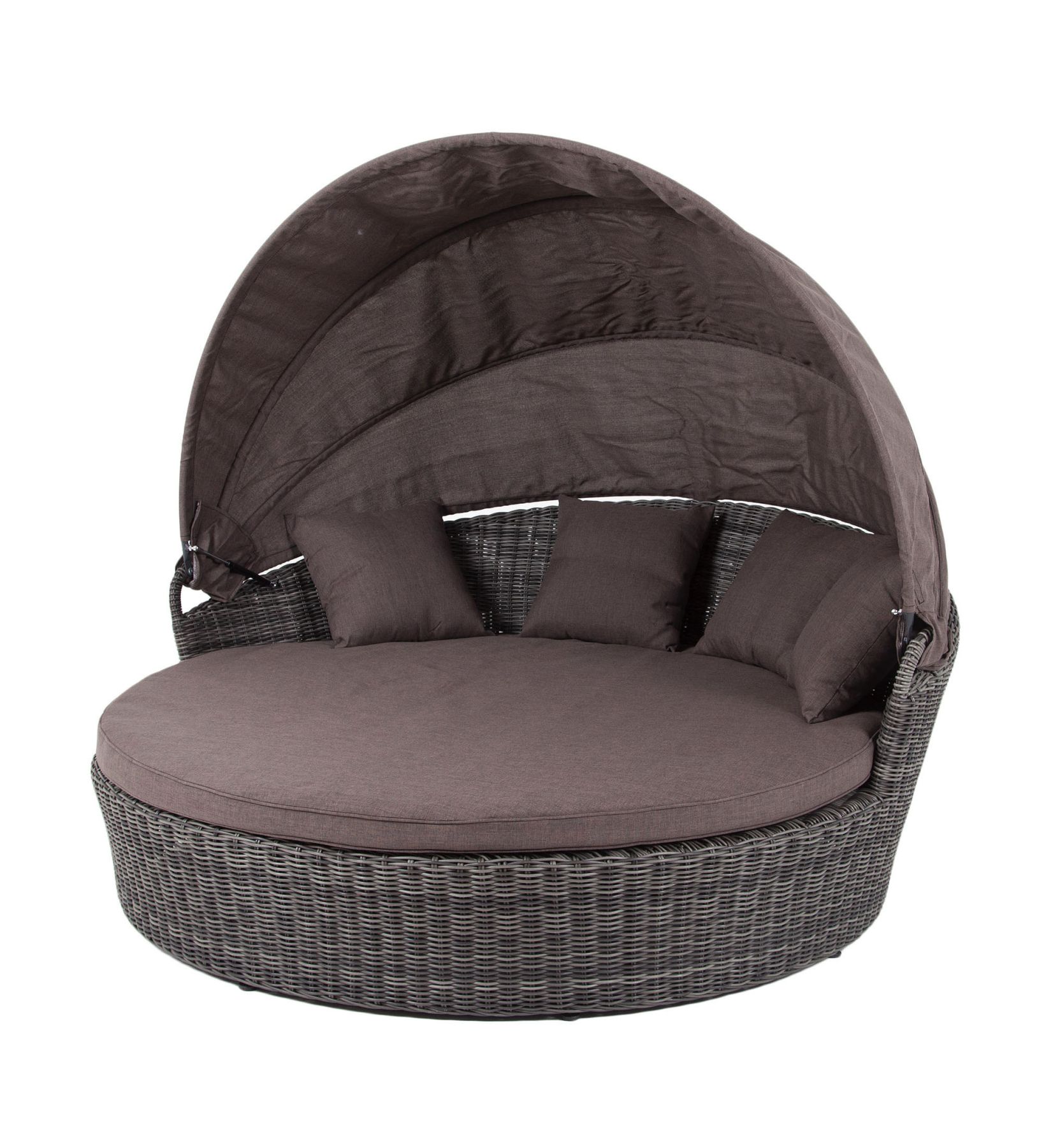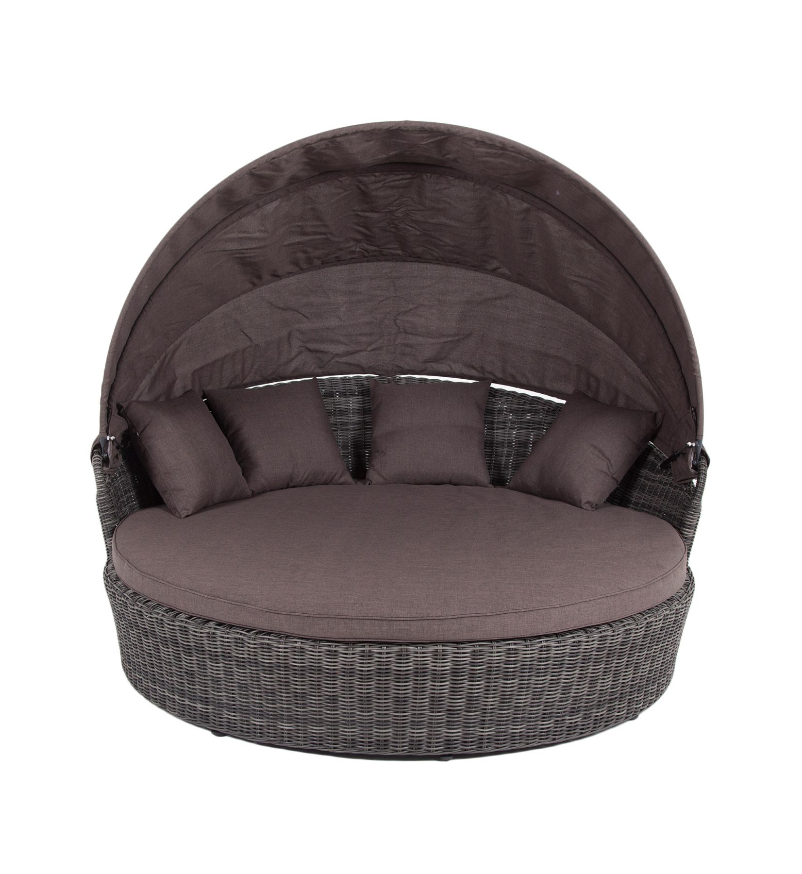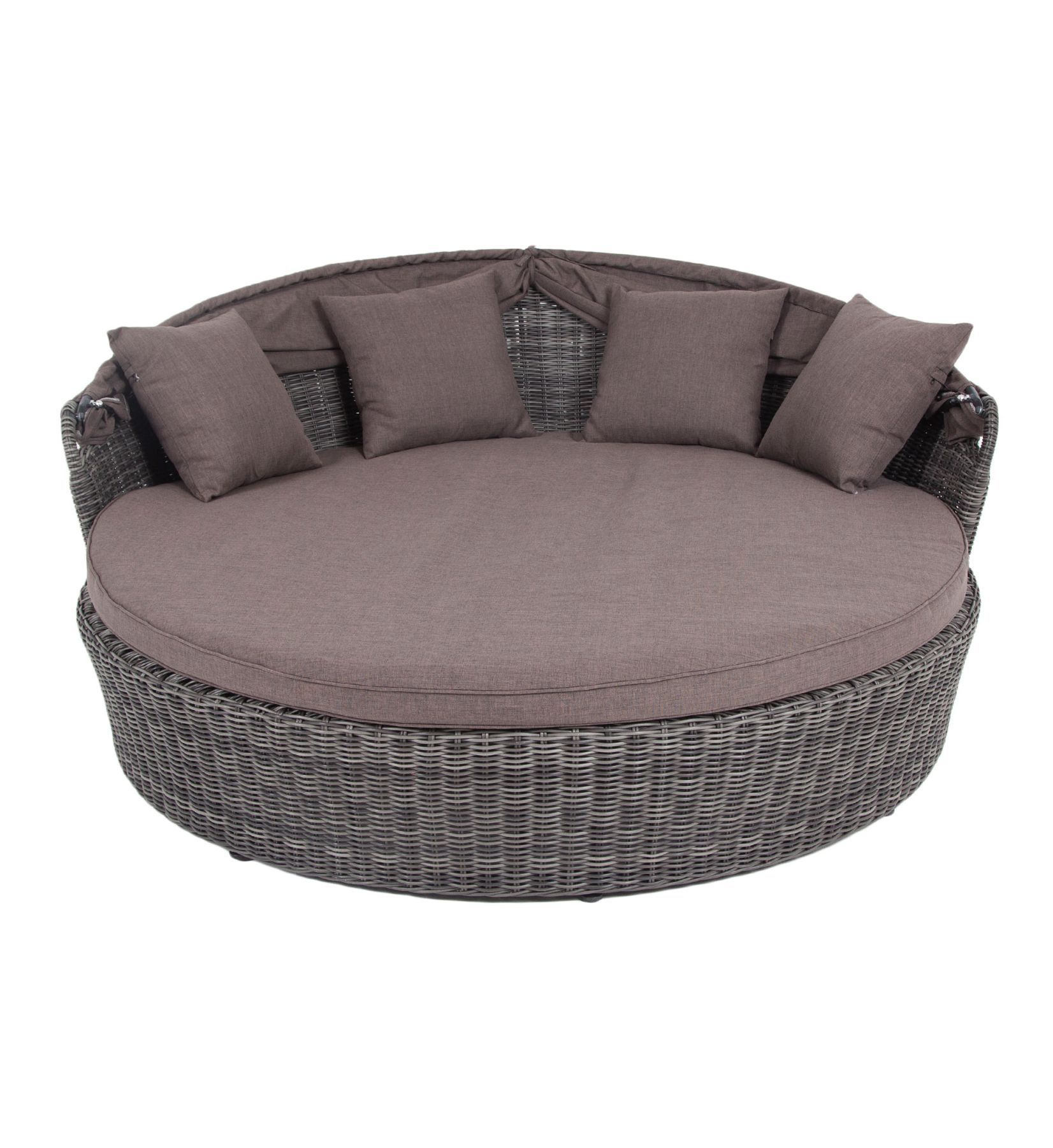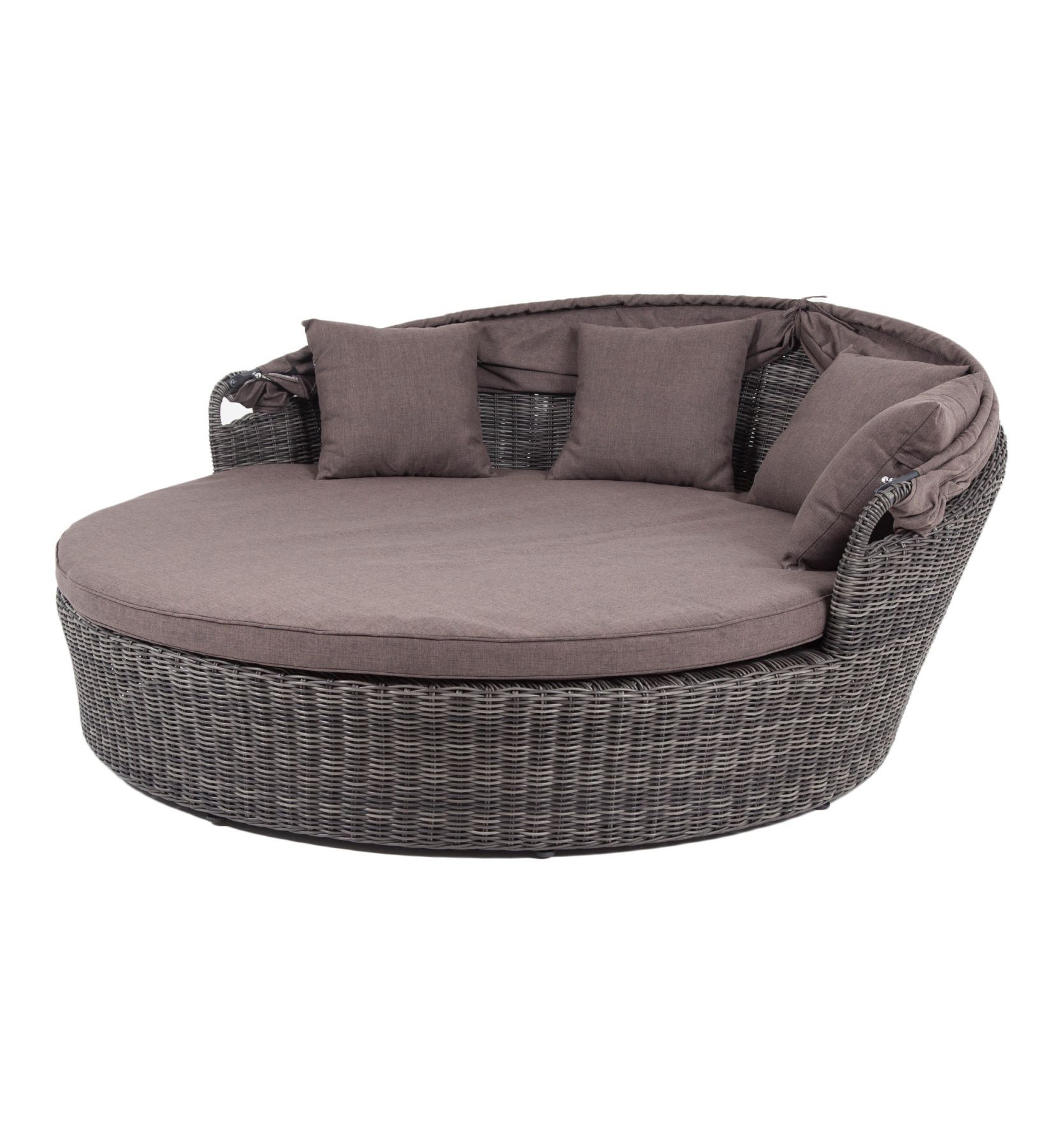 Функциональная круглая кровать высотой в 700 мм и диаметром в 1800 мм выполнена плетением вручную из круглого искусственного ротанга. Конструкция усилена алюминиевым каркасом.