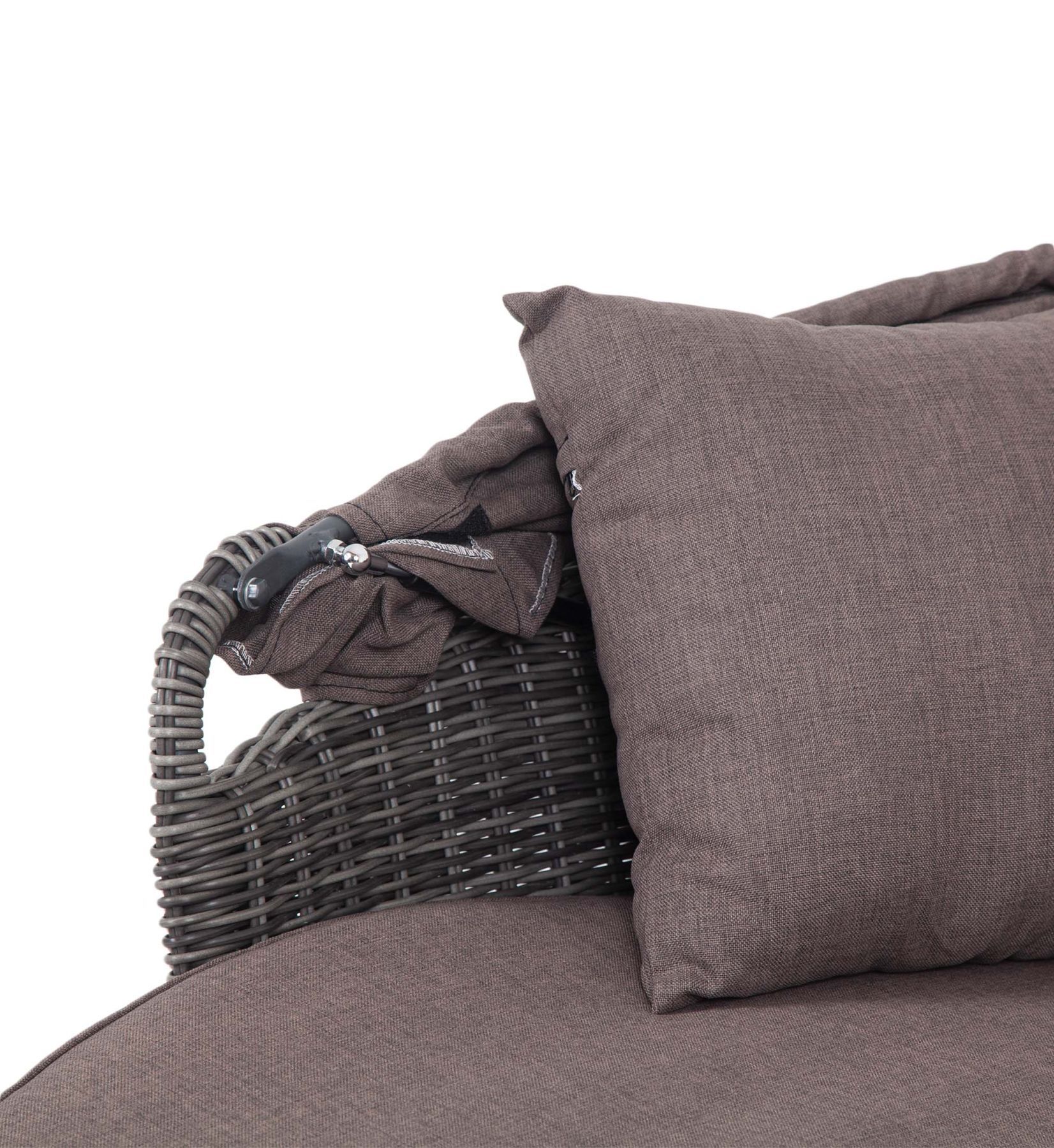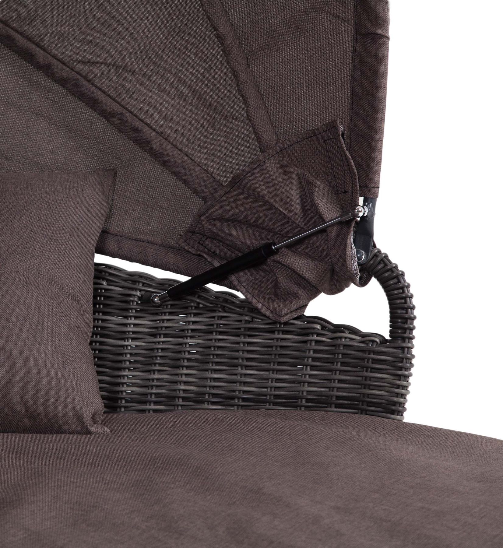 Козырек откидывающийся, выполнен из водостойкой полиэфирной ткани. Мягкий матрас имеет съемный чехол серо-коричневого цвета, подлежит машинной стирке.