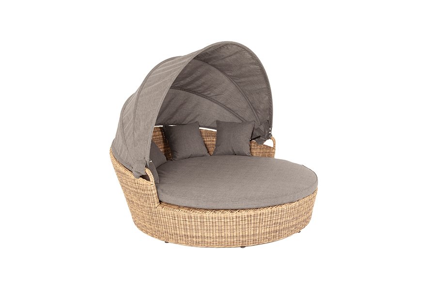 Функциональная круглая кровать высотой в 700 мм и диаметром в 1800 мм выполнена плетением вручную из искусственного ротанга. Конструкция усилена алюминиевым каркасом.