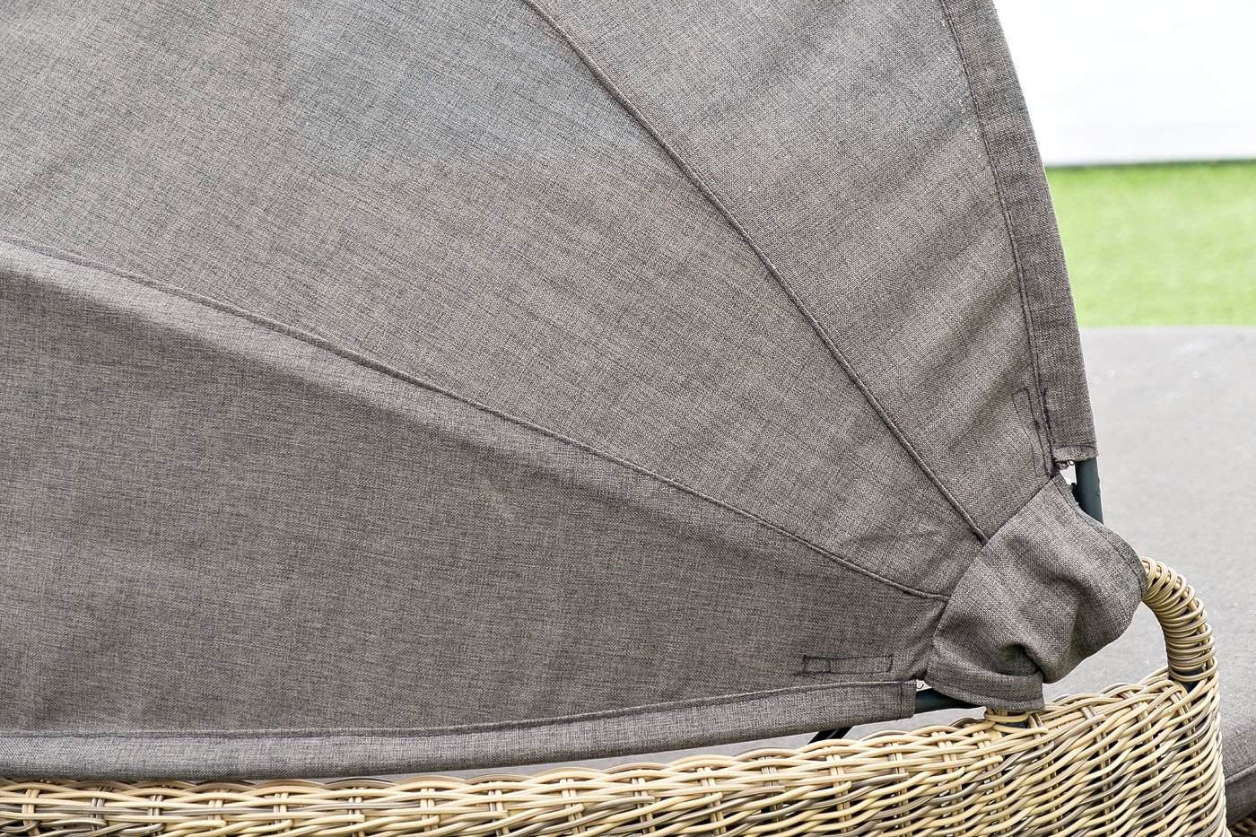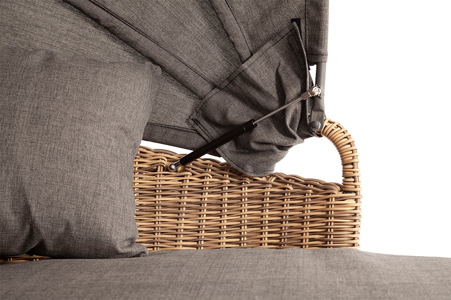 Козырек откидывающийся, выполнен из водостойкой полиэфирной ткани. Мягкий матрас имеет съемный чехол серо-коричневого цвета, подлежит машинной стирке.