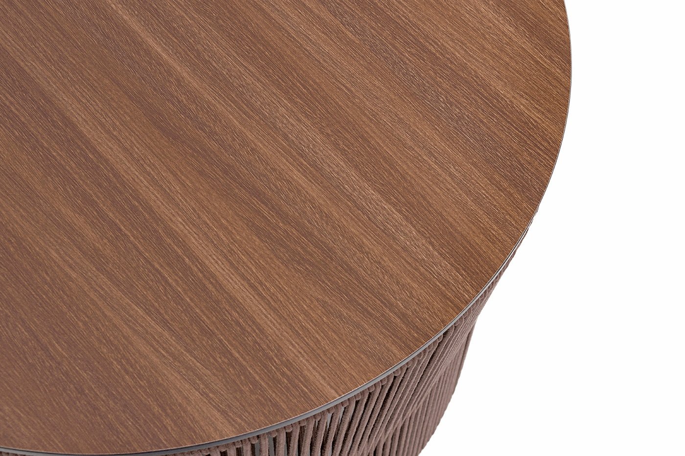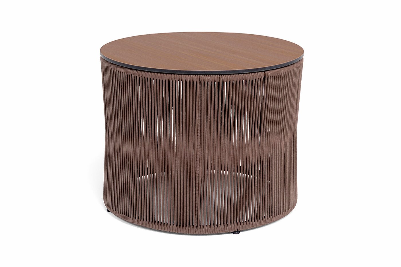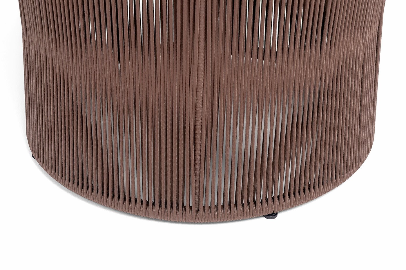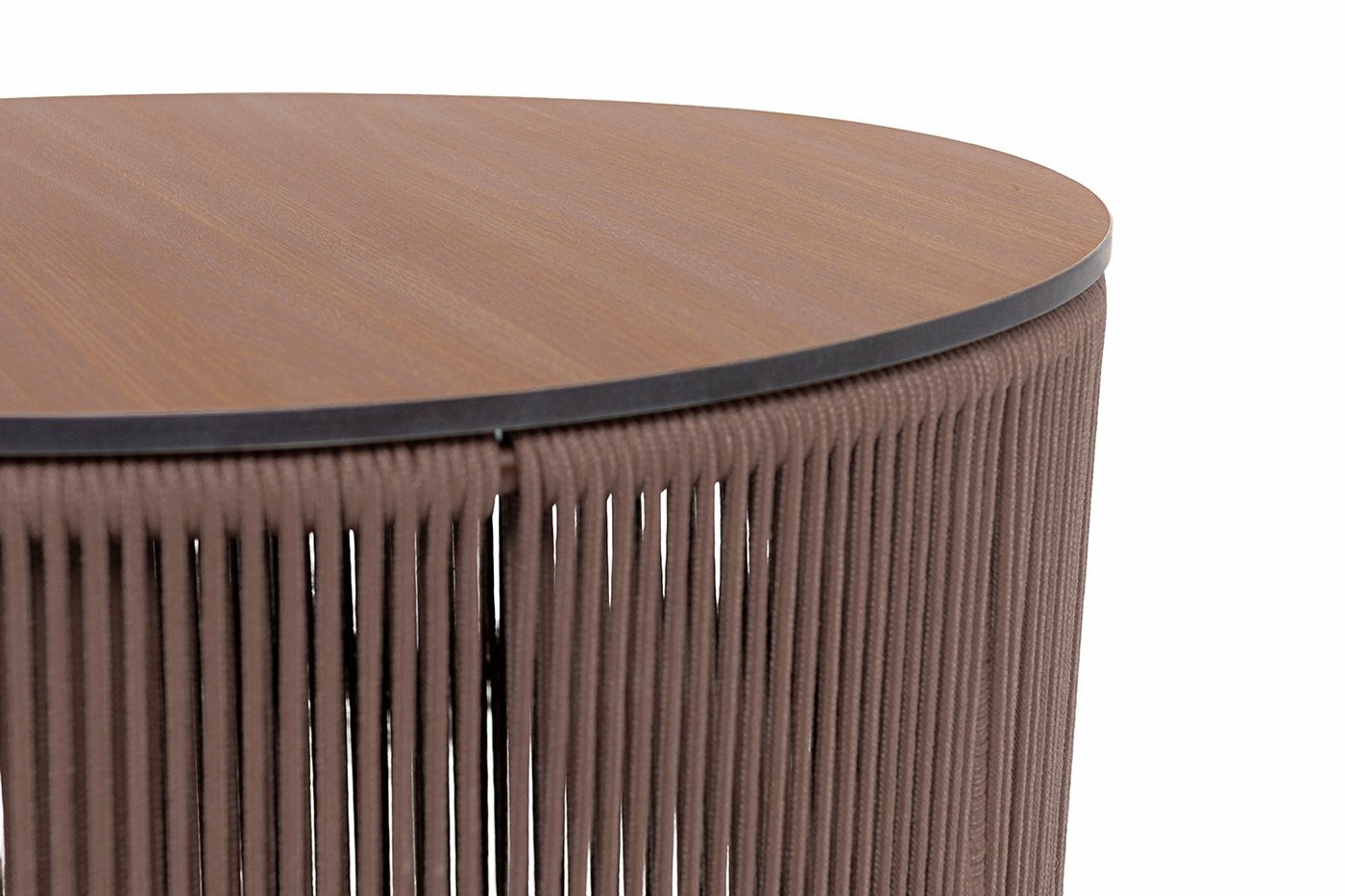 Его алюминиевый каркас в изысканном коричневом оттенке (RAL 8016) гармонично сочетается со столешницей из монолитного компакт‑пластика HPL (12 мм) с текстурой «дуб». Завершающий штрих — декоративная оплётка из коричневого роупа, добавляющая модели яркости и индивидуальности.
