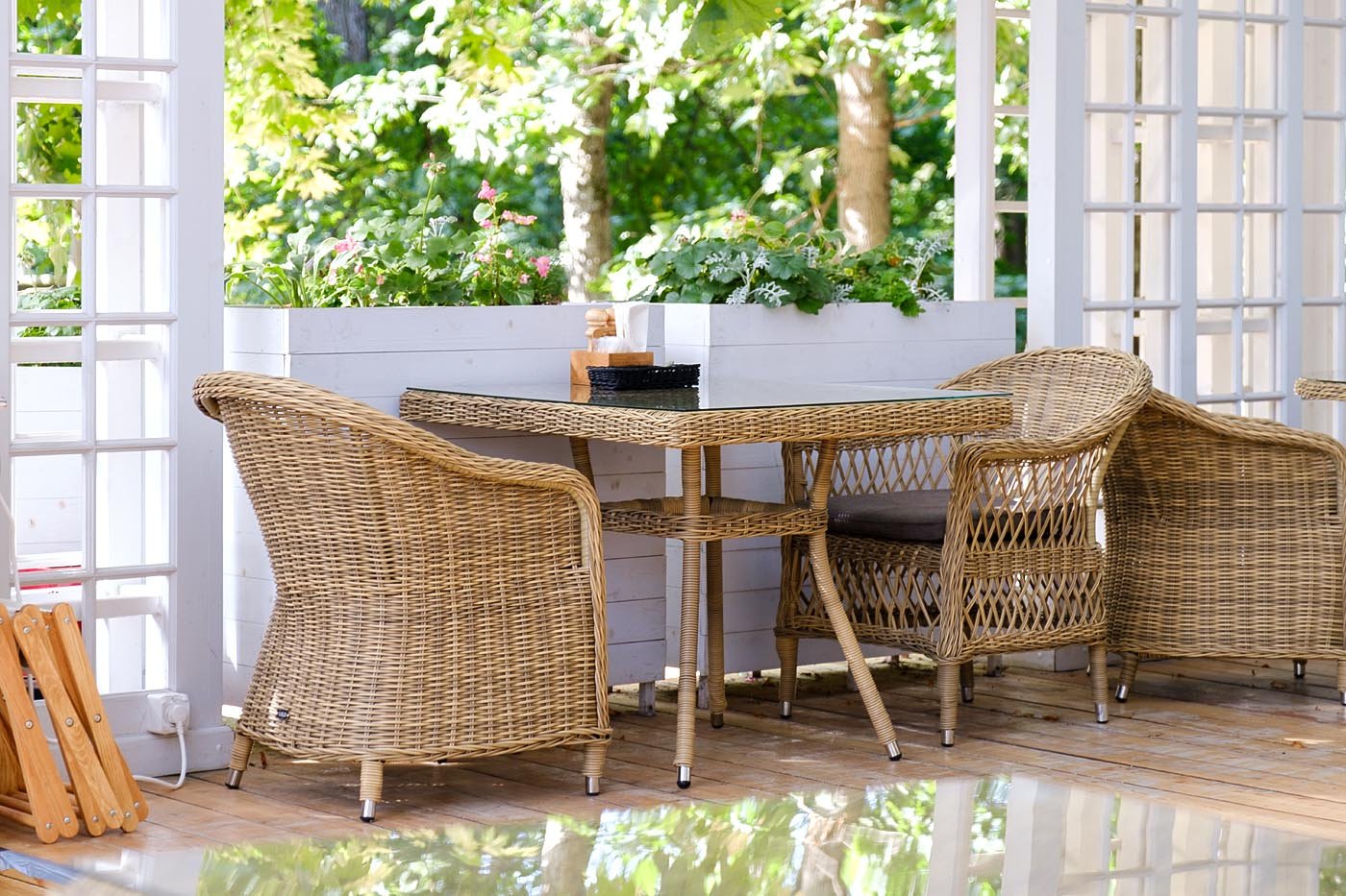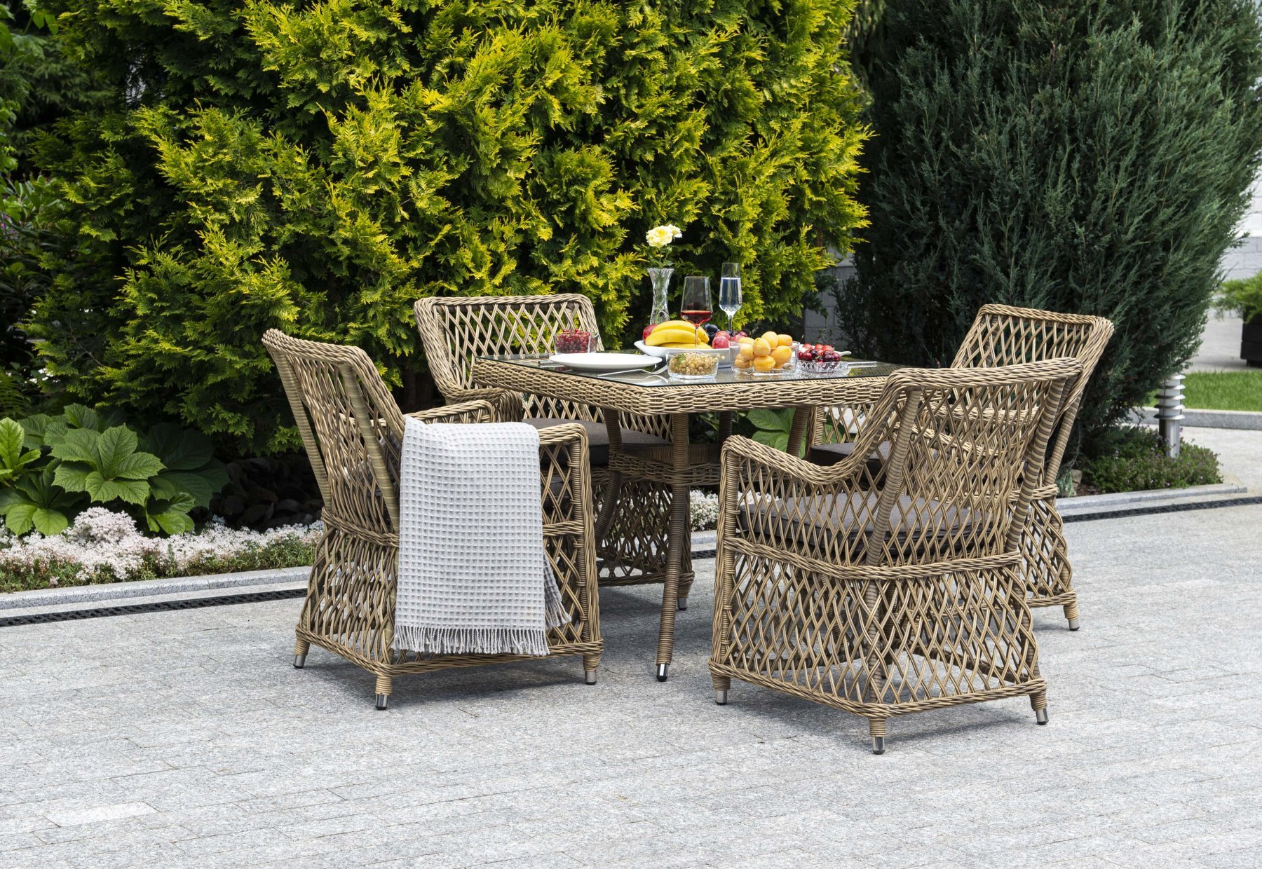 Размер садового стола: 900×900×750 мм. Его можно дополнить креслами «Латте» и создать обеденную группу для компании из 4-х человек.