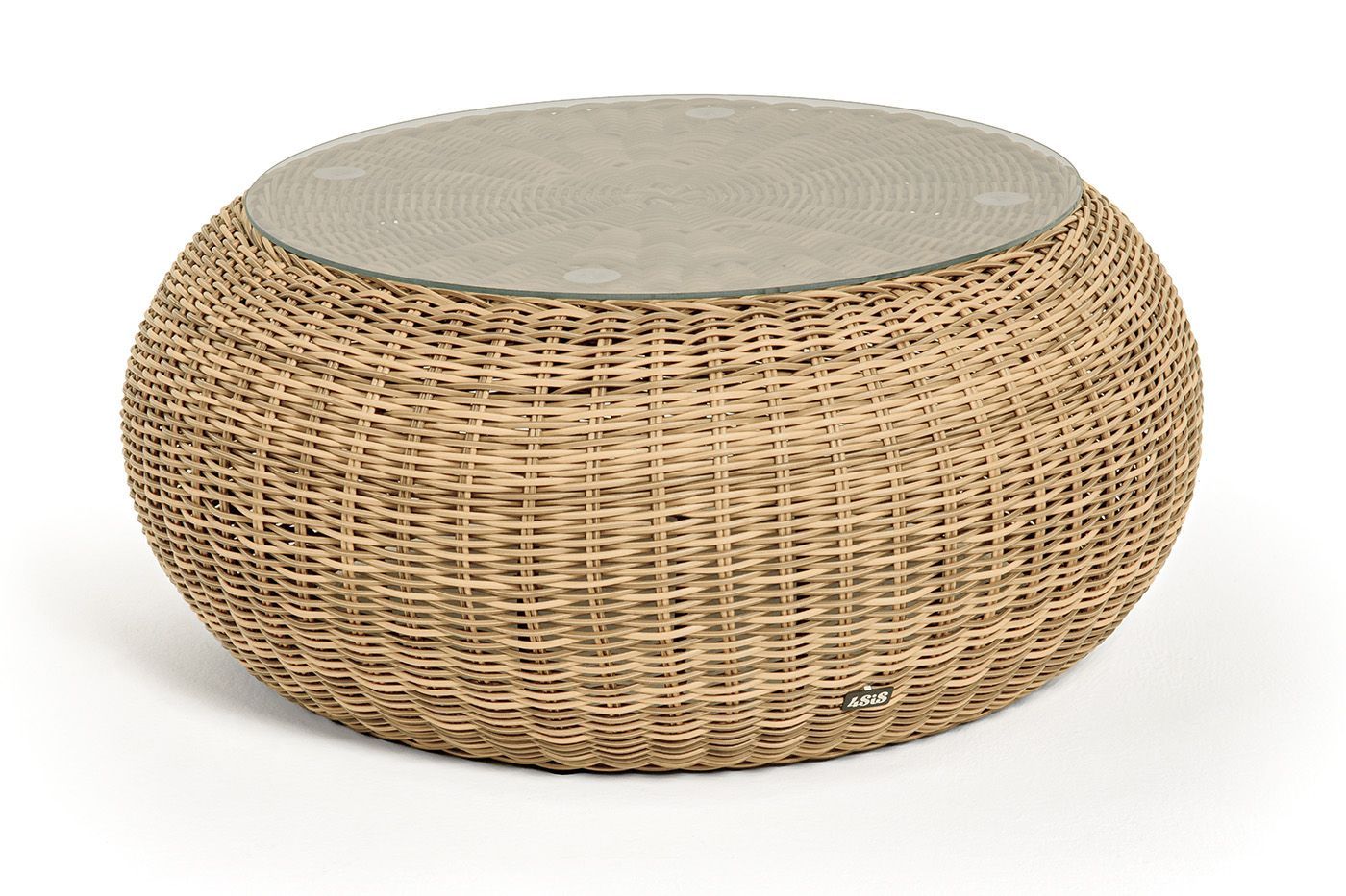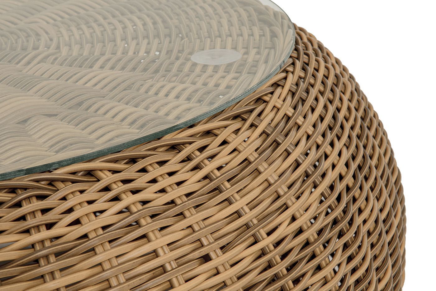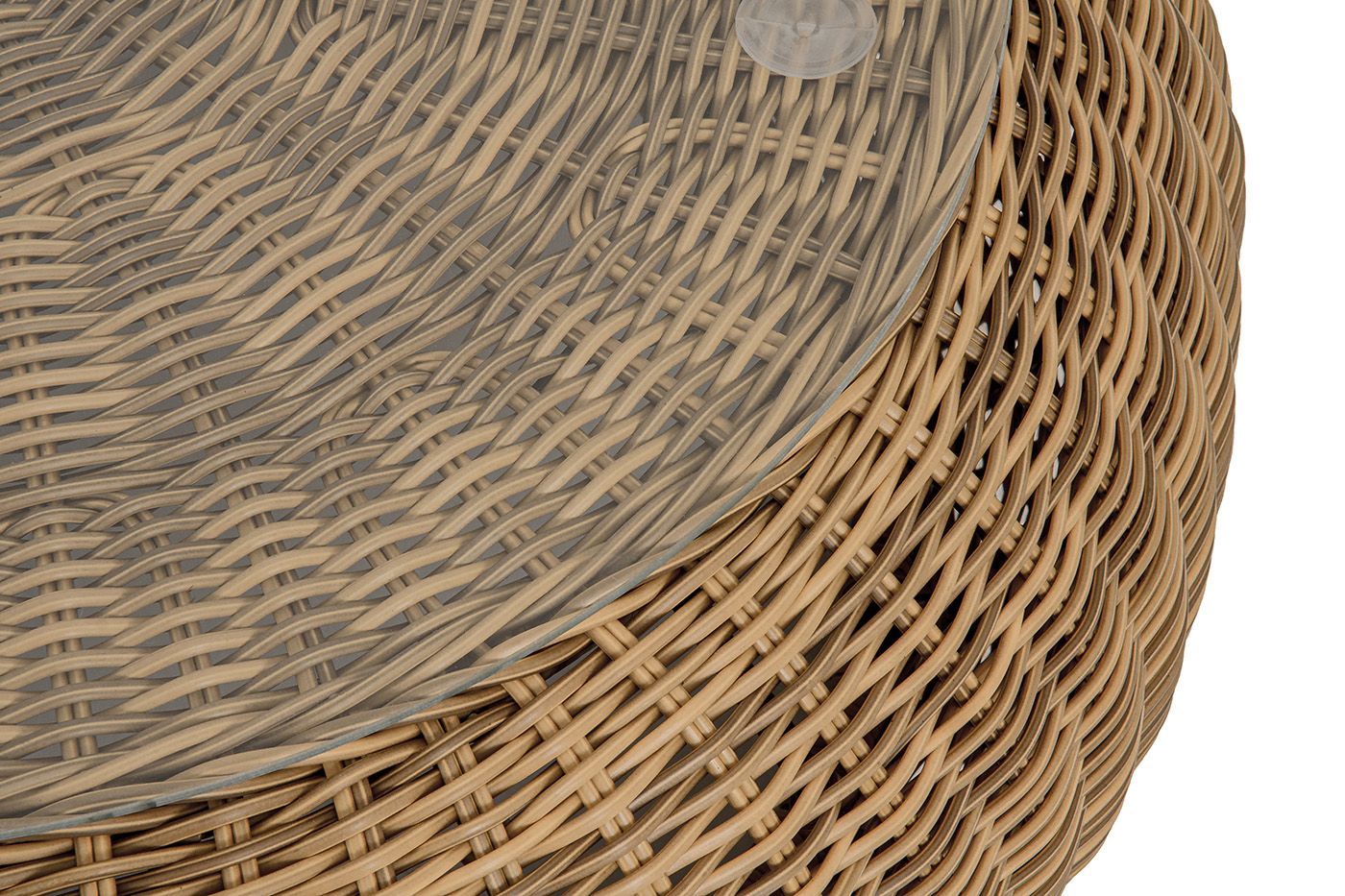 Каркас столика изготовлен из алюминия, вручную оплетенного круглым искусственным ротангом.