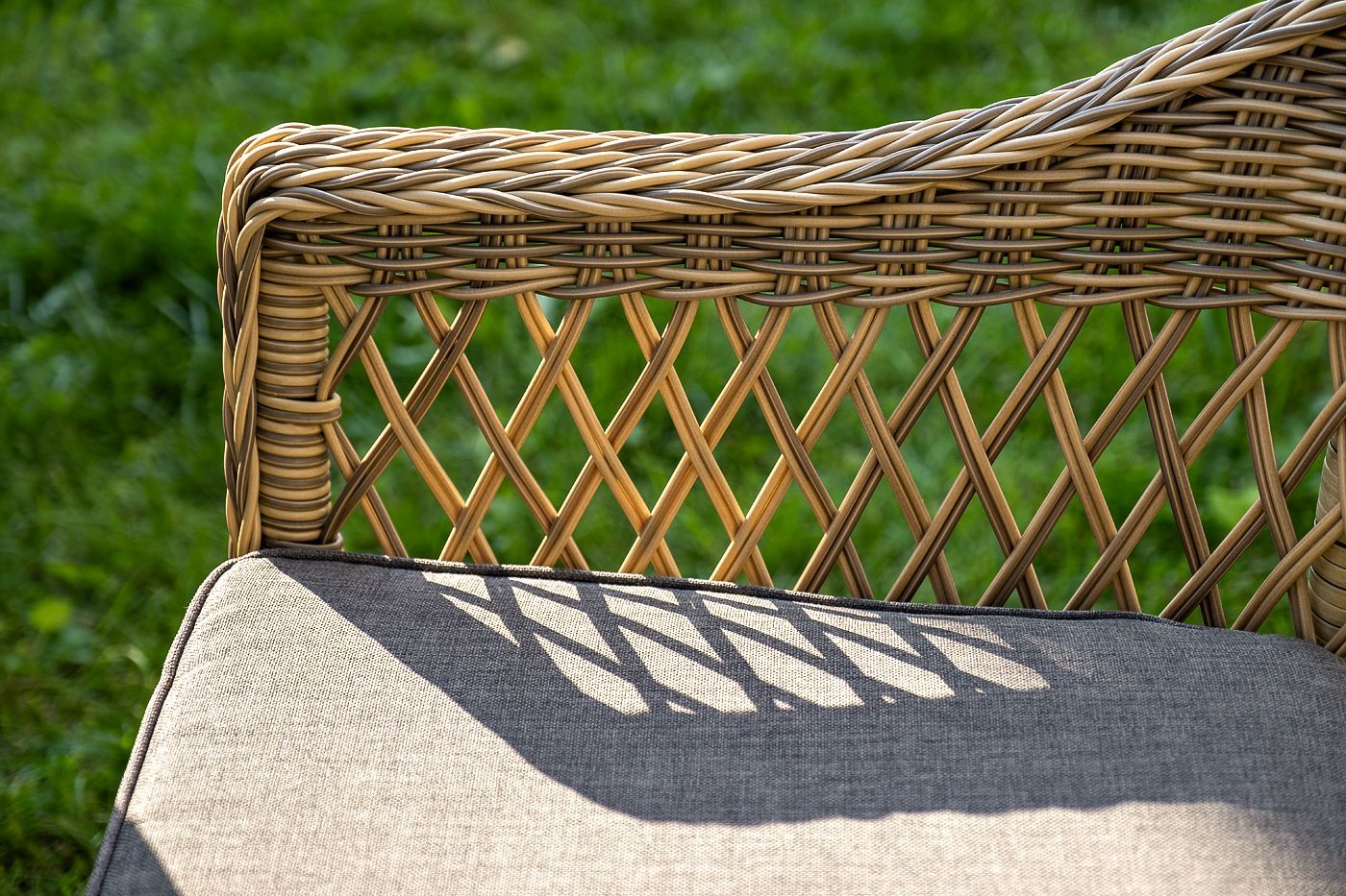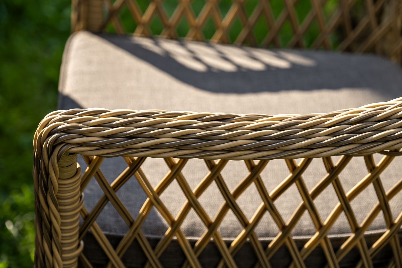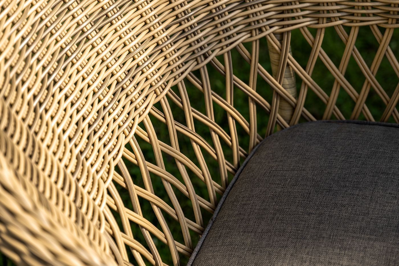 Из алюминия выполнен устойчивый каркас мебели, который задекорирован искусственным ротангом круглого ручного плетения. Комплект представлен в соломенном цвете.