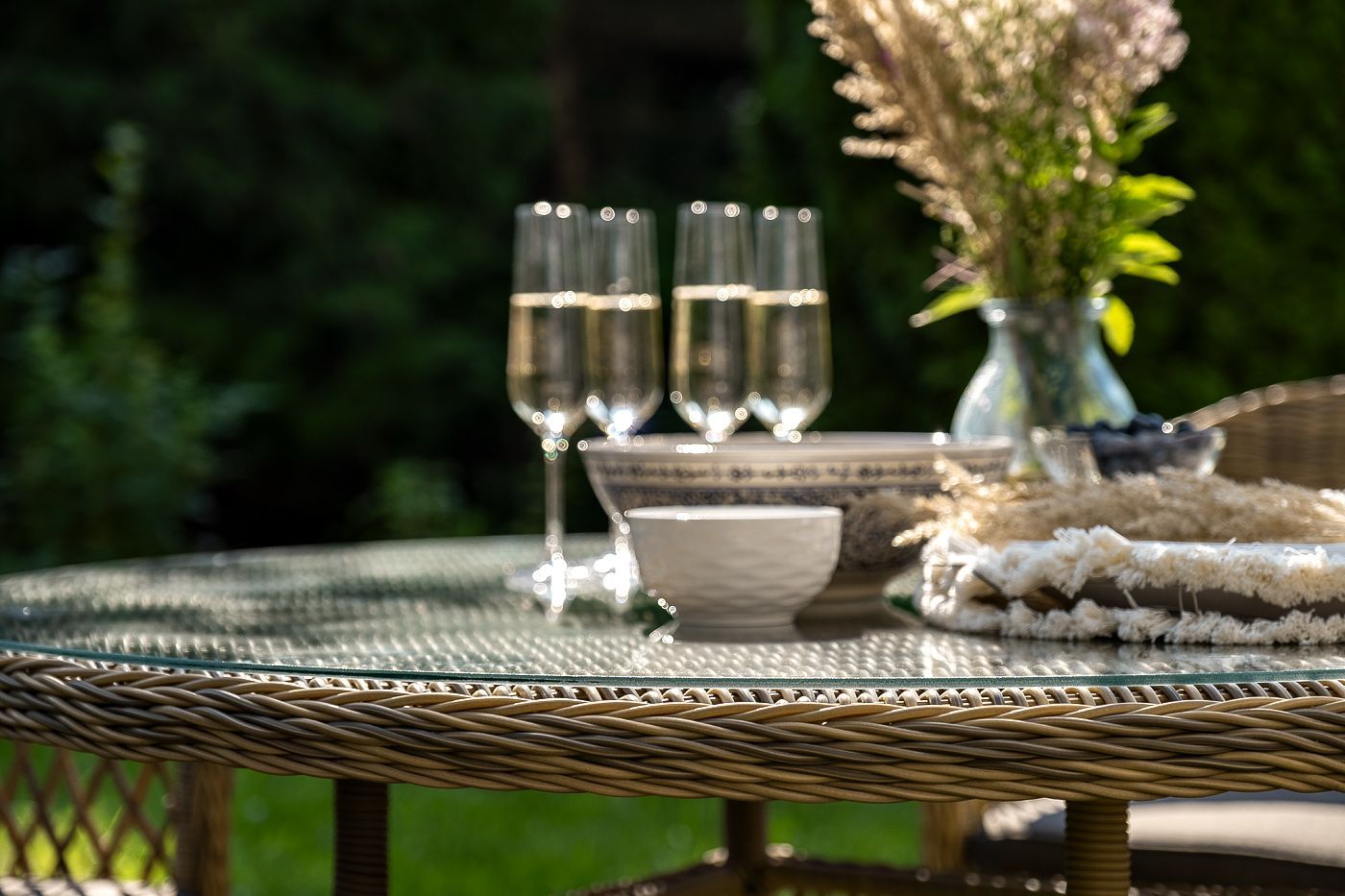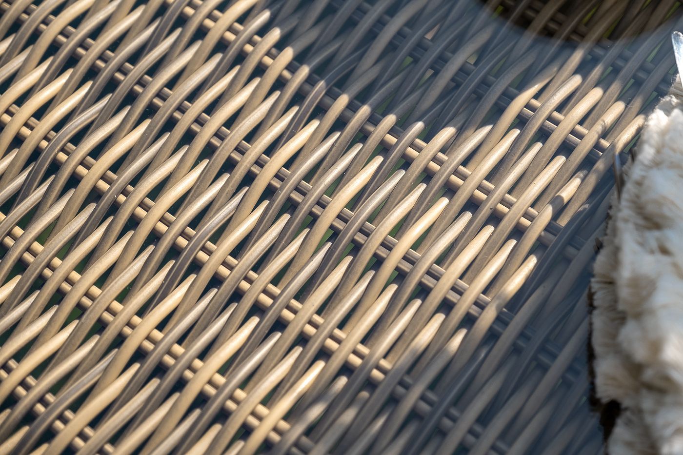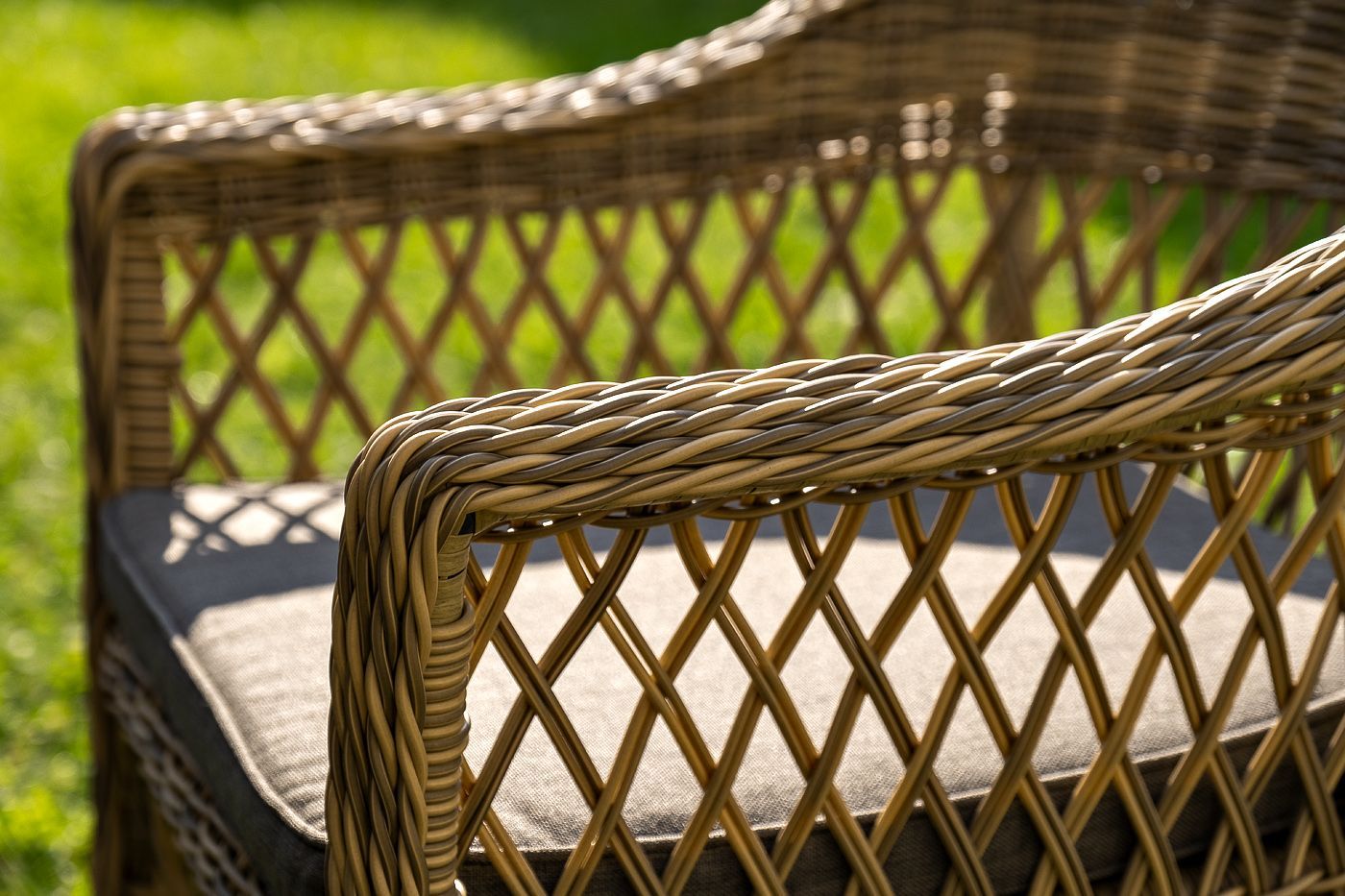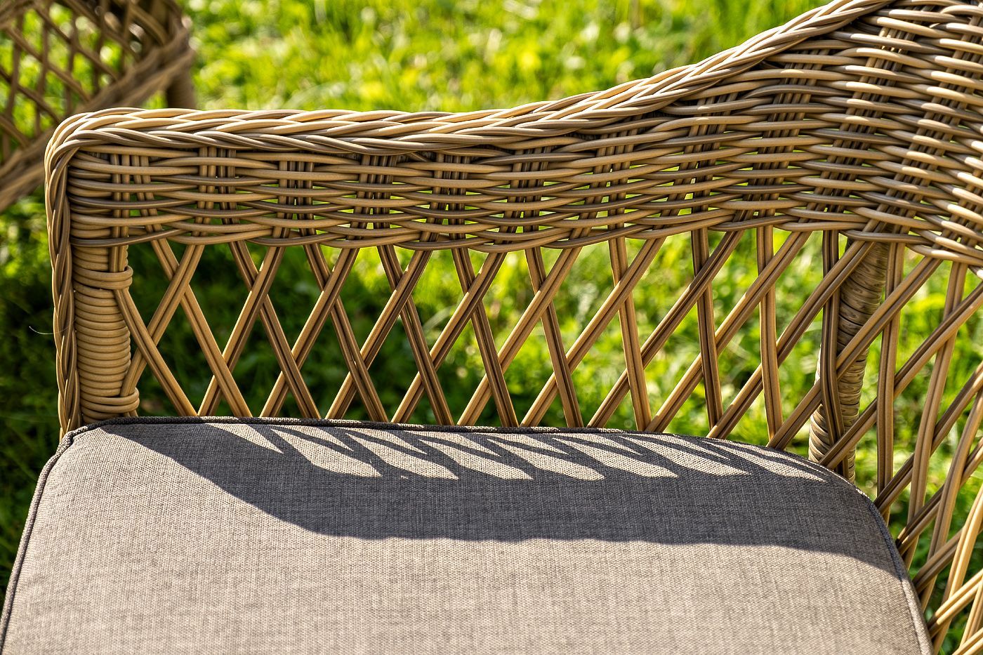 Из алюминия выполнен устойчивый каркас мебели, который задекорирован искусственным ротангом круглого ручного плетения. Комплект представлен в соломенном цвете.