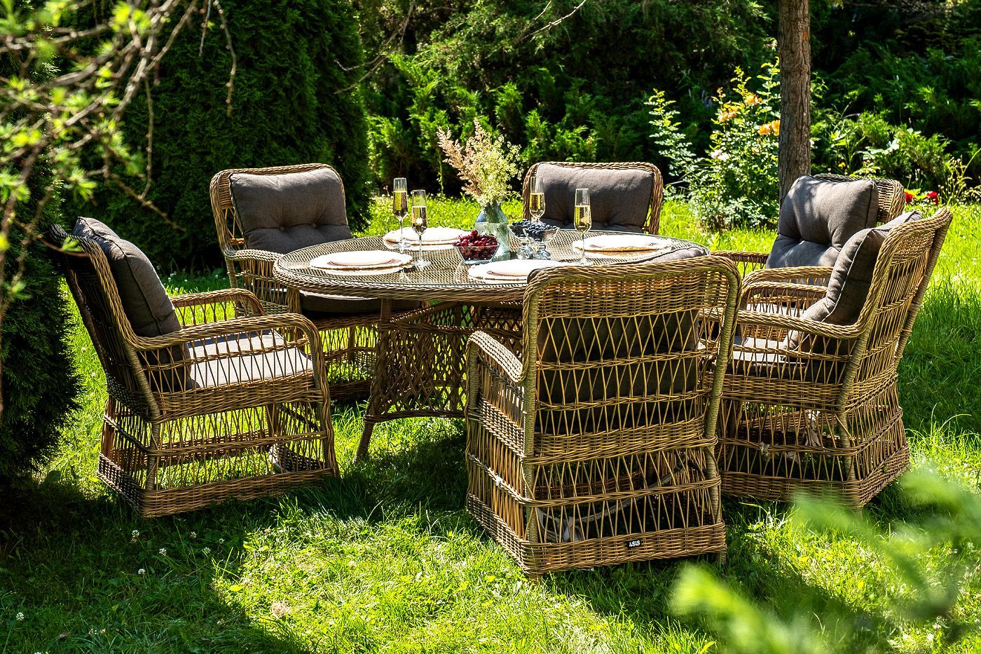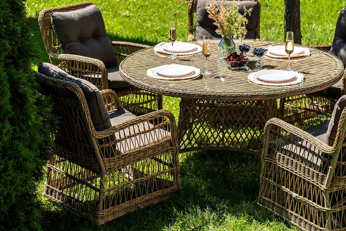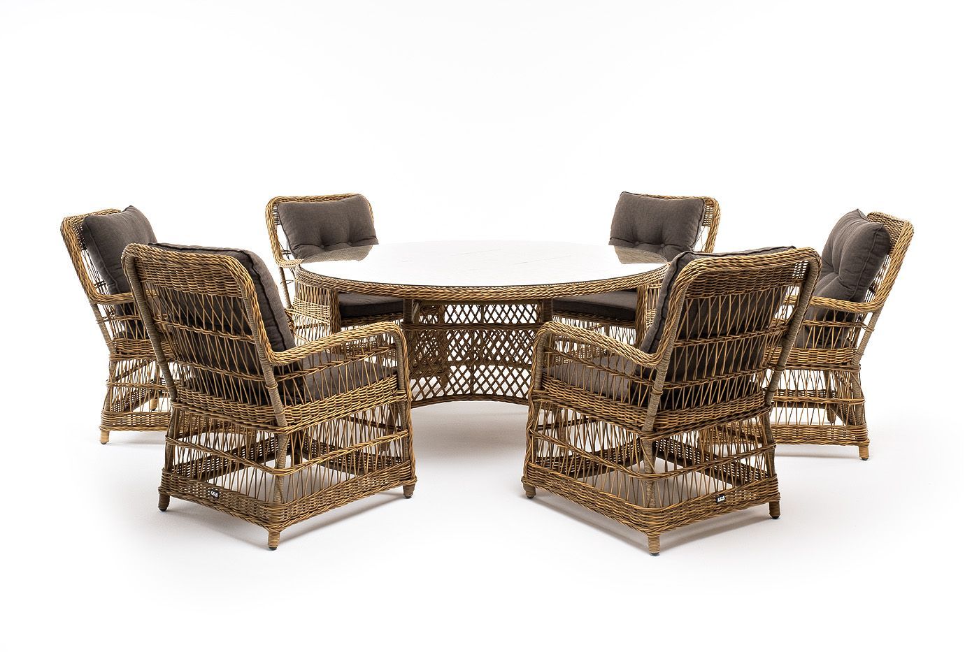 "Эспрессо" плетеный круглый стол, диаметр 150 см, цвет соломенный 1шт. 1 500Х1 500Х750, "Цесена" кресло плетеное из искусственного ротанга, цвет соломенный 6шт. 600Х800Х910,