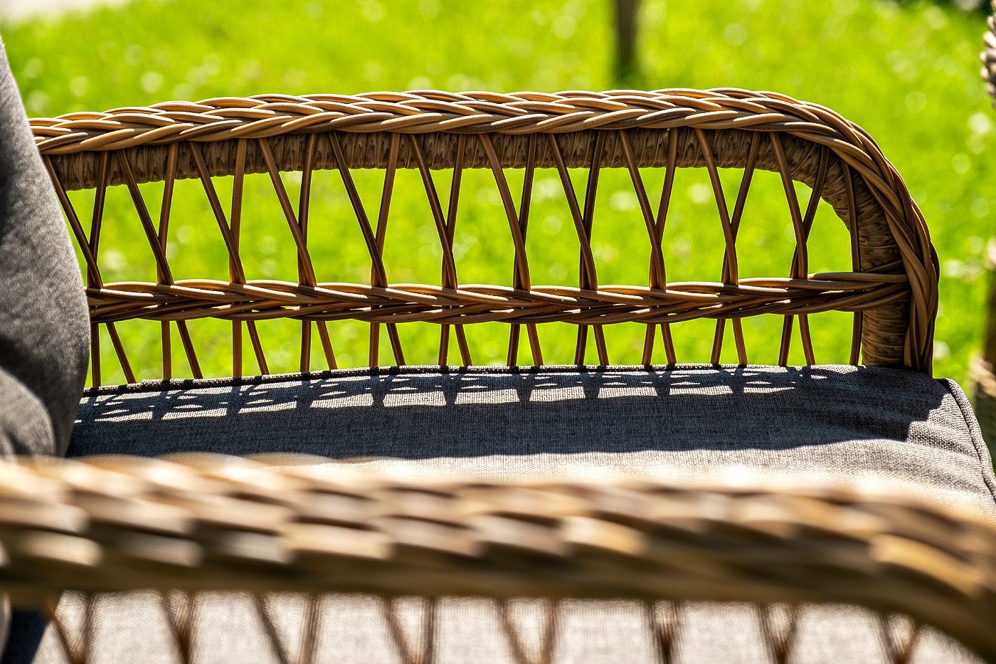 Вся мебель изготовлена из долговечного и легкого алюминия, обтянутого синтетическим ротангом. На столе для удобства эксплуатации предусмотрена столешница из ударопрочного закаленного стекла 5 мм. Стулья укомплектованы подушками на сидениях и на спинках.
