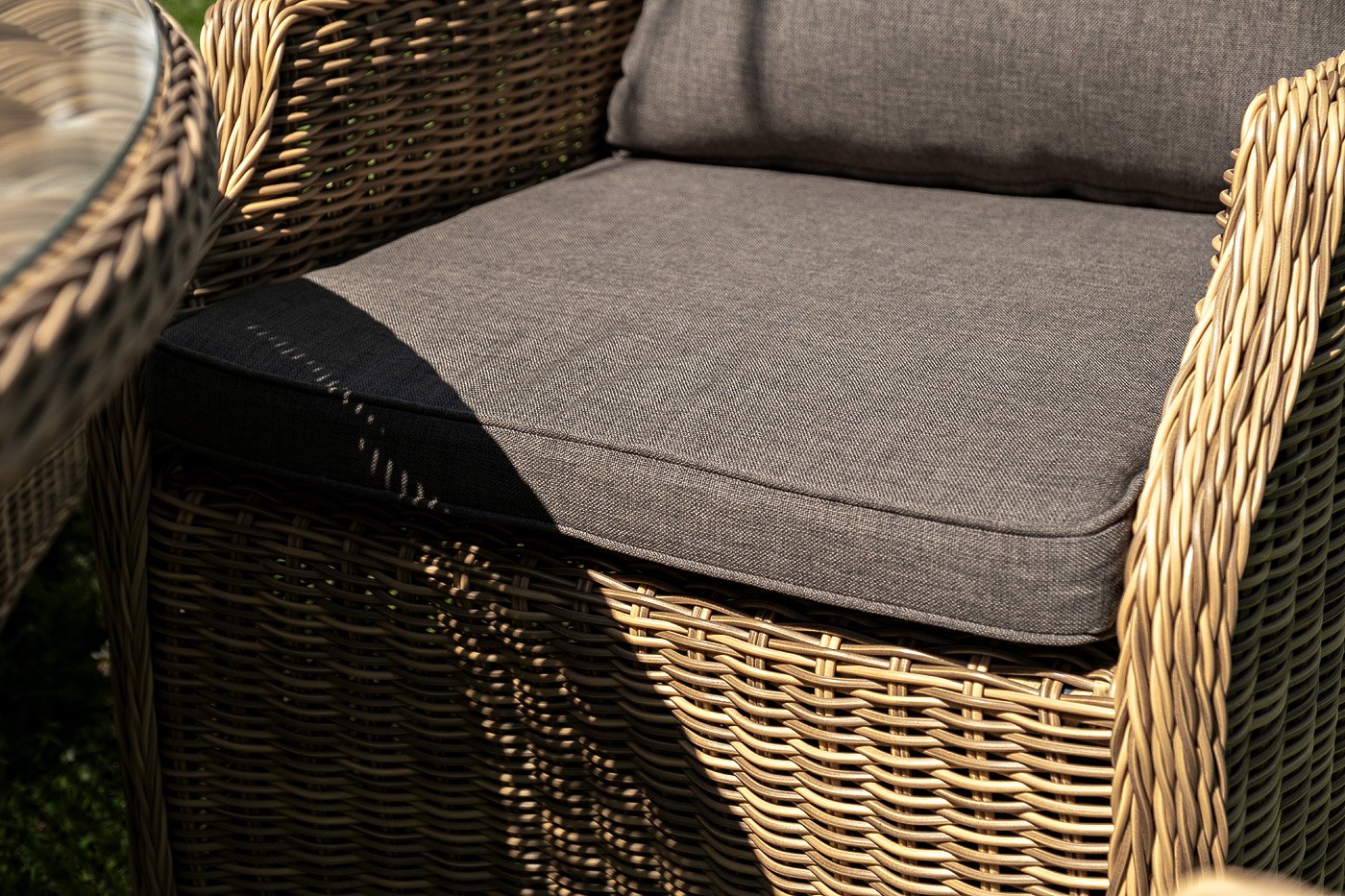 Вся мебель изготовлена из долговечного и легкого алюминия, обтянутого синтетическим ротангом. На столе для удобства эксплуатации предусмотрена столешница из ударопрочного закаленного стекла 5 мм. Стулья укомплектованы подушками на сидениях и на спинках.
