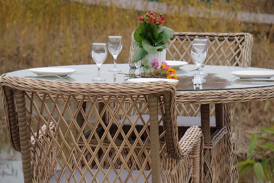 Столешница покрыта прочным стеклом, толщиной 5 мм. Благодаря высокопрочным материалам, обеденный стол очень практичный и подходит для всесезонного использования даже на улице.