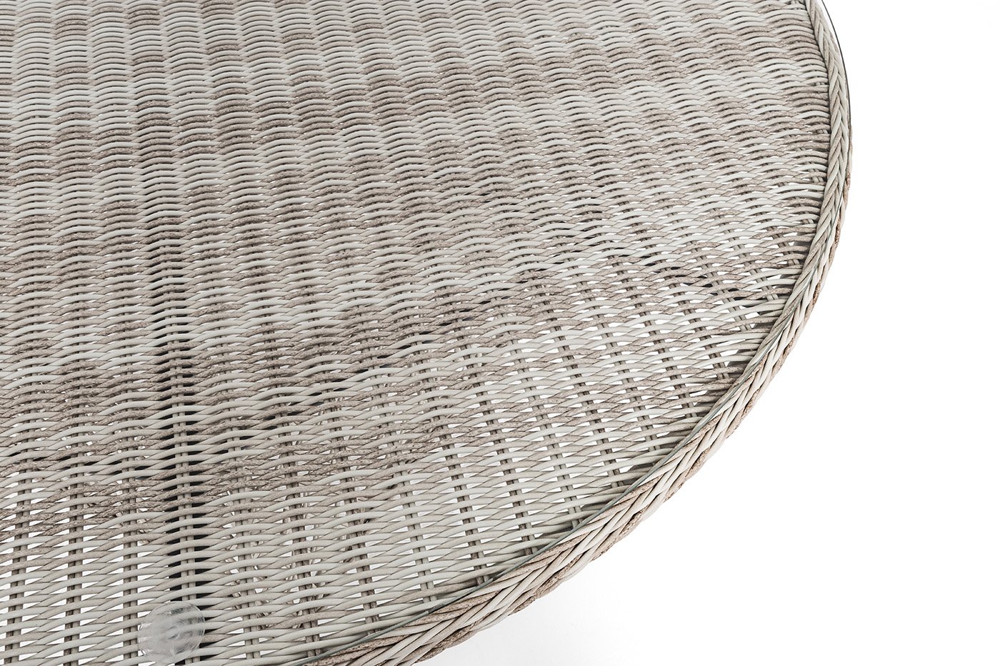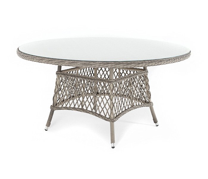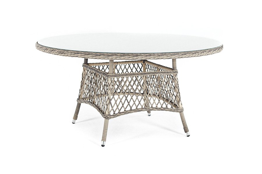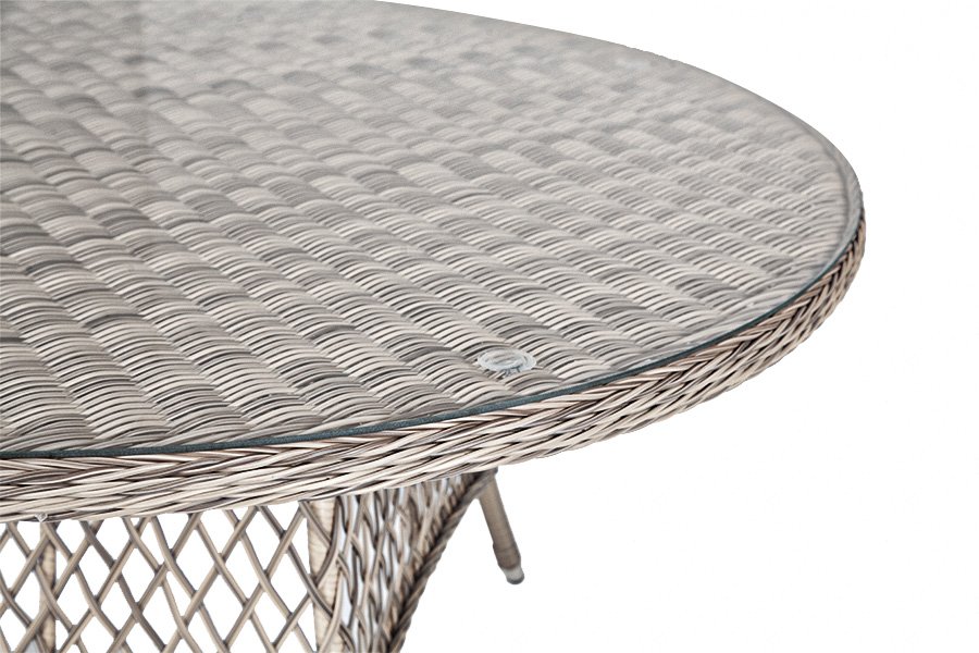 В качестве основания выступает каркас, выполненный из алюминия и оплетён круглым искусственным ротангом бежевого цвета. Рабочую плоскость покрывает 5 мм столешница из ударопрочного закаленного стекла.