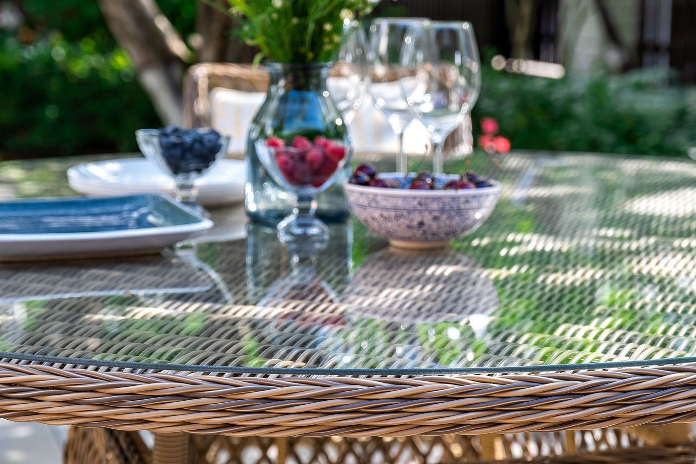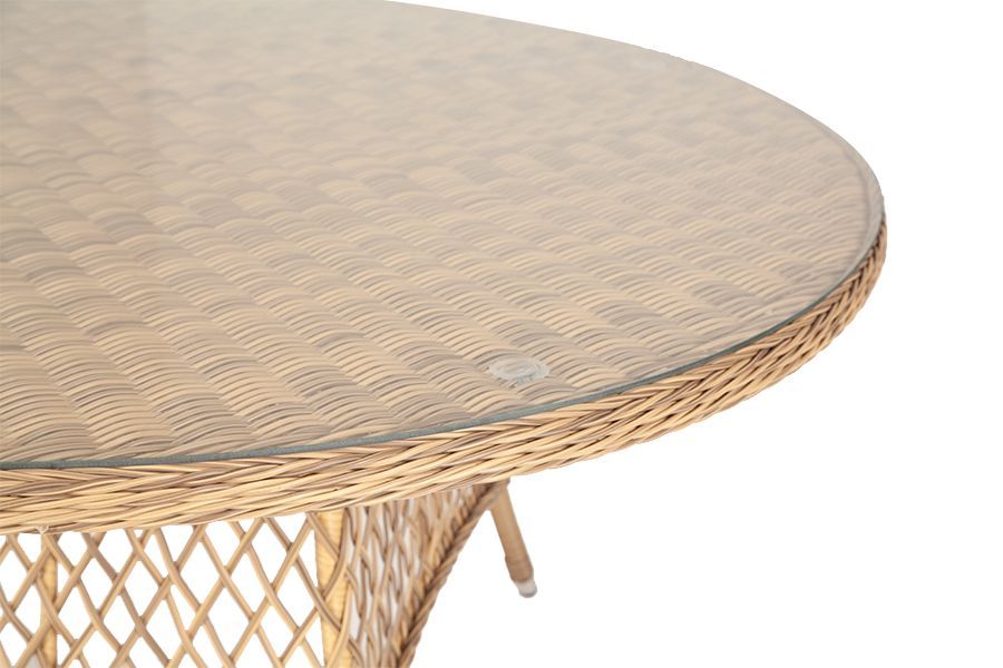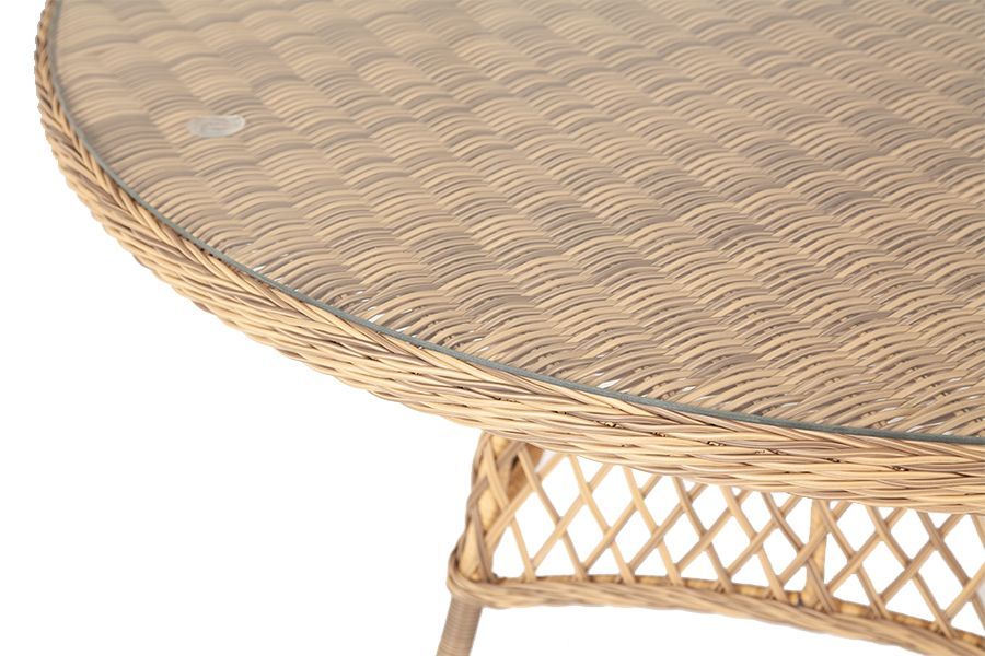 В качестве основания выступает каркас, выполненный из алюминия и оплетён круглым искусственным ротангом соломенного цвета. Рабочую плоскость покрывает 5 мм столешница из ударопрочного закаленного стекла.