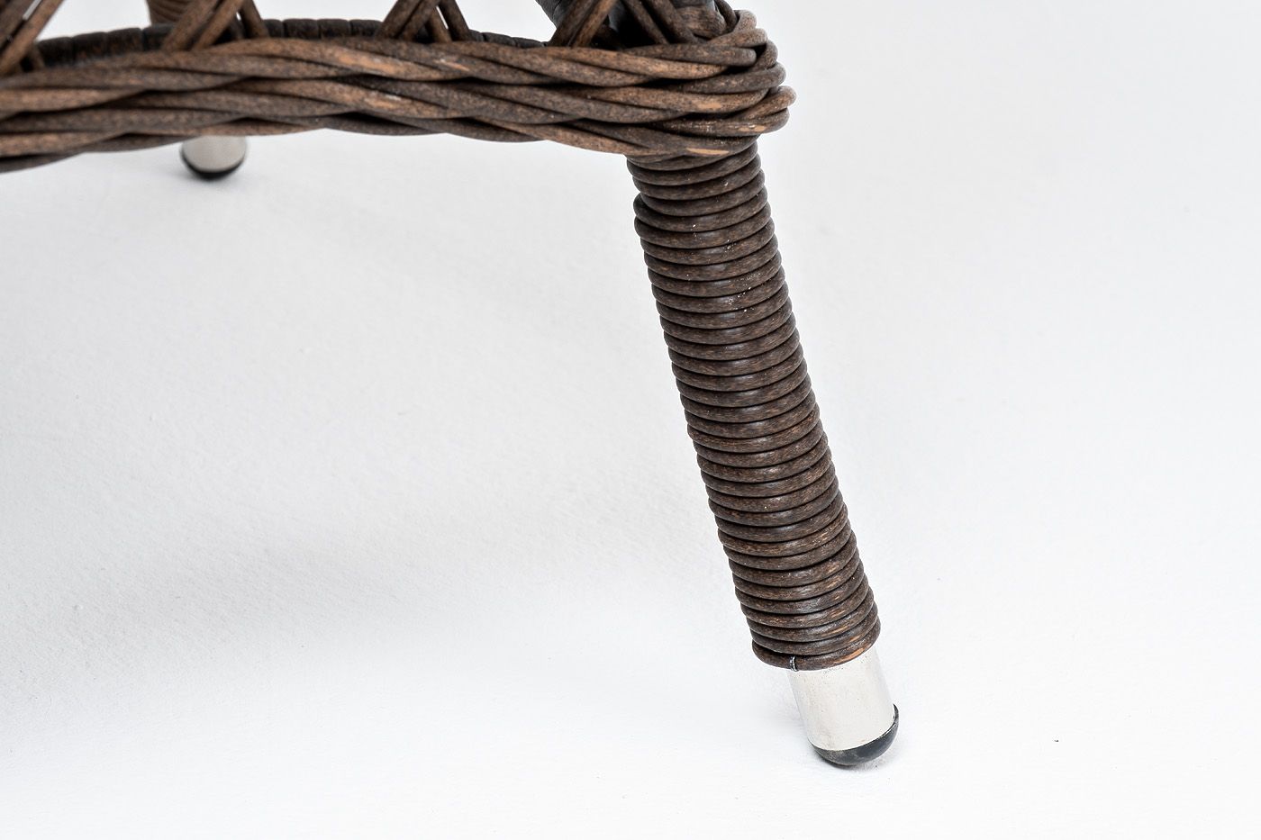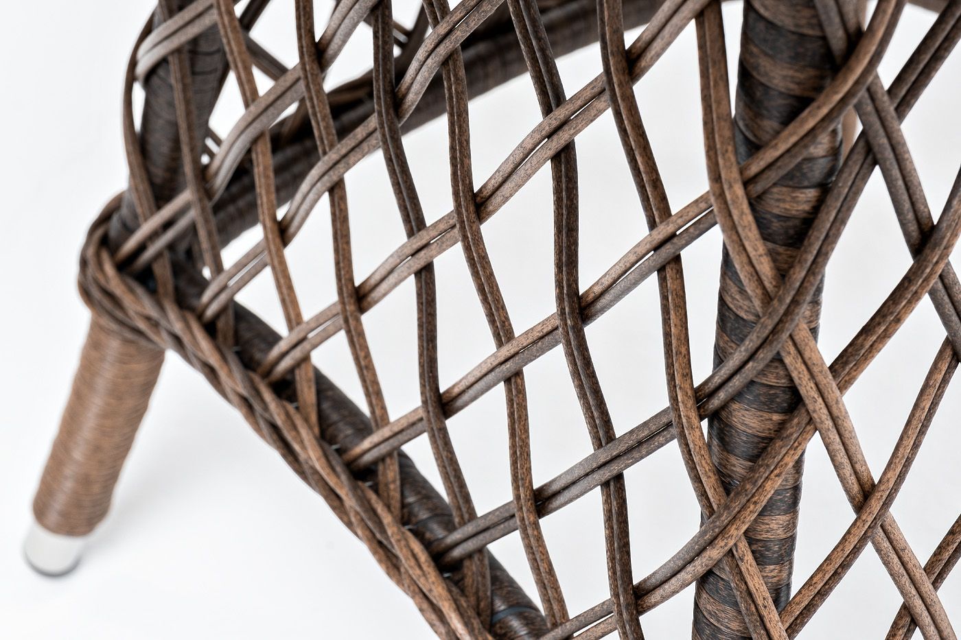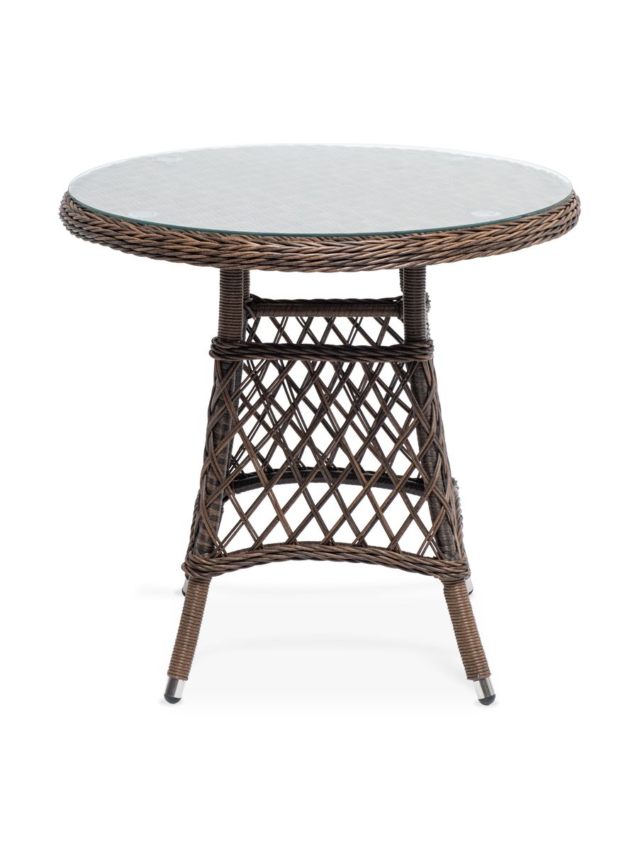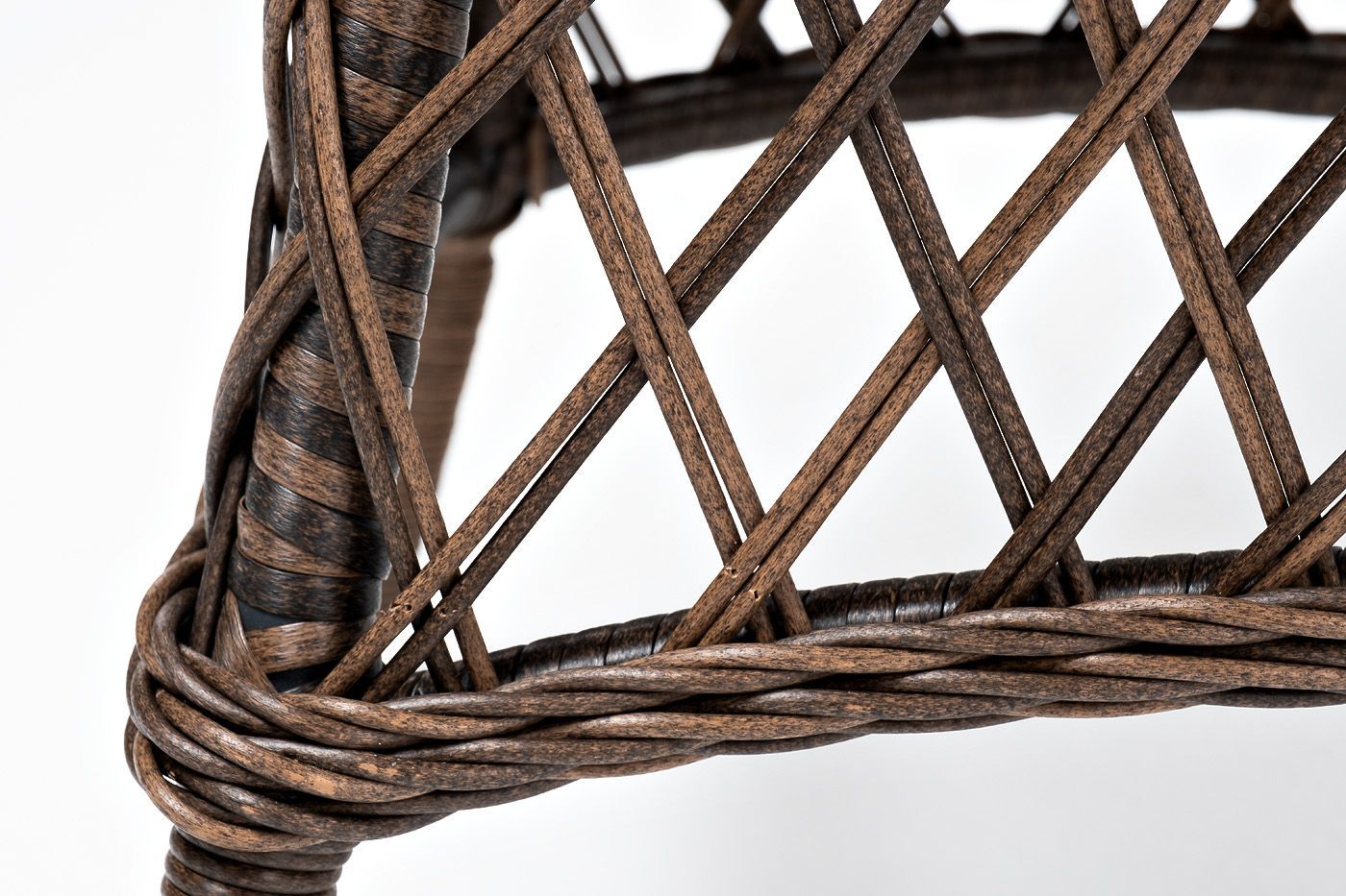 Каркас стола изготовлено из алюминия, благодаря чему его легко перемещать. Металл оплетен синтетическим ротангом круглого ручного плетения насыщенного шоколадного оттенка. Столешница – стекло, устойчивое к механическим повреждениям и высоким температурам.