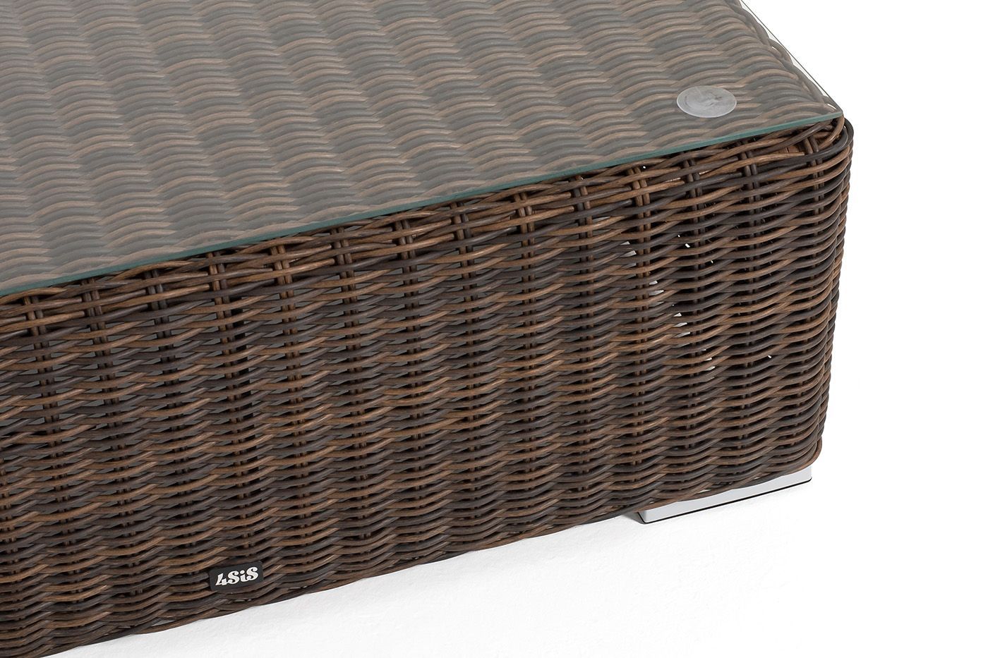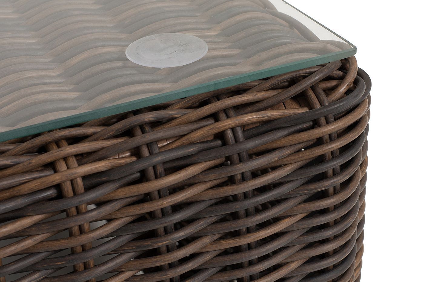 Размер модели – 950×950×350 мм. Ее каркас сделан из высокопрочного алюминия, который оплетен искусственным ротангом с помощью ручного круглого плетения. Столик представлен в коричневом цвете.