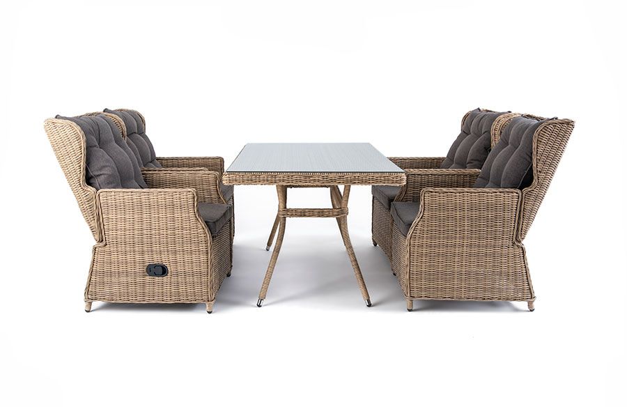 Обеденная группа из искусственного ротанга: 4 раскладывающихся кресла и обеденный стол со стеклянной столешницей.
