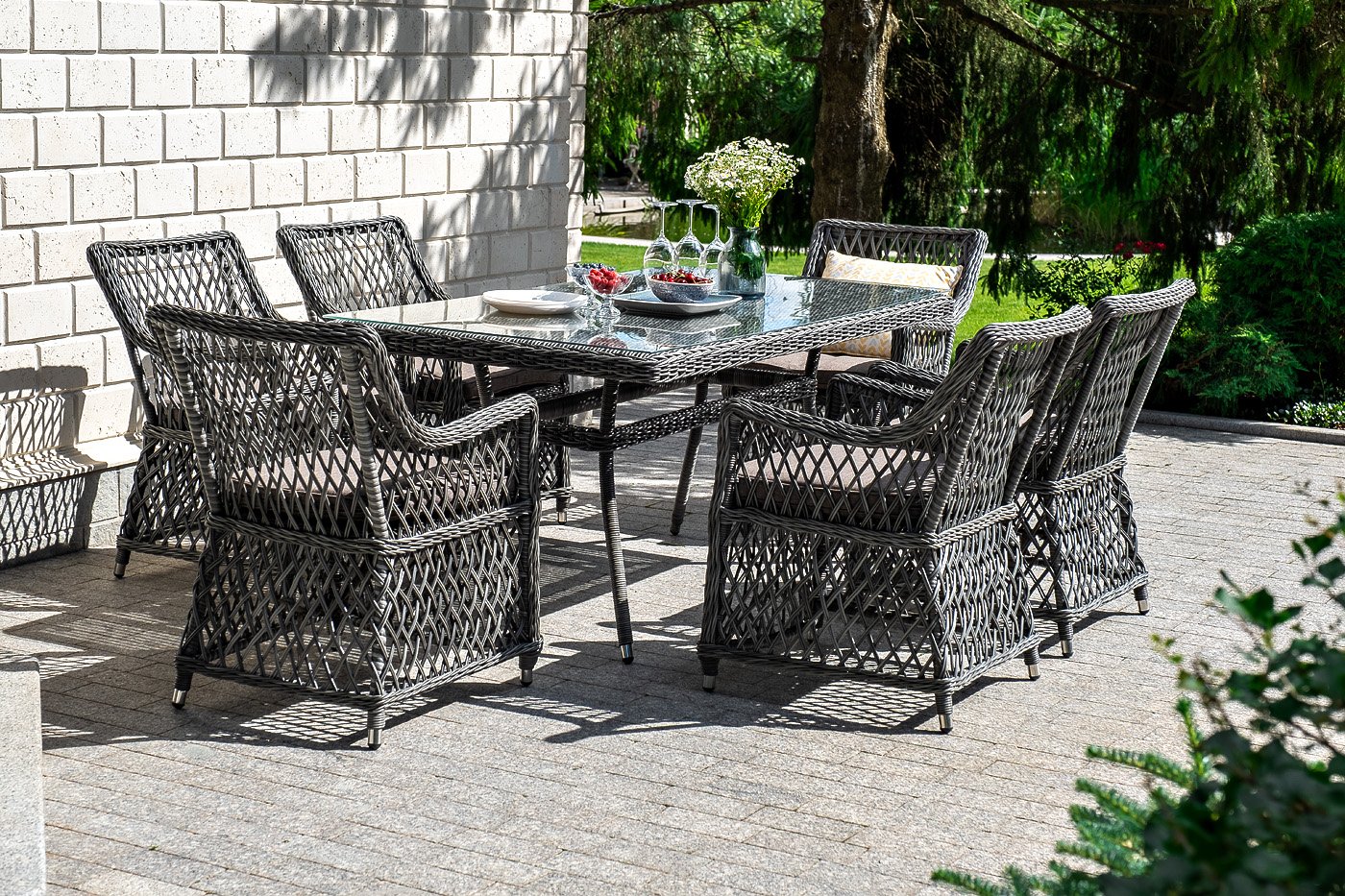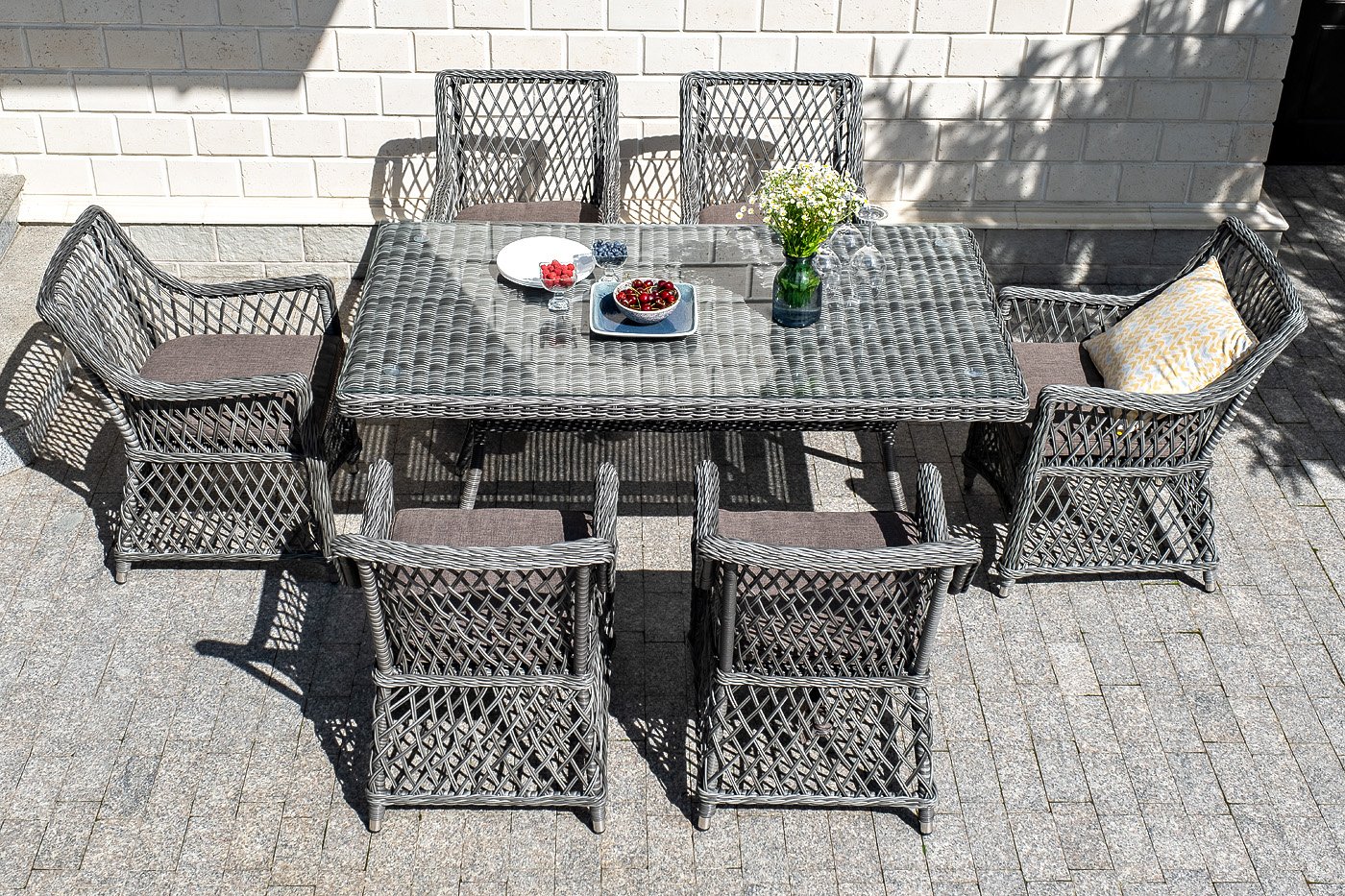 Кресла предполагают подушки со съёмными влагоотталкивающими чехлами в комплекте. "Латте" плетеный стол из искусственного ротанга 160х90см, цвет графит 1шт. 1 600Х900Х750, "Латте" плетеное кресло из искусственного ротанга, цвет графит 6шт. 550Х660Х850,