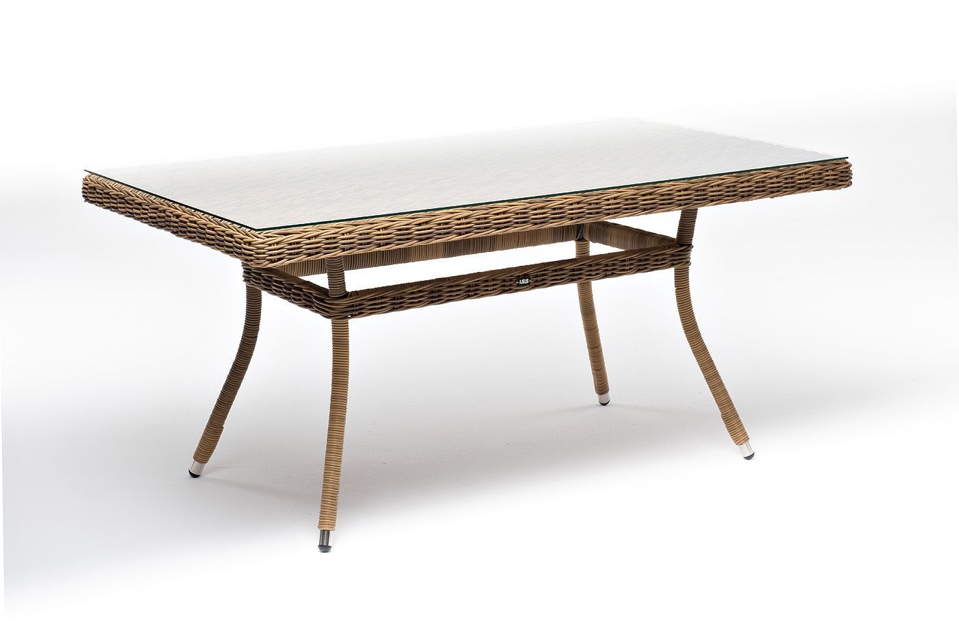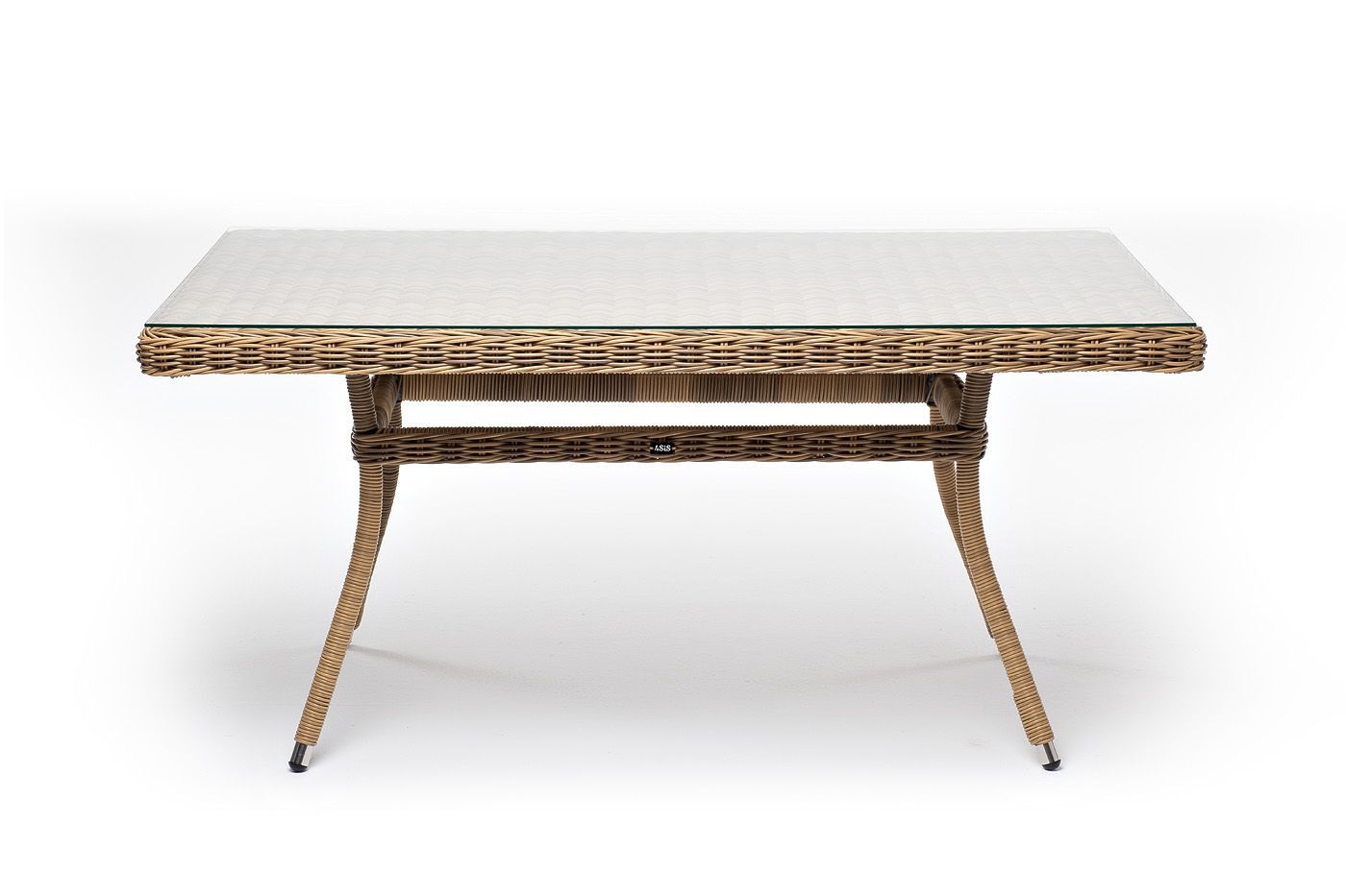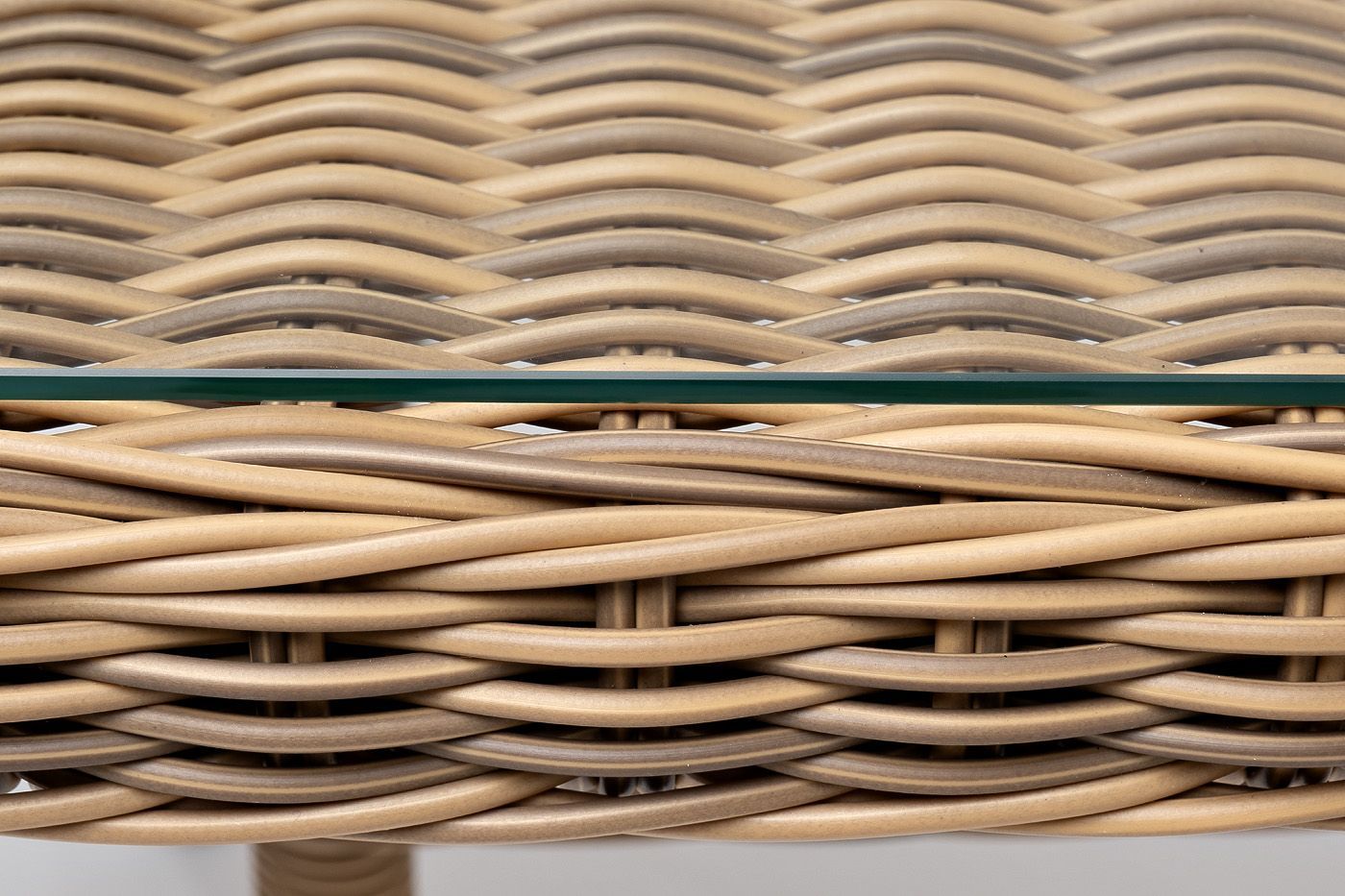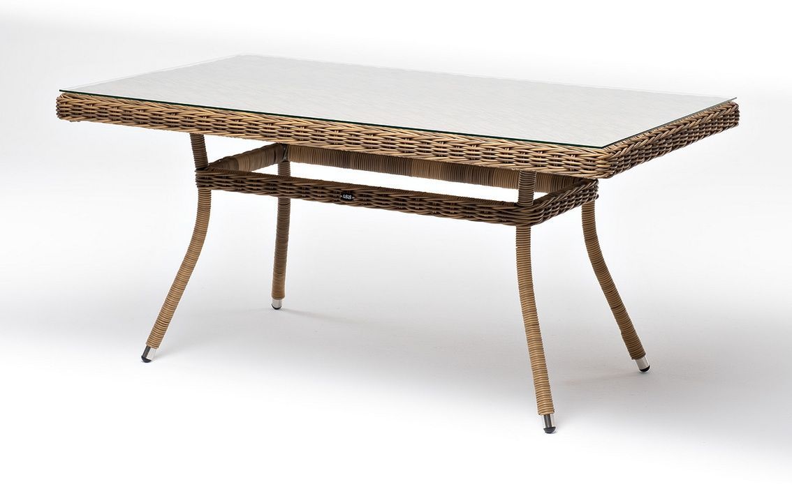 Каркас произведен из прочного алюминия, оплетка которого, выполнена вручную ротангом соломенного цвета. Поверхность защищает стеклянная столешница, толщиной 5 мм.