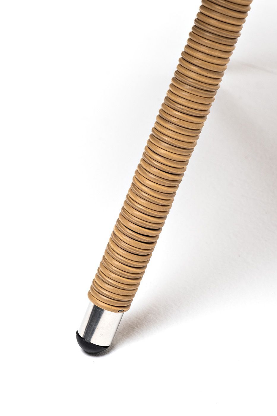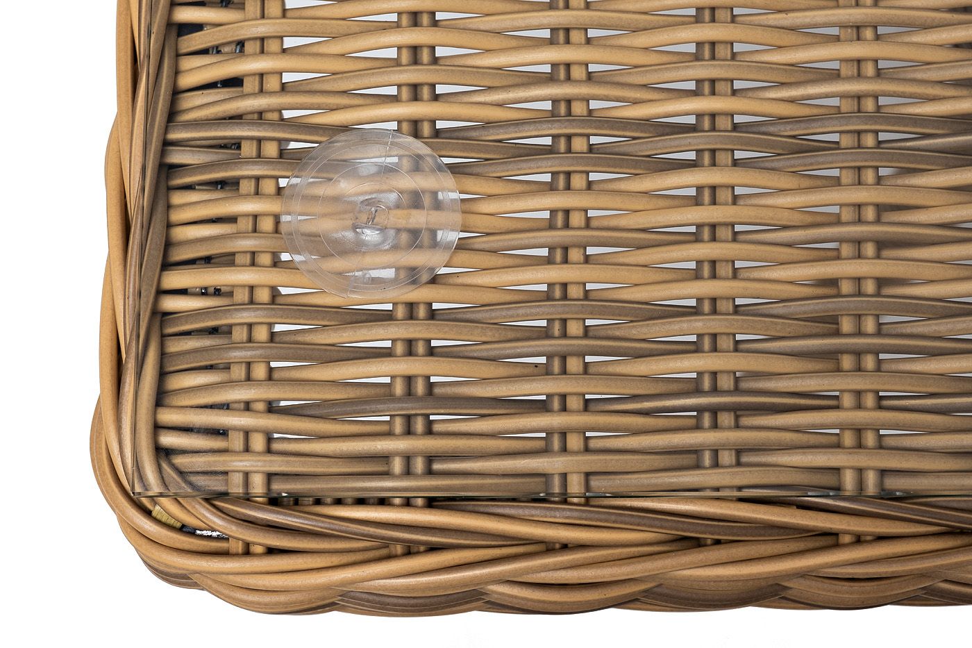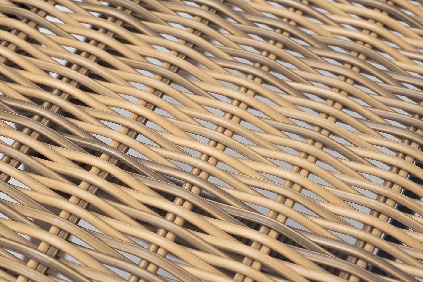 Каркас произведен из прочного алюминия, оплетка которого, выполнена вручную ротангом соломенного цвета. Поверхность защищает стеклянная столешница, толщиной 5 мм.