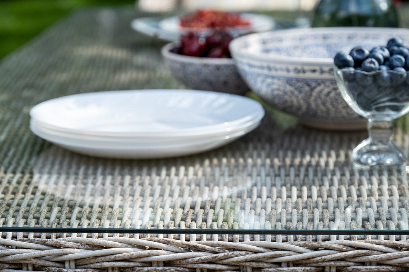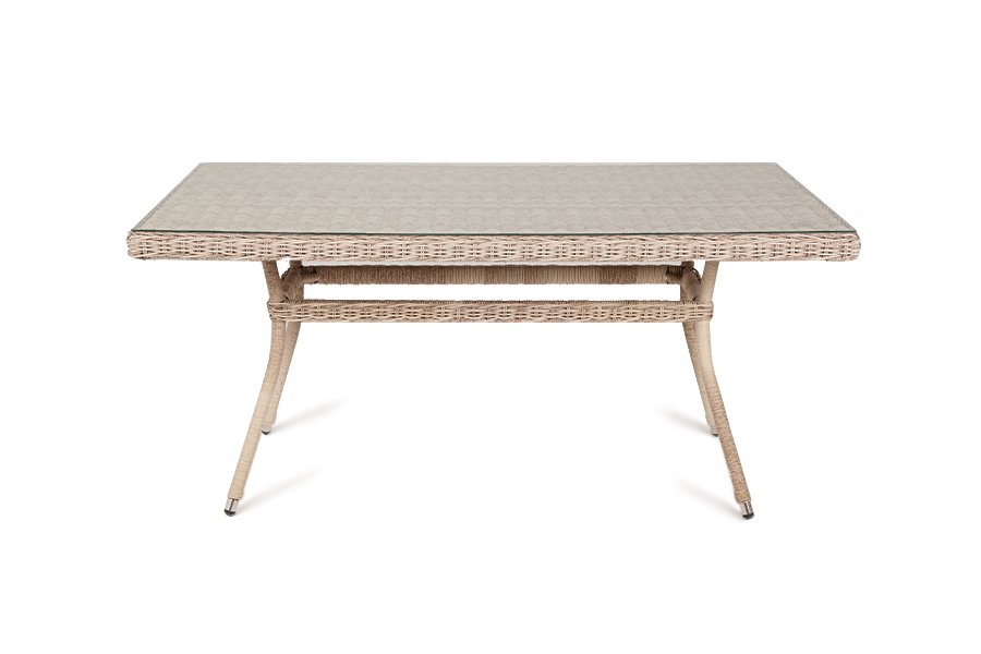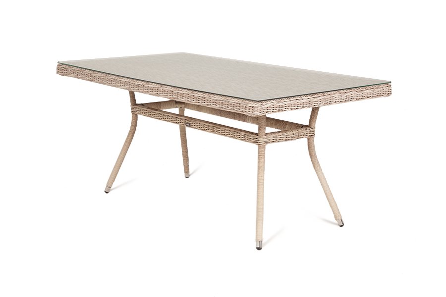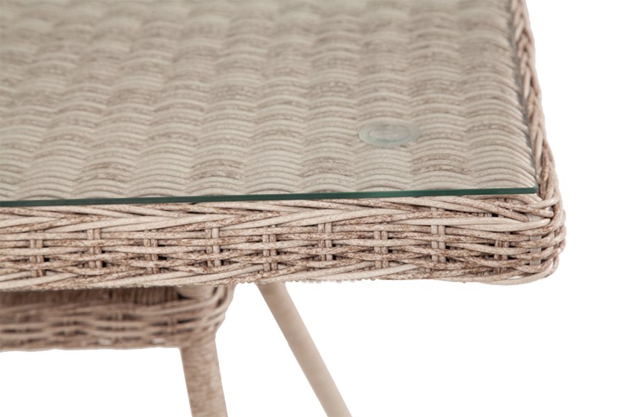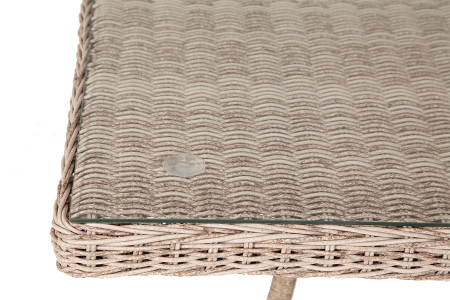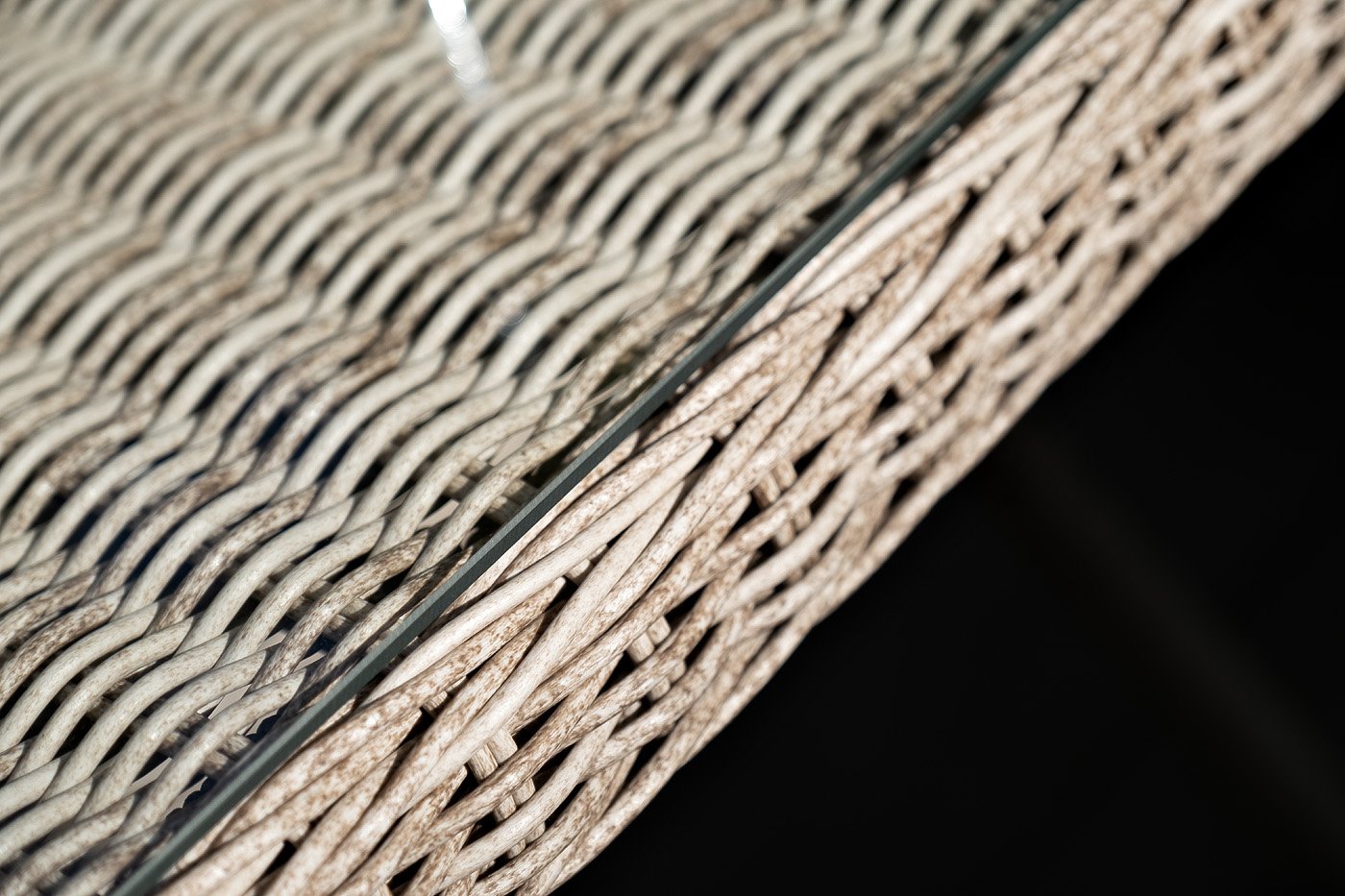 Каркас изготовлен из прочного и легкого алюминия, оплетенного с помощью ручного метода искусственным ротангом бежевого оттенка.