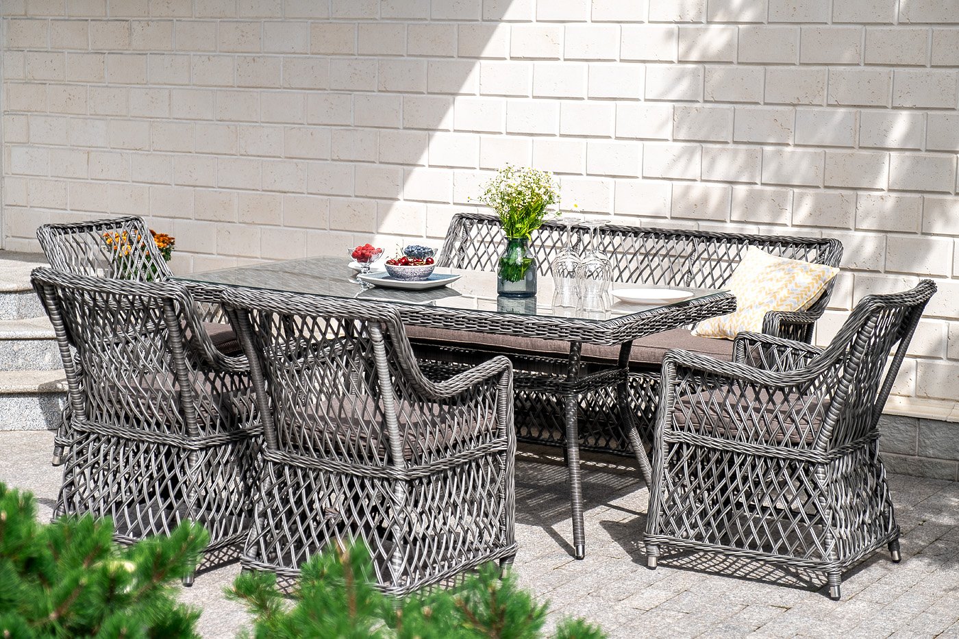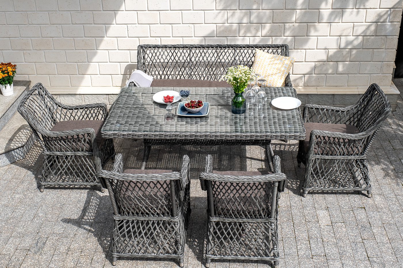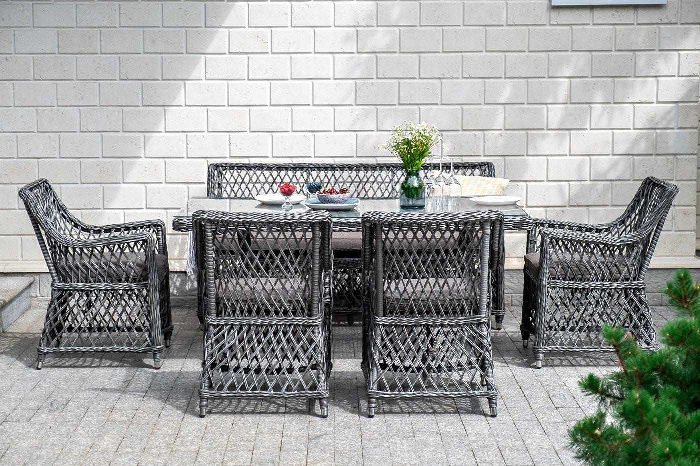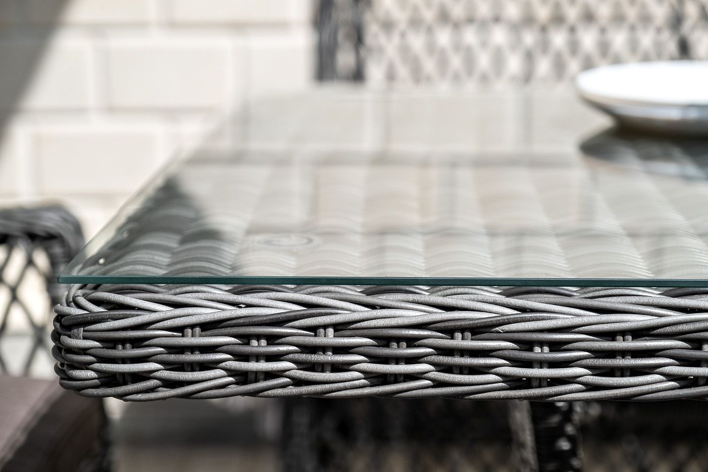 Предусматривает размещение 6 персон. Каркас выполнен из алюминия, а его оплетка произведена вручную круглым ротангом графитового цвета. Безопасность рабочей поверхности обеспечивает стеклянная столешница толщиной 5 мм.