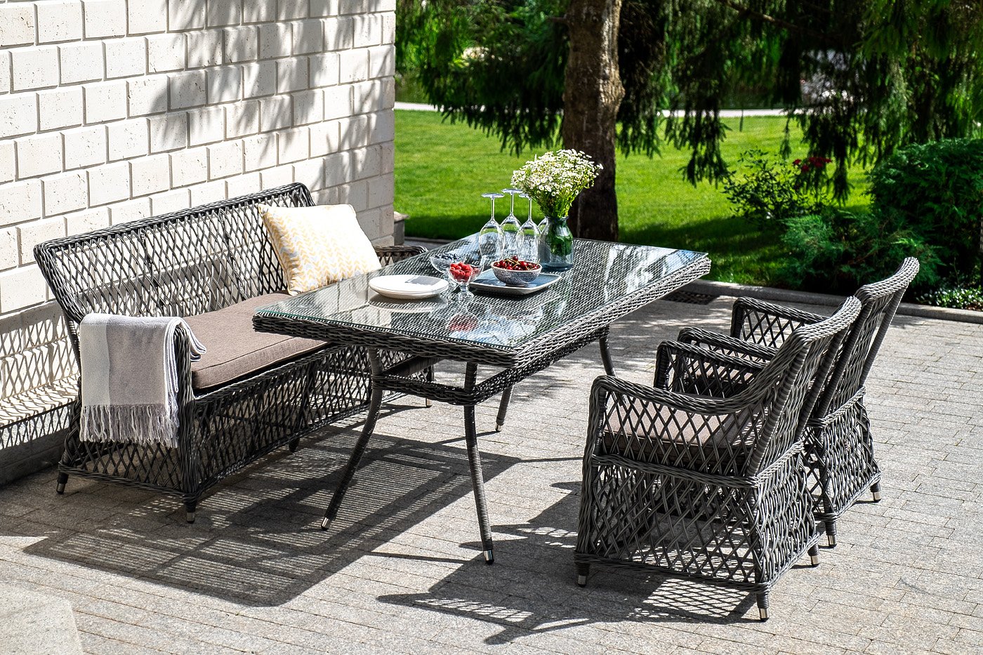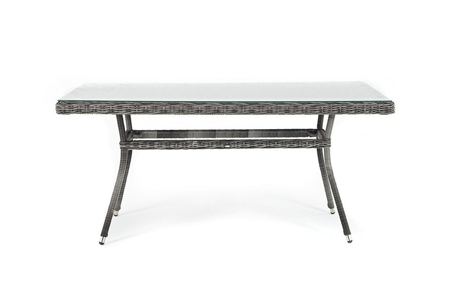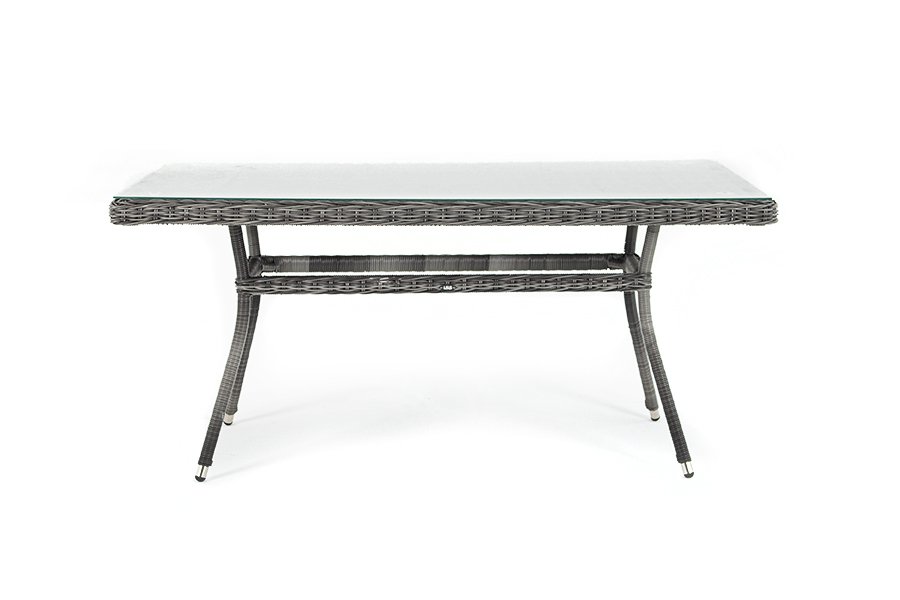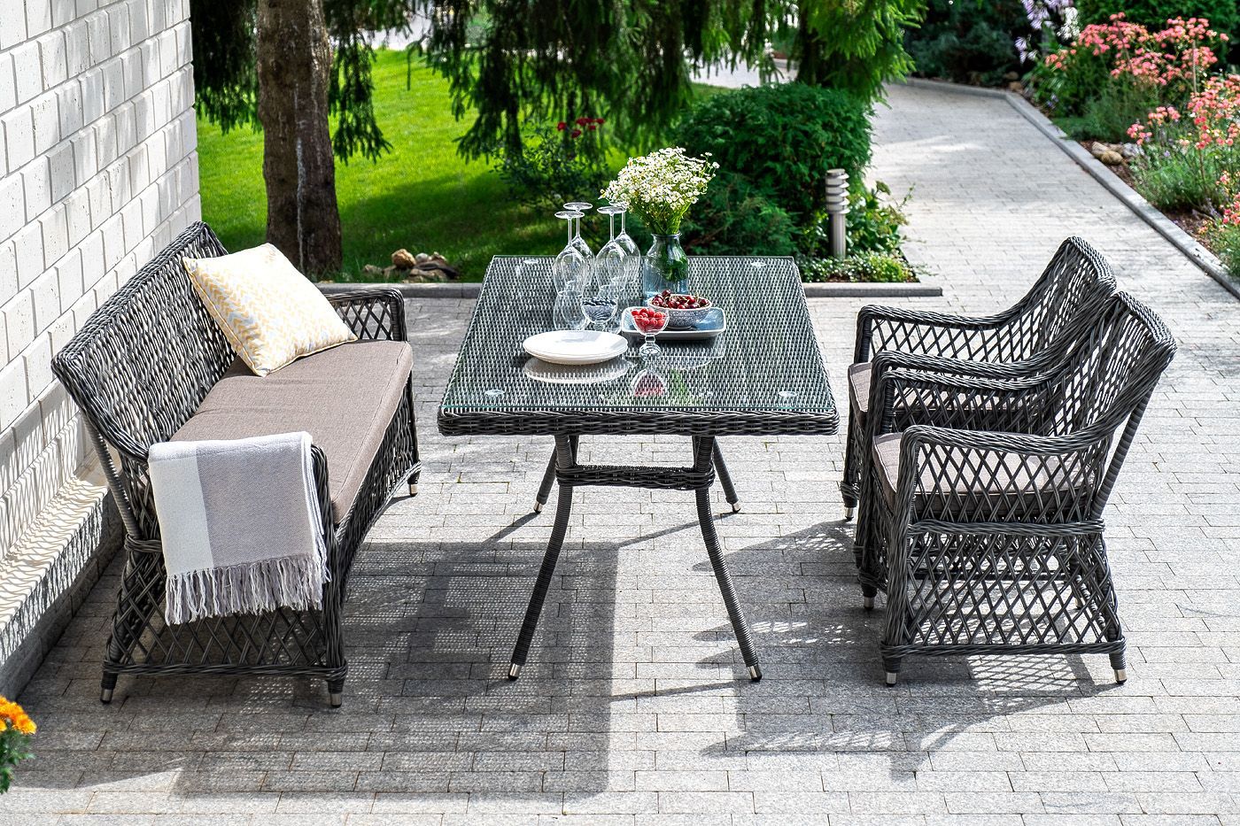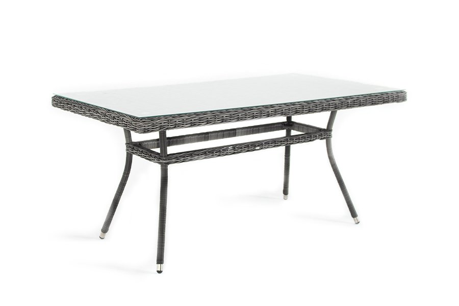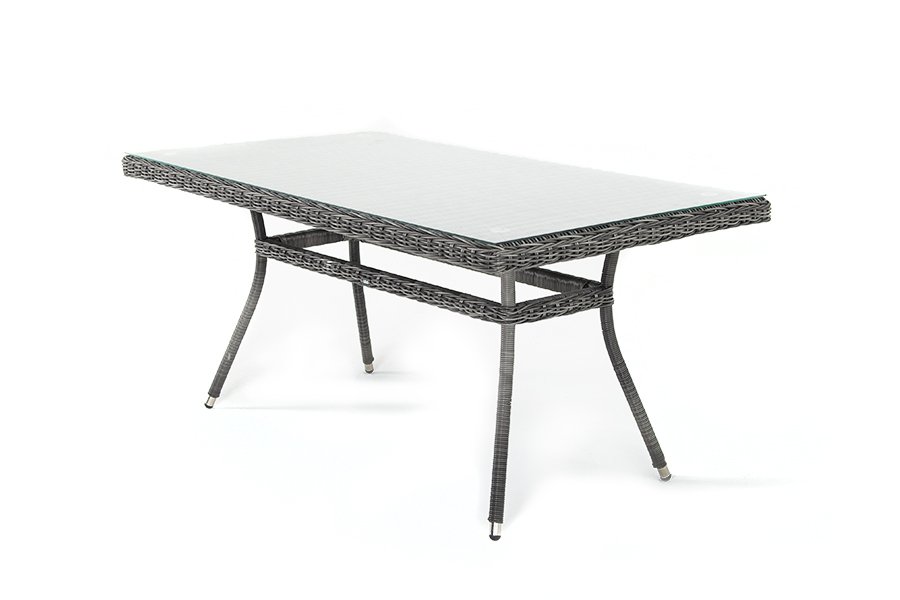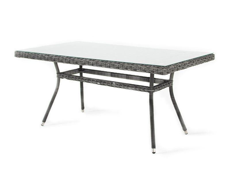 Предусматривает размещение 6 персон. Каркас выполнен из алюминия, а его оплетка произведена вручную круглым ротангом графитового цвета. Безопасность рабочей поверхности обеспечивает стеклянная столешница толщиной 5 мм.