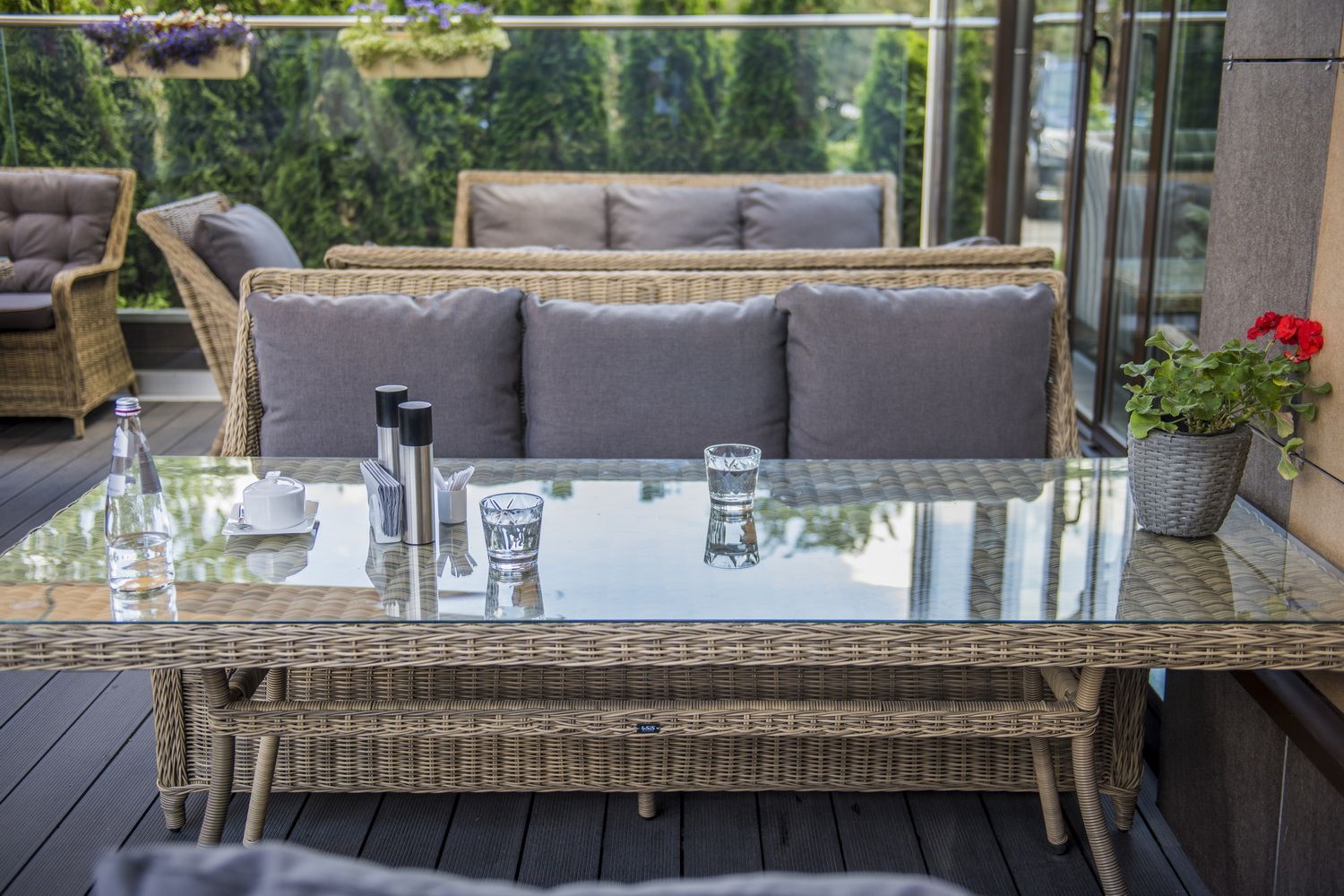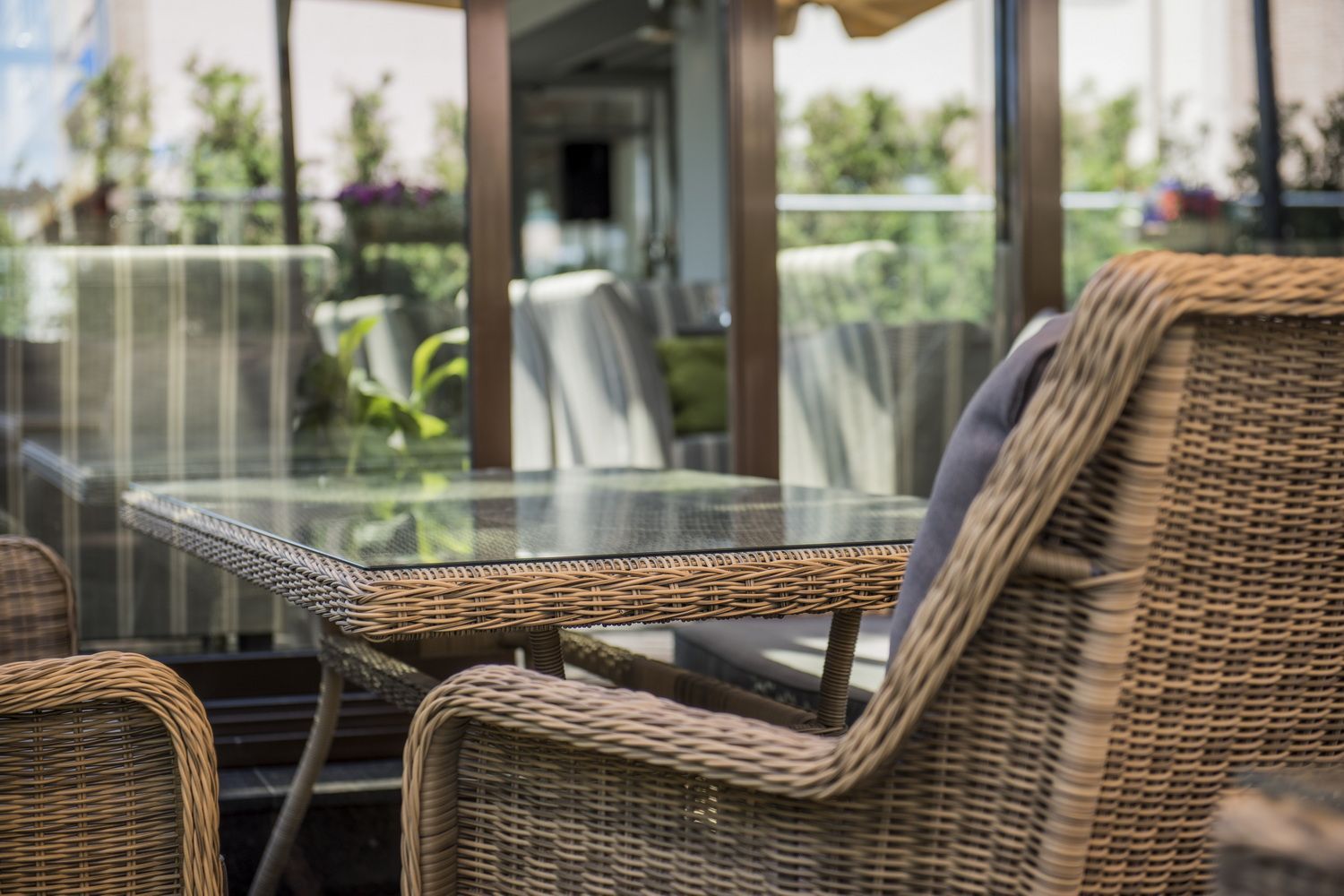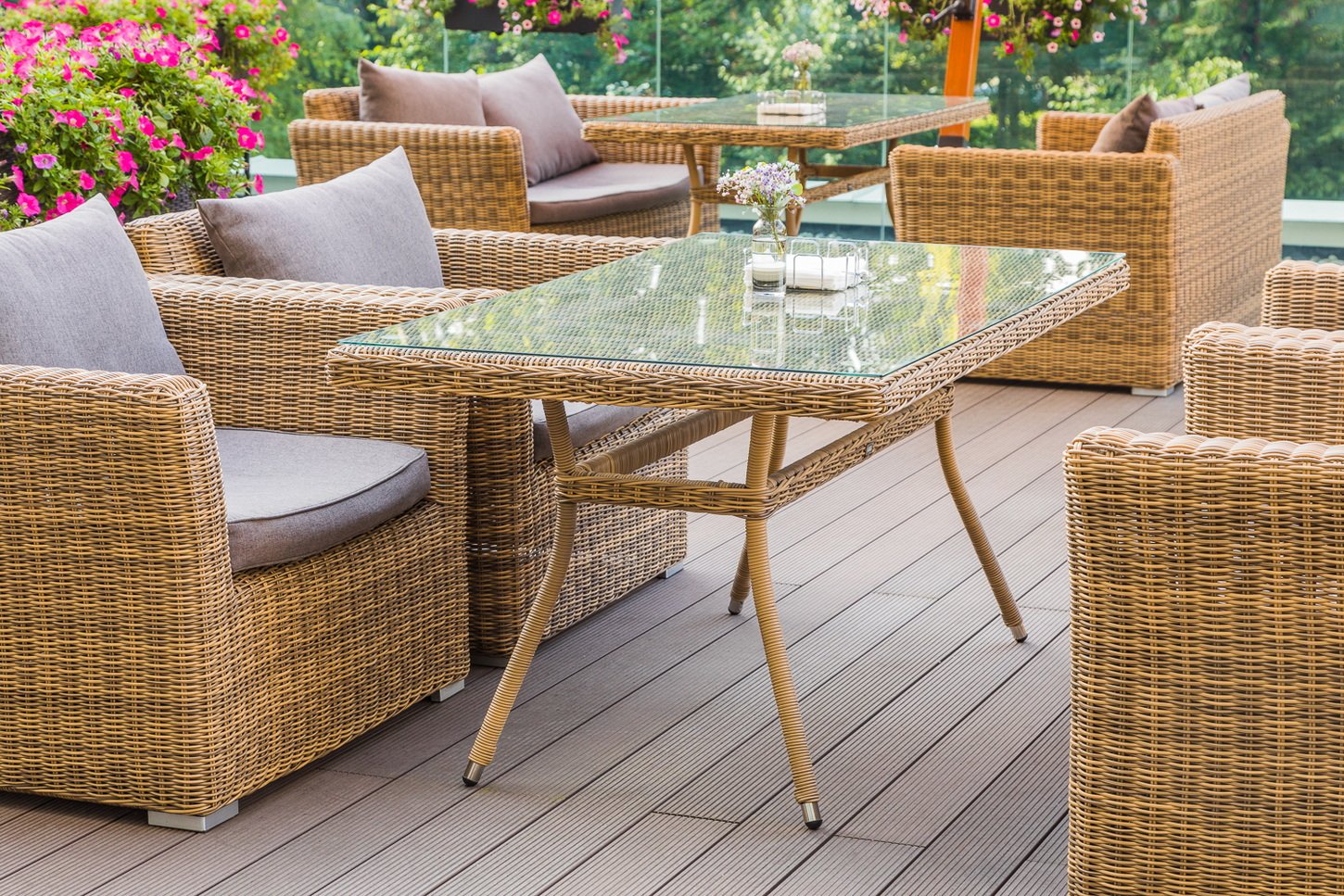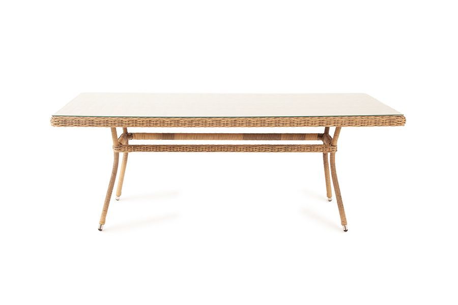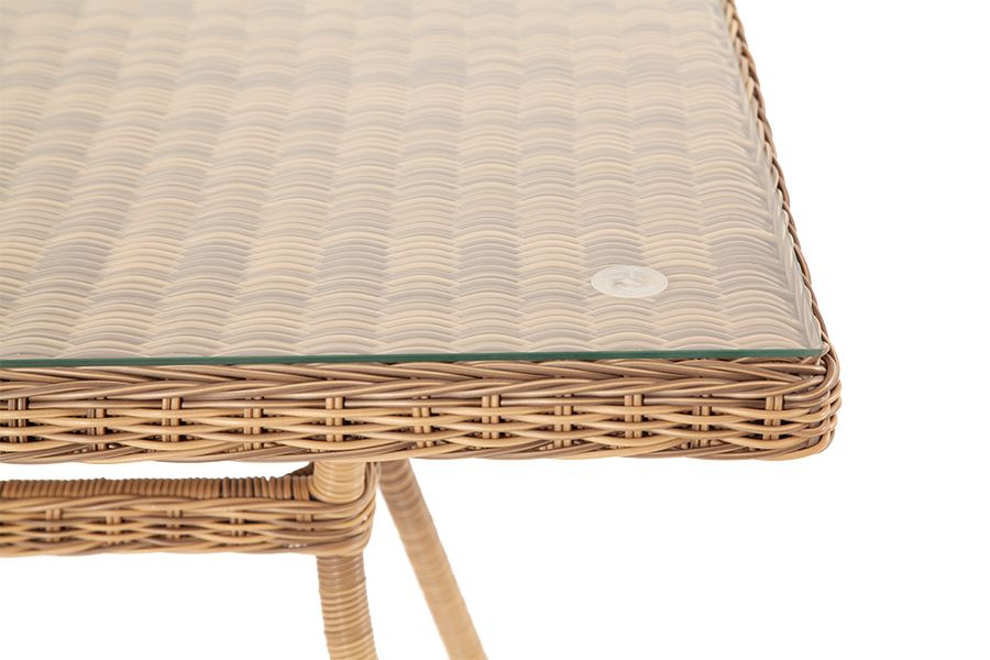 Каркас садового стола изготовлен из алюминия, вручную оплетенного круглым искусственным ротангом натурального соломенного оттенка.