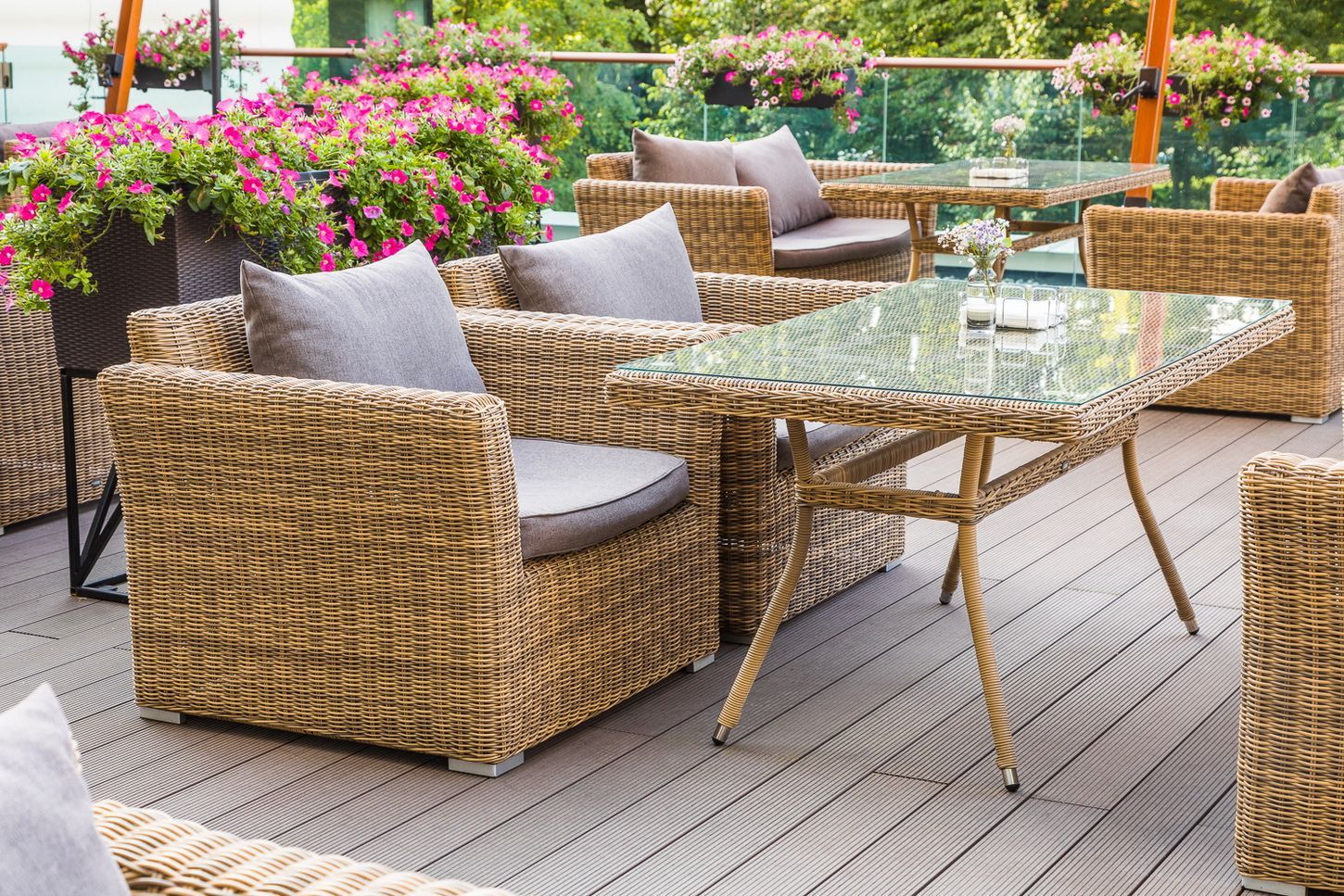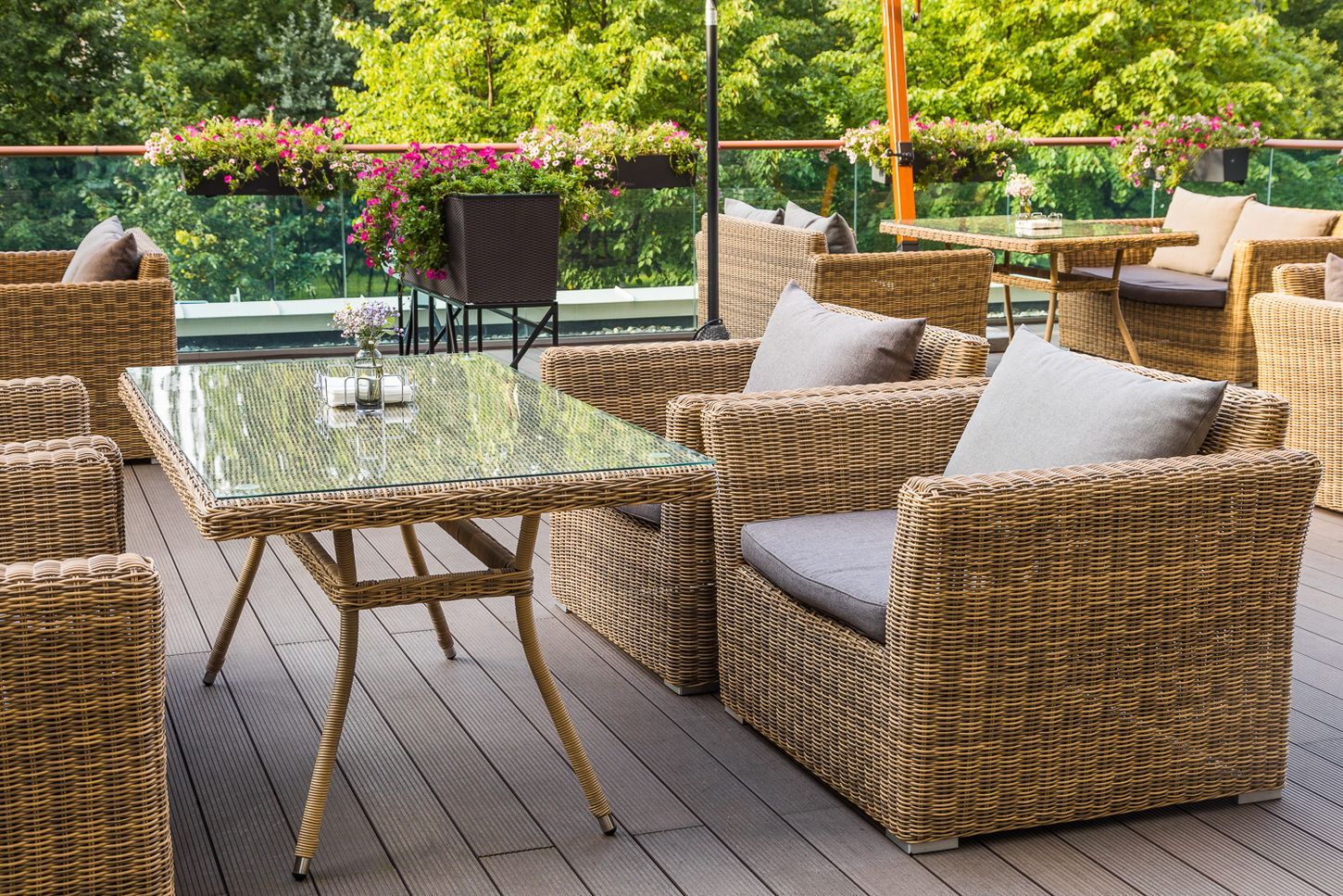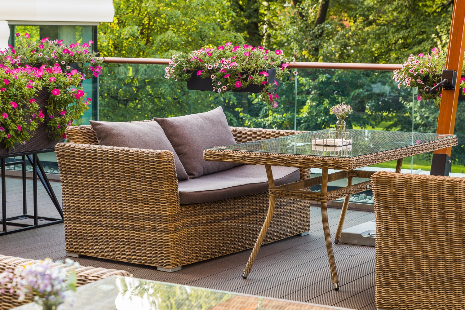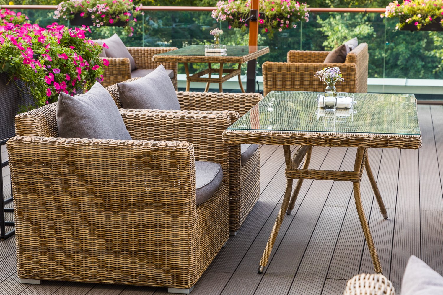 Каркас садового стола изготовлен из алюминия, вручную оплетенного круглым искусственным ротангом натурального соломенного оттенка.