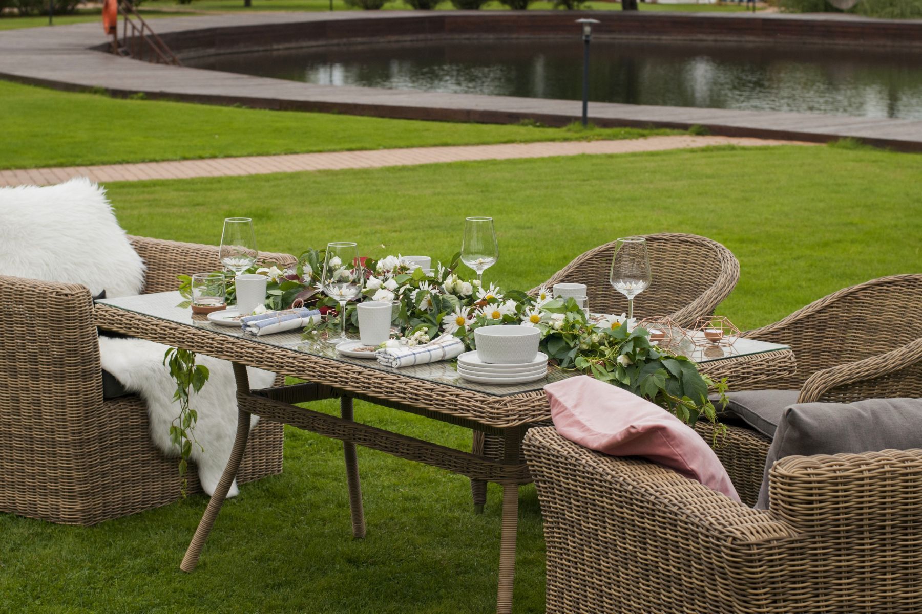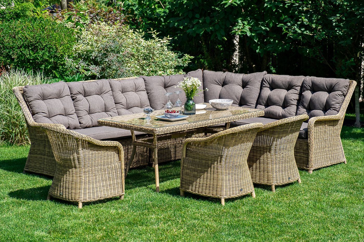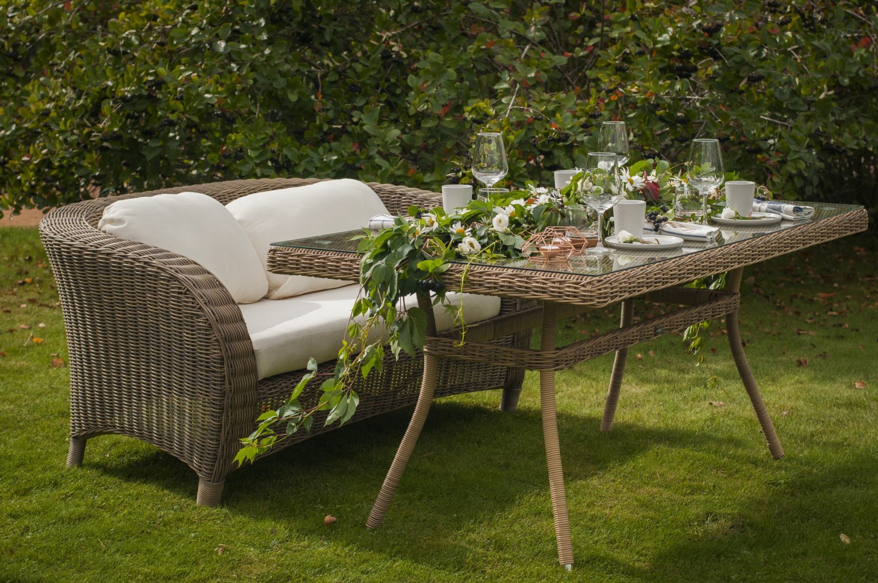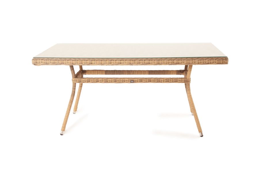Размеры плетеного стола: 1600×900×750 мм. Рассчитан на 6 персон.