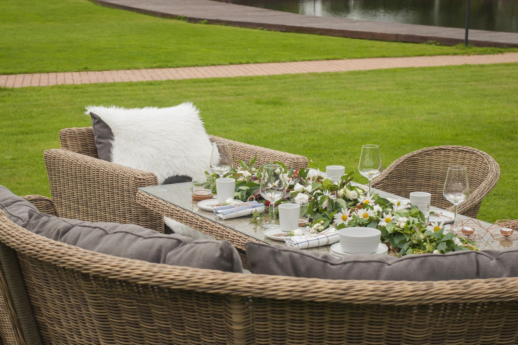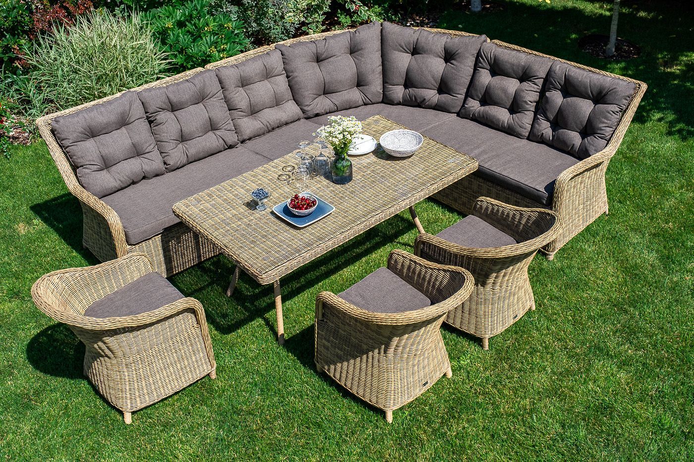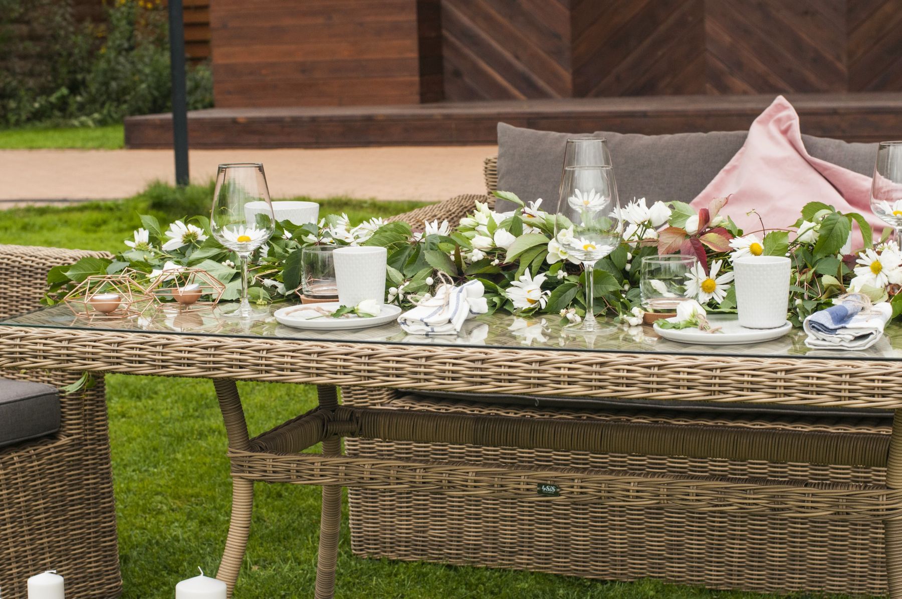 Размеры плетеного стола: 1600×900×750 мм. Рассчитан на 6 персон.