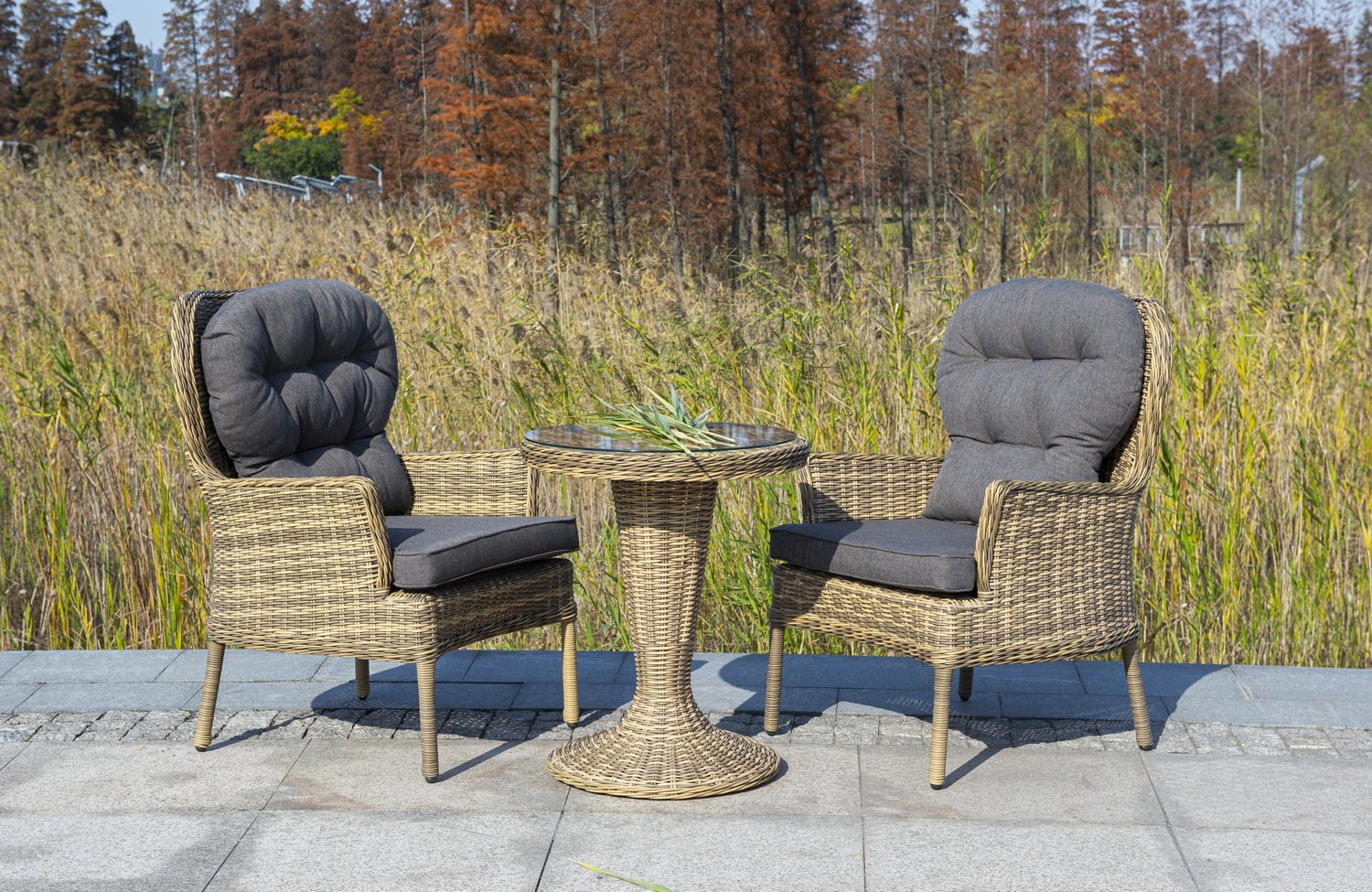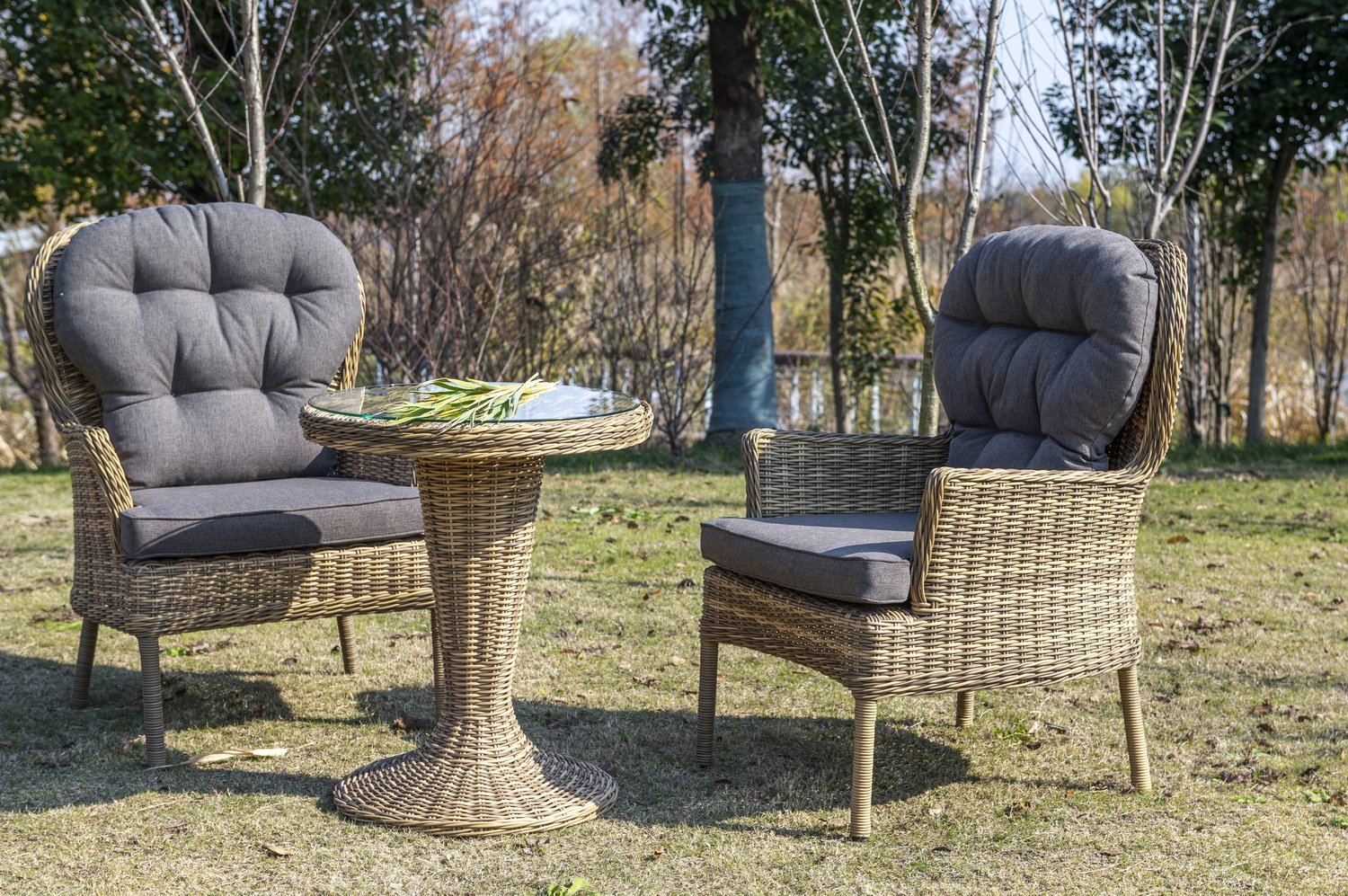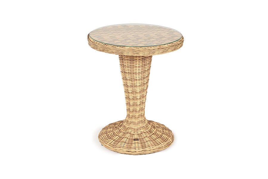 Каркас изготовлен из легкого алюминия и оплетен искусственным ротангом натурального соломенного оттенка. Поверхность столика дополнена стеклянной столешницей из закаленного стекла, толщиной 5 мм.