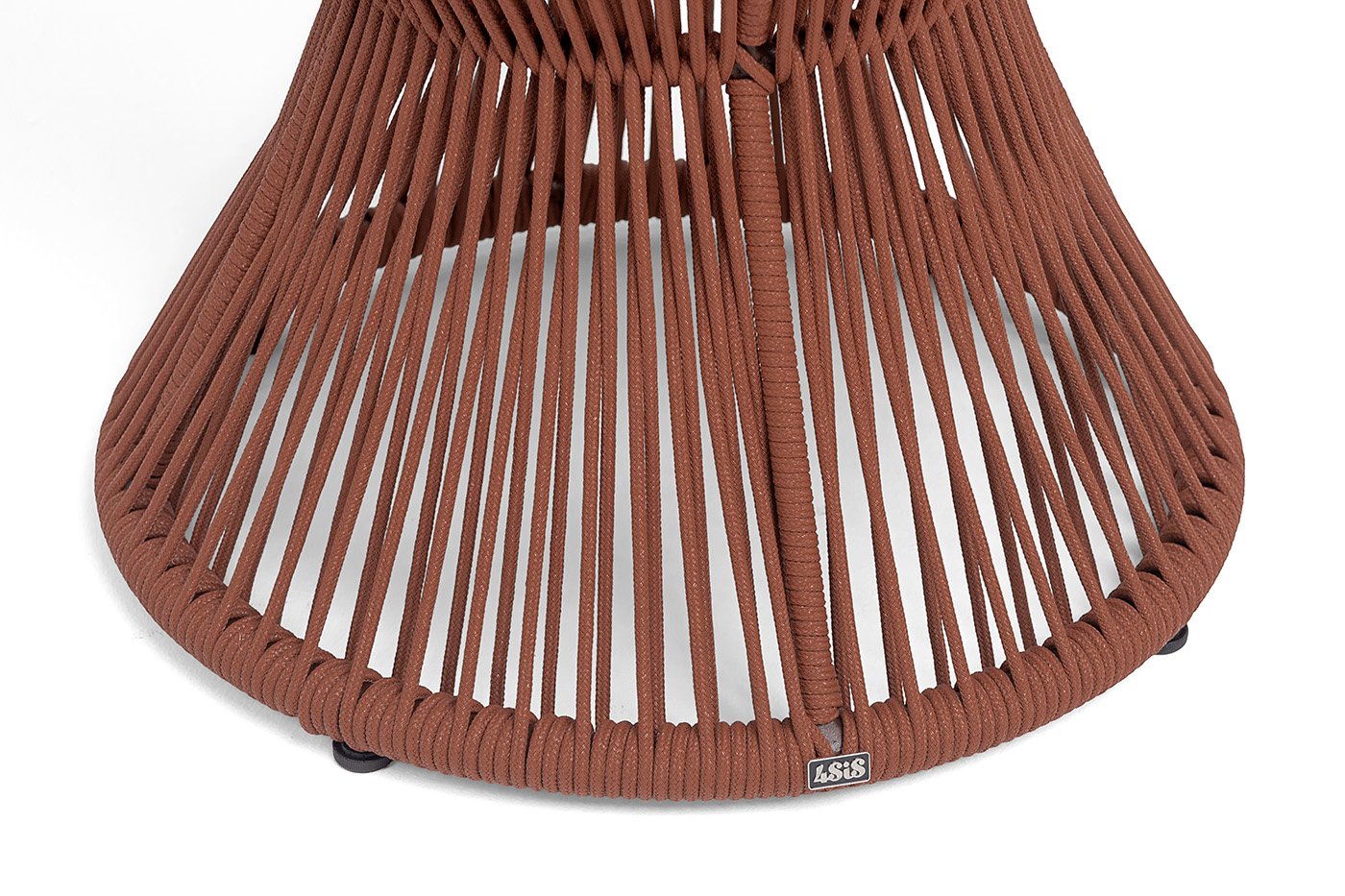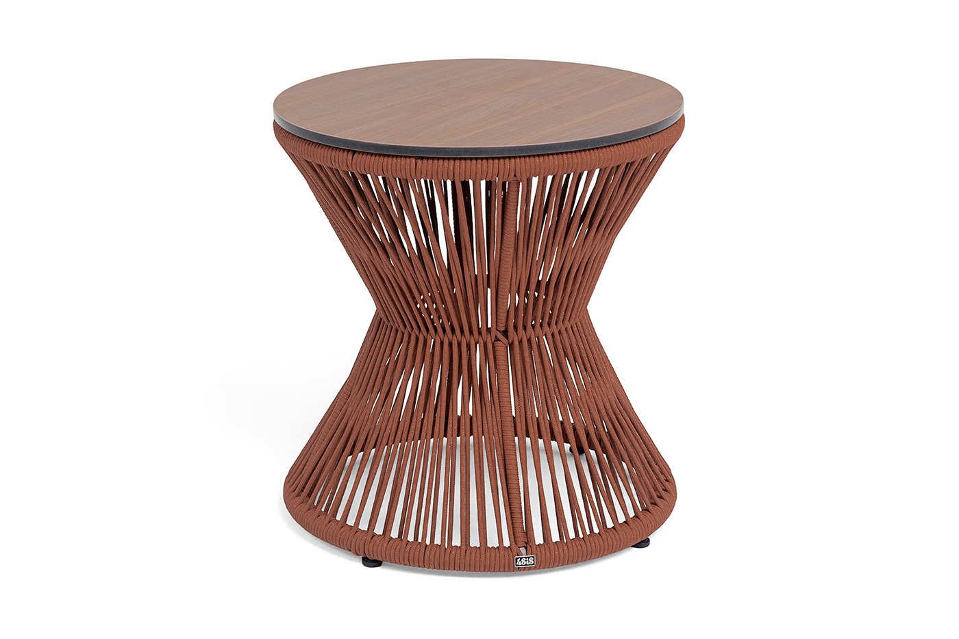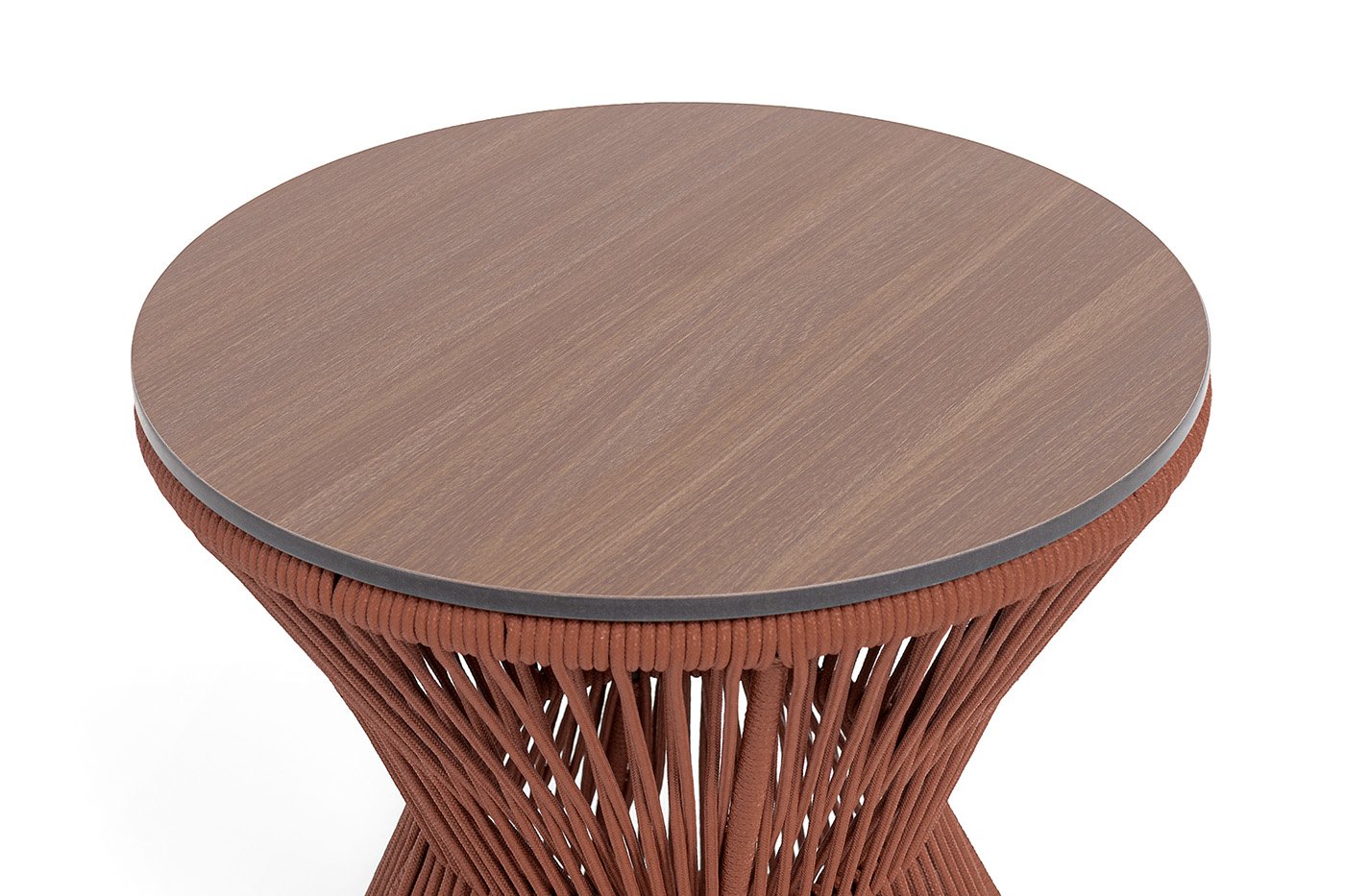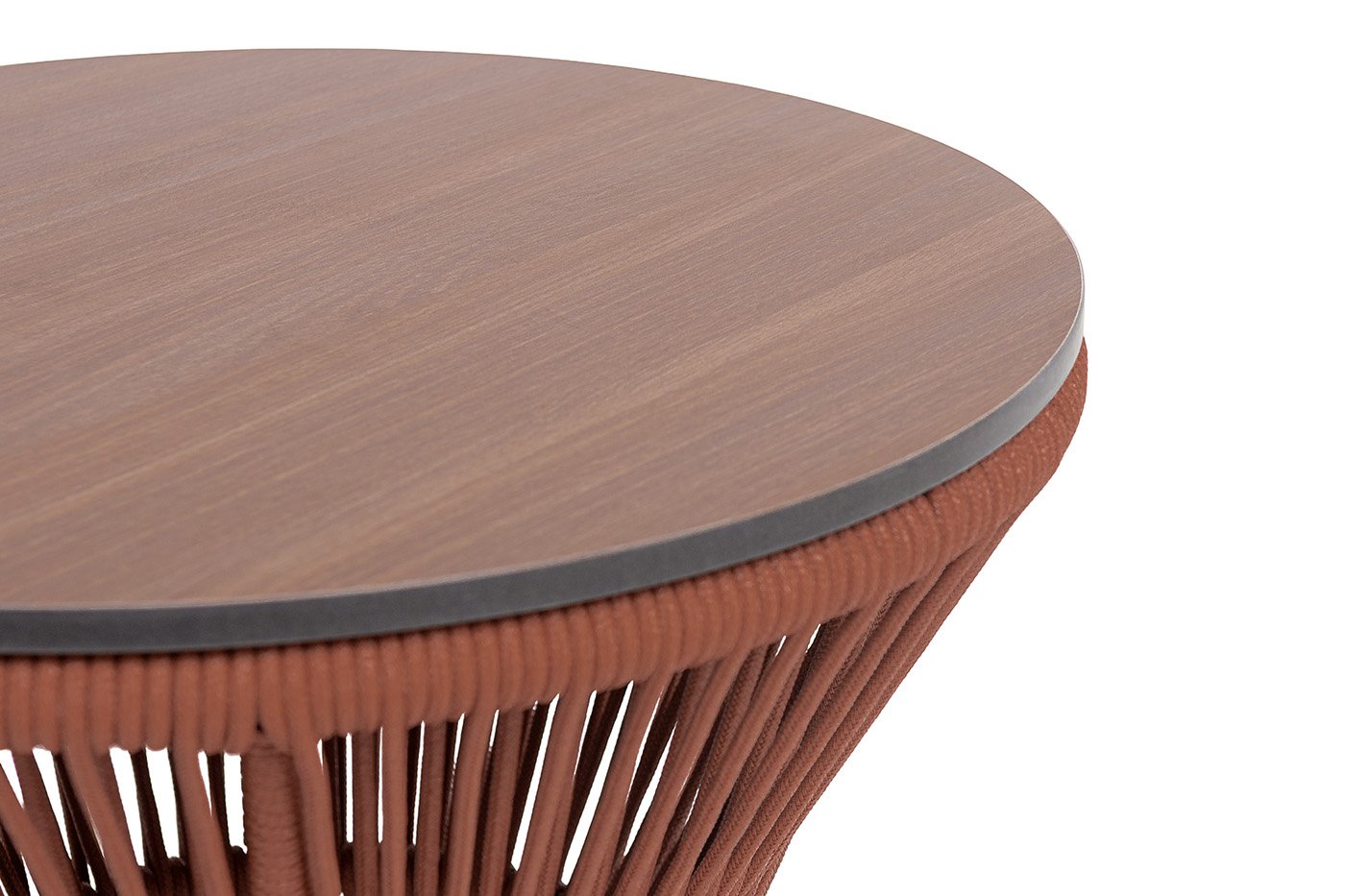Прочный алюминиевый каркас окрашен в благородный коричневый цвет (RAL 8016), а столешница из монолитного компакт‑пластика HPL толщиной 12 мм имитирует натуральную текстуру дуба. Декоративное плетение из роупа насыщенного красного цвета (код 8372) придаёт модели особый шарм и выразительность.