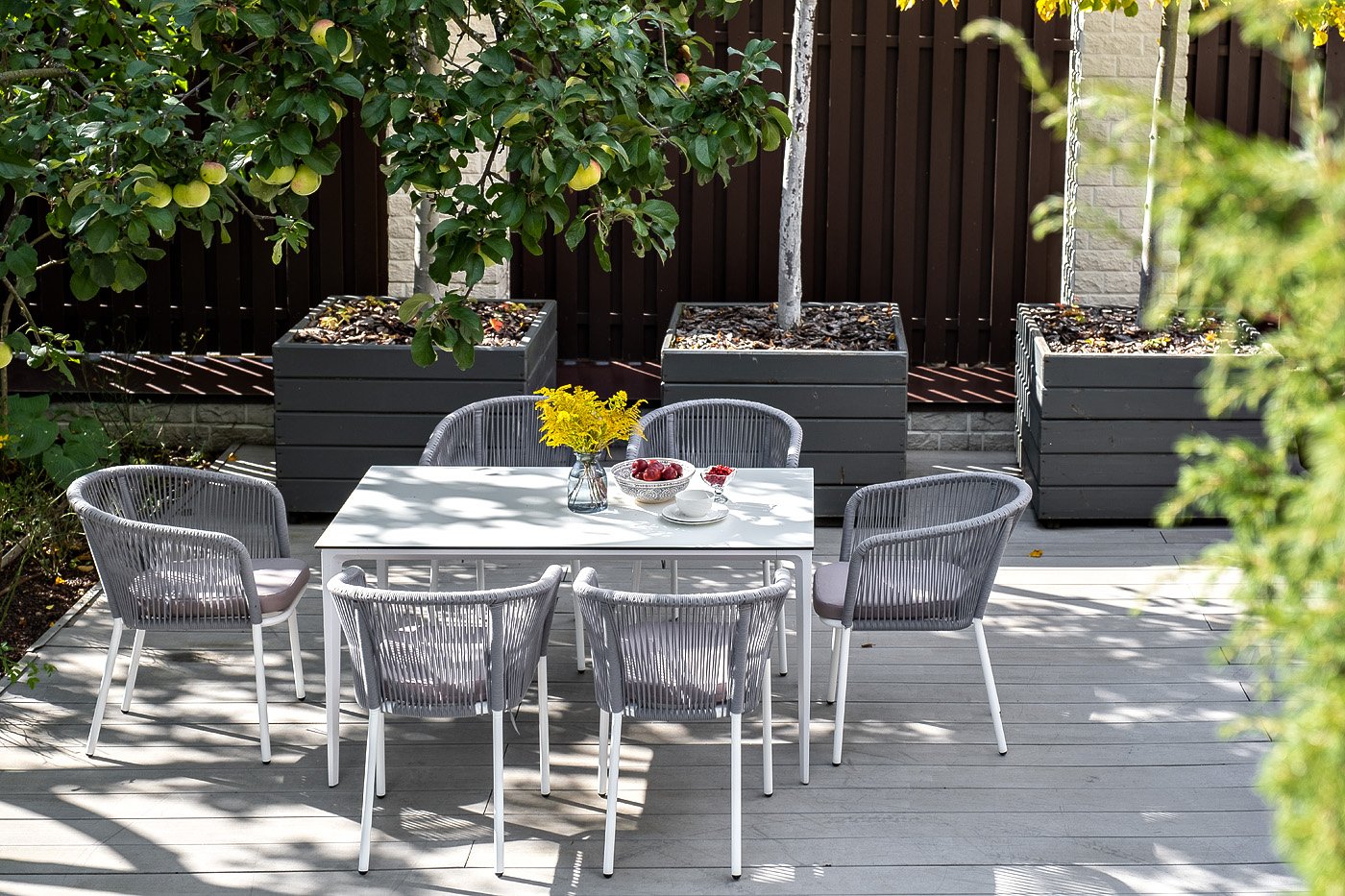 Столешница выполнена из современного высококачественного монолитного компакт-пластик HPL, толщиной 12 мм в молочном цветом. Материал устойчив к высоким температурам, попаданию влаги и может использоваться при любых погодных условиях. Подстолье изготовлено из крашеного алюминия белого цвета.