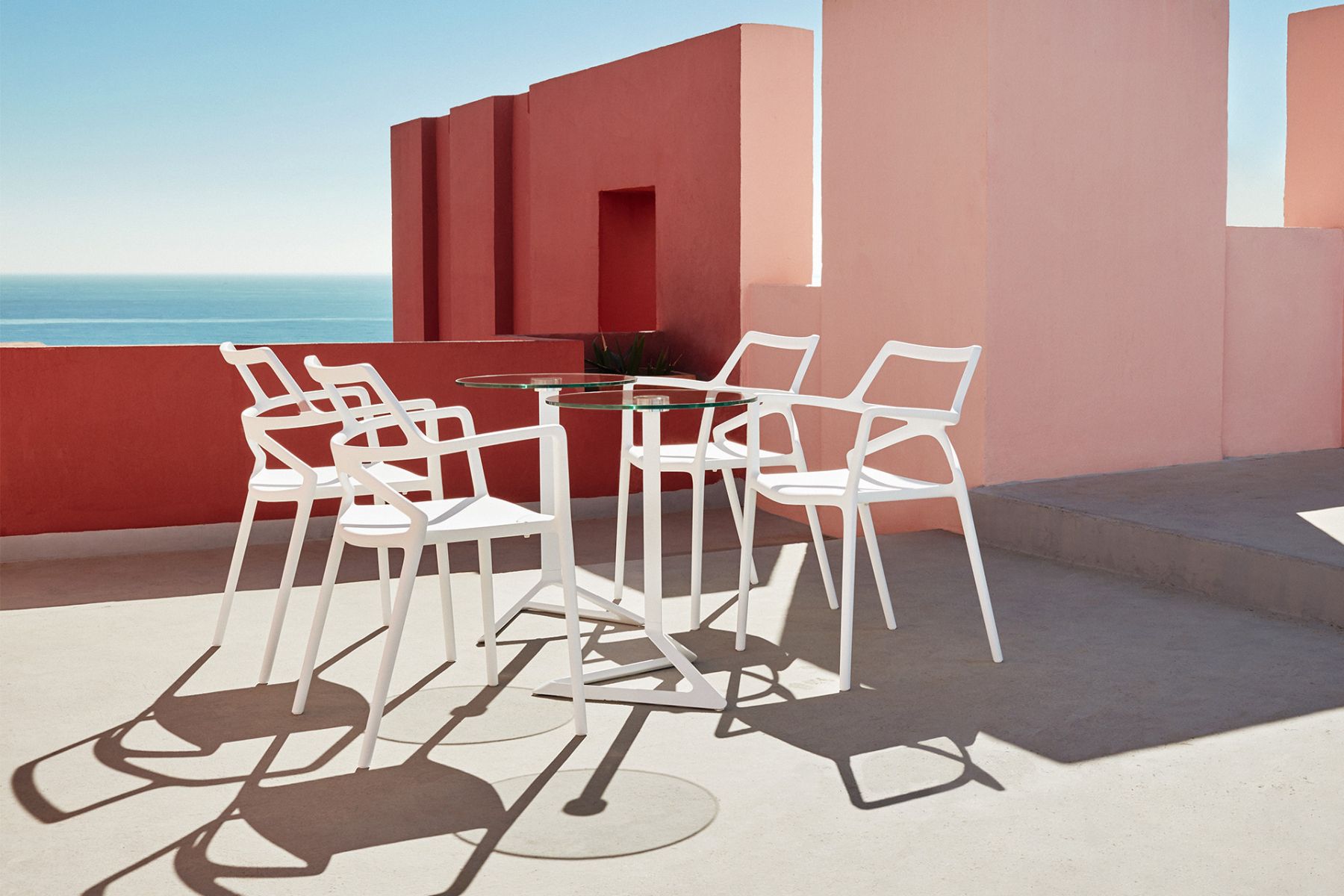 Коллекция Delta идеально вписывается в современные интерьеры и экстерьеры. Основание из литого алюминия и извлеченная алюминиевая колонна делают его идеальным для использования на открытом воздухе благодаря погодоустойчивым свойствам этих материалов. Складывающаяся верхняя часть и конструкция основания позволяют ставить столы один напротив другого, чтобы сэкономить место, когда они не используются. Целью кресла DELTA было создание вневременного продукта, который постоянно стремится найти баланс между реализмом и сюрреализмом - материей и антивеществом, абстракцией и эмоциями. Цель заключалась в том, чтобы максимизировать эмоции при минимизации ресурсов, подвергая сомнению общую логику чего-то нового.