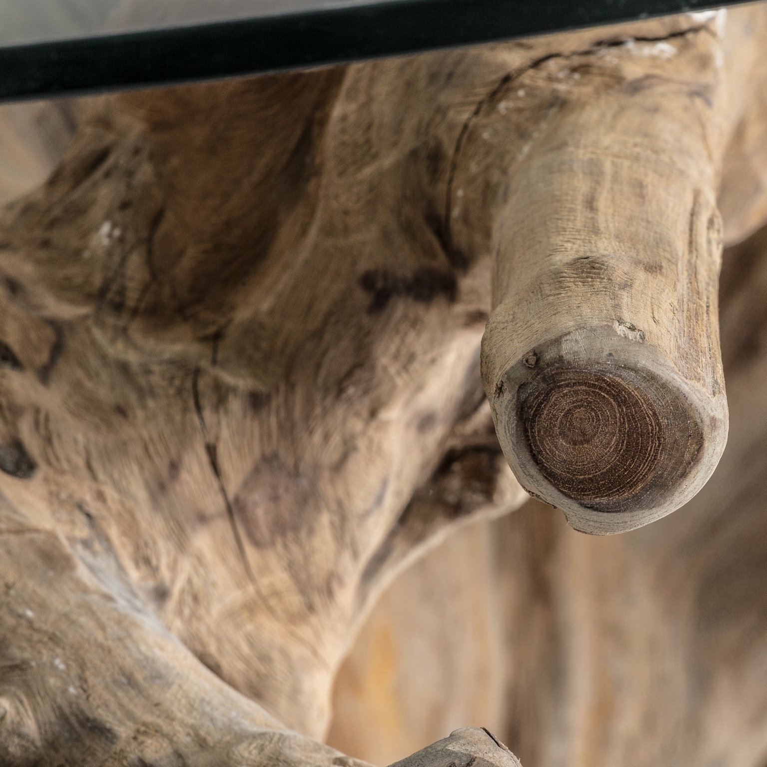 Обеденный стол Warri, натуральный цвет ручной работы, этнический стиль. Изготовлен из корня тика в сочетании со стеклом.