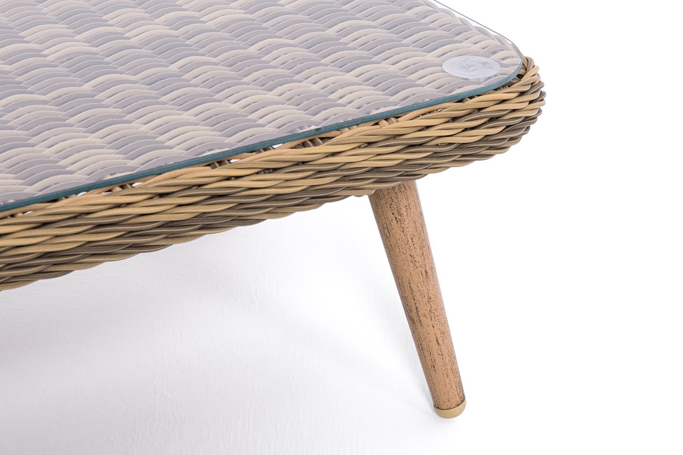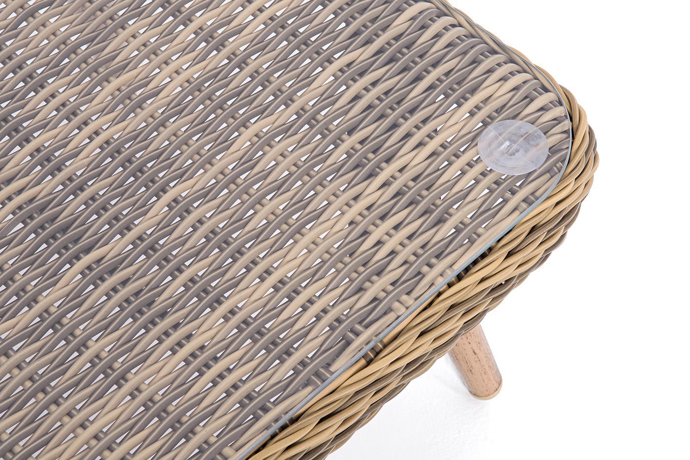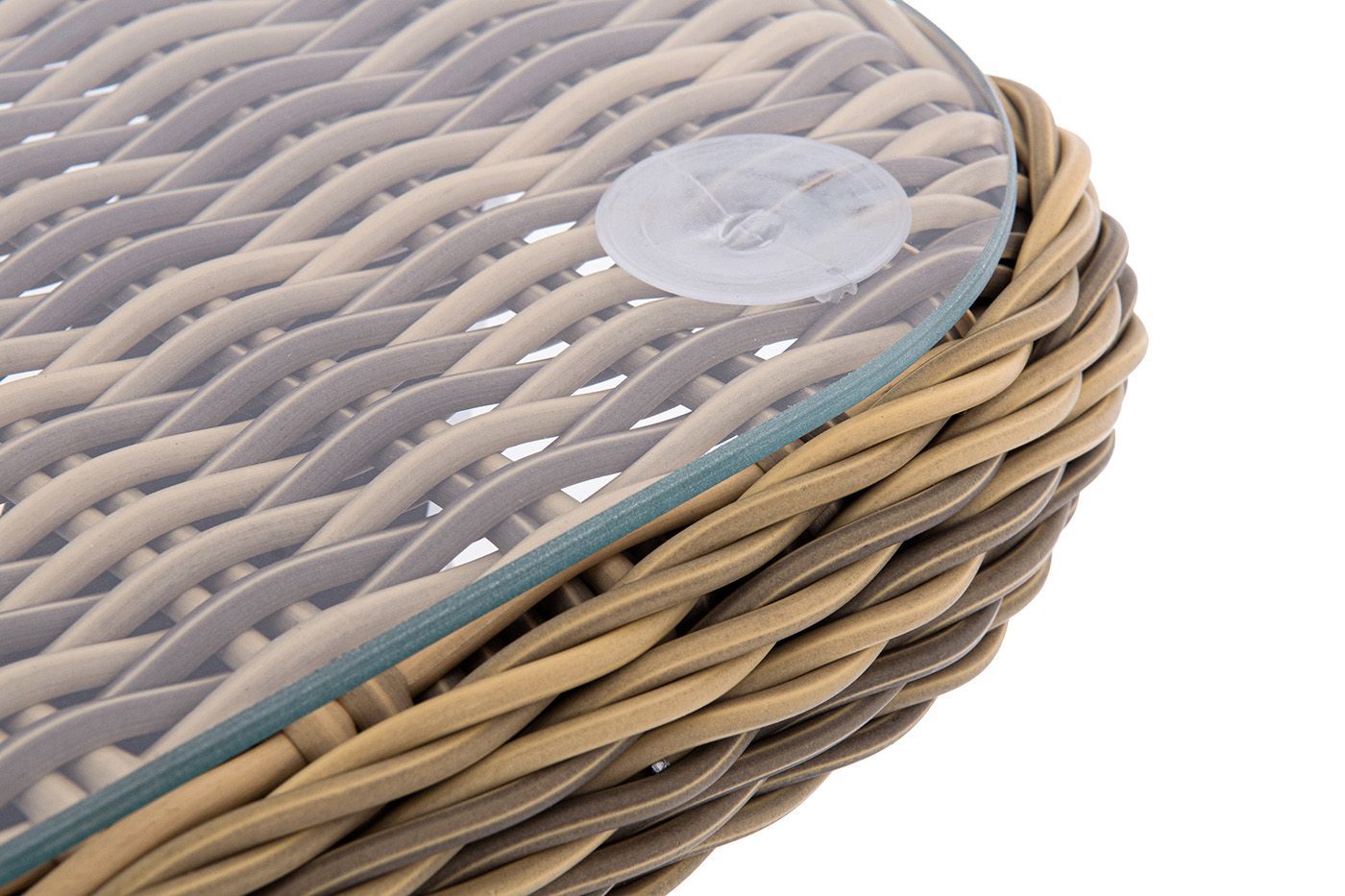 Столешницу из ротангового плетения дополняет прочное стекло, используемое для изготовления мебели. Стекло крепится с помощью держателей на силиконовых присосках и транспортируется в собранном виде.