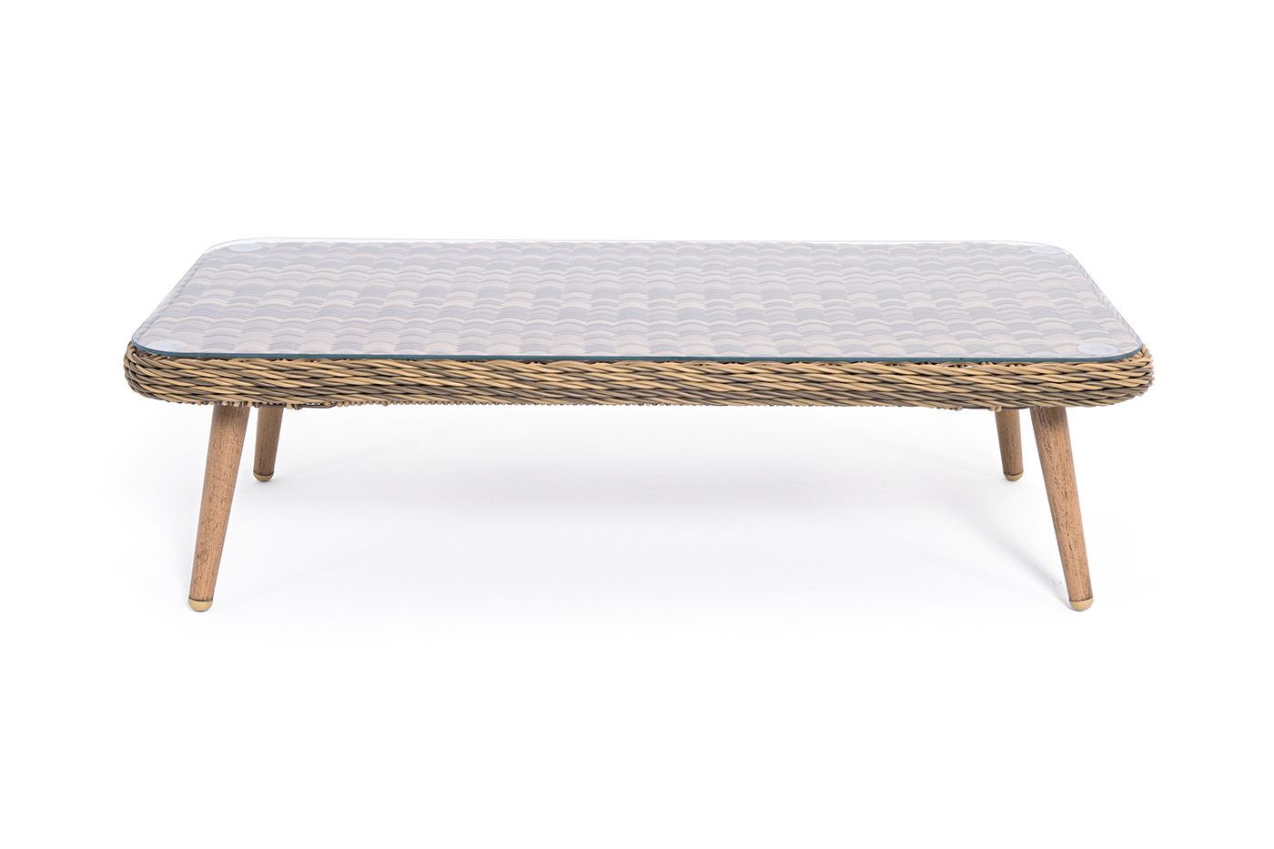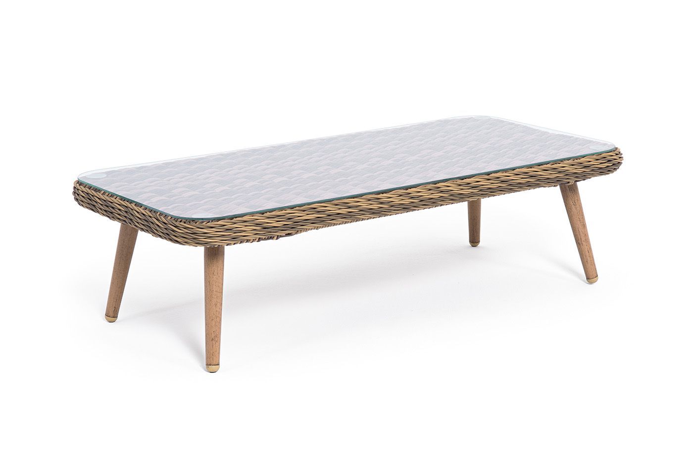 Алюминиевый каркас имеет цвет натурального дерева. Столик дополняет декоративная оплетка, при изготовлении которой используется круглый искусственный ротанг. Она представлена в соломенном цвете.