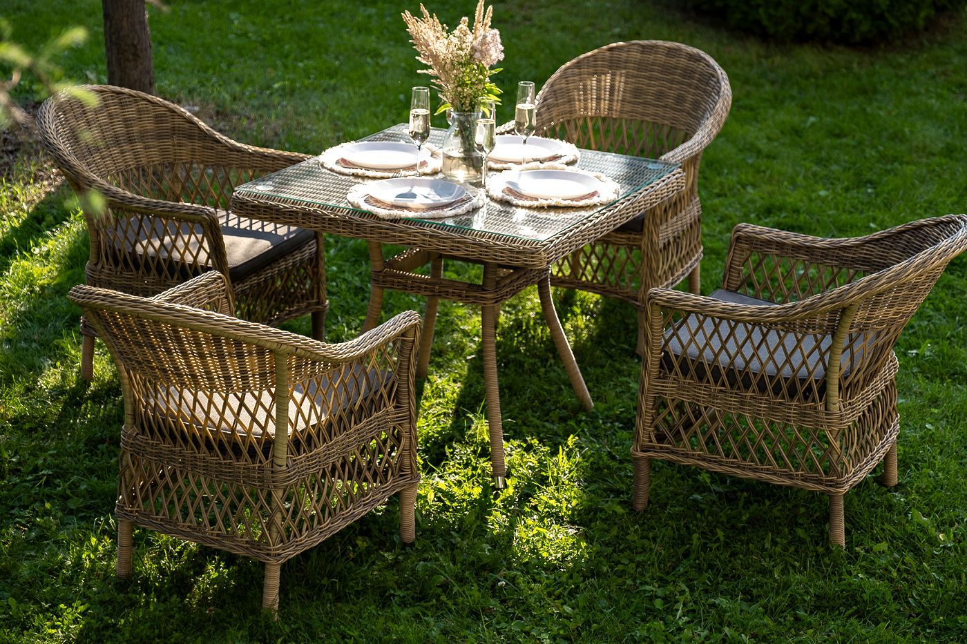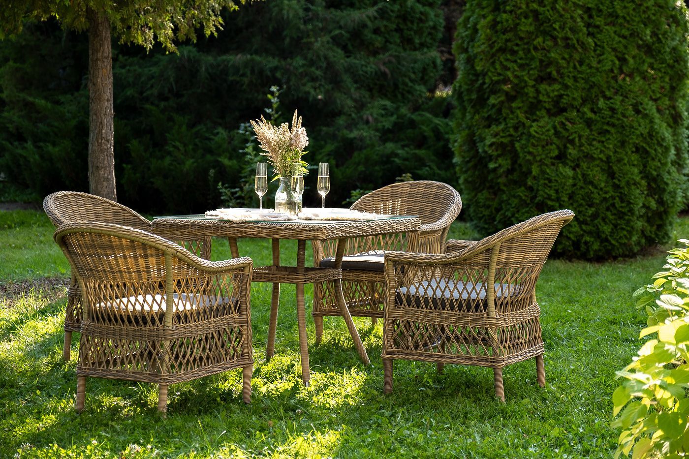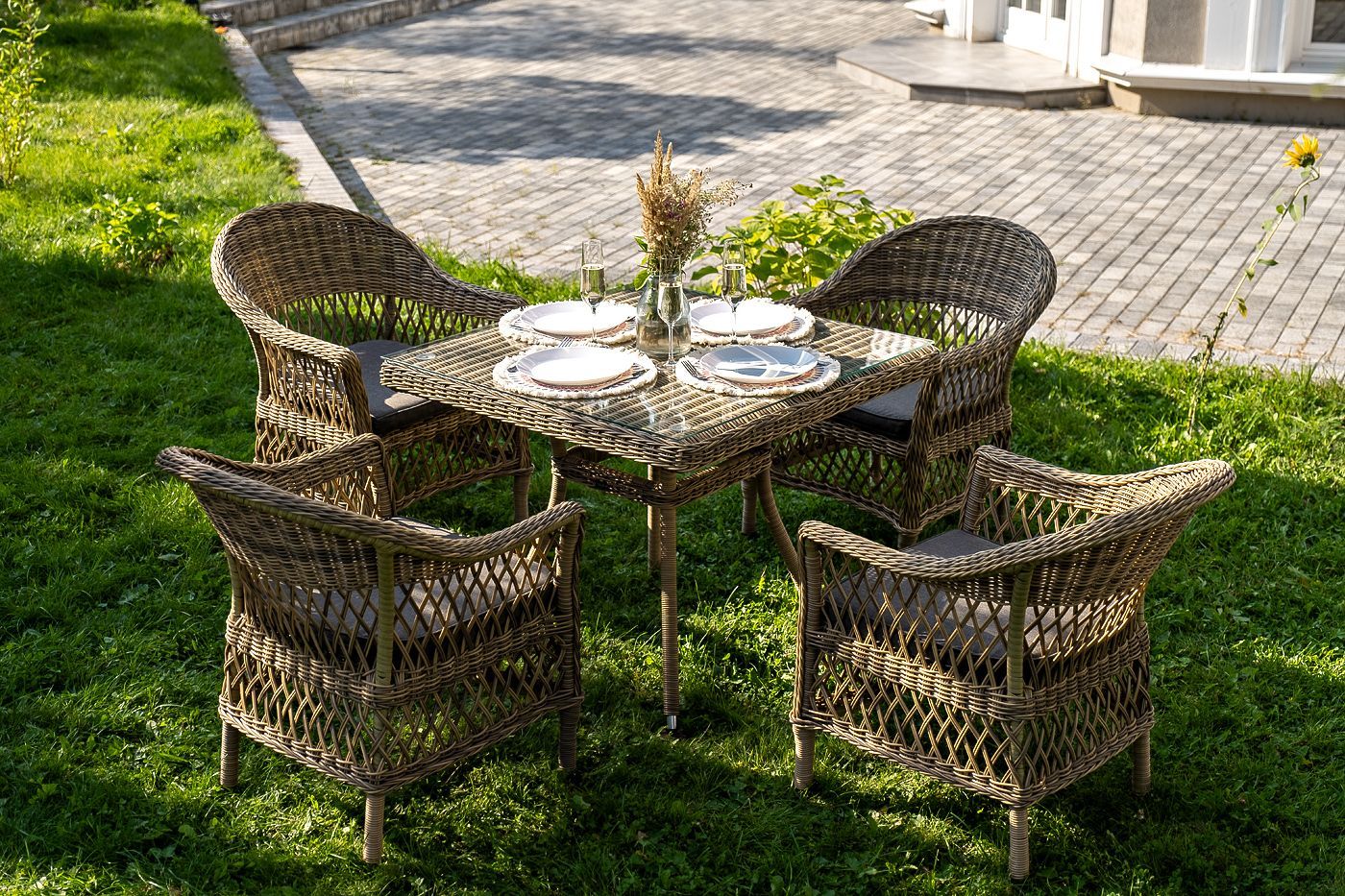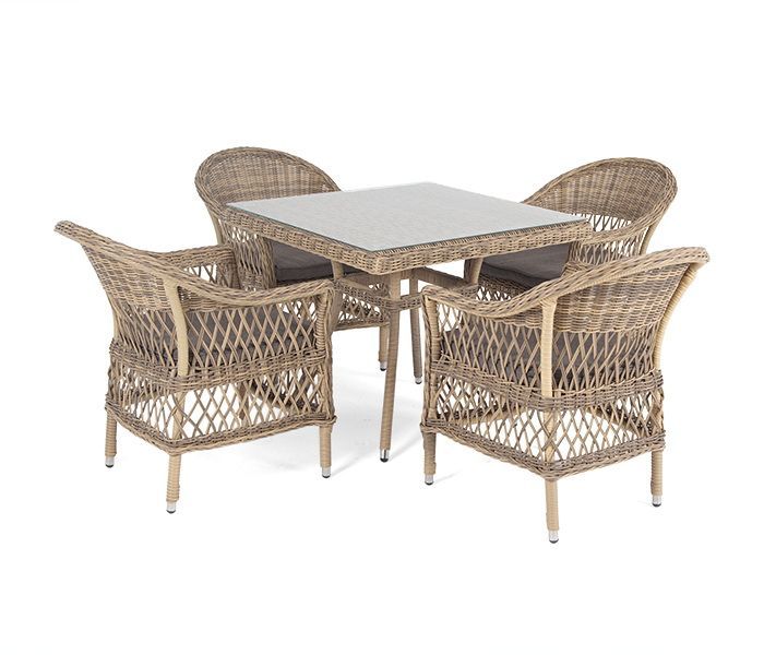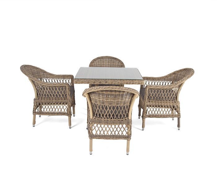 "Айриш" стол плетеный из искусственного ротанга, цвет соломенный 1шт. 900Х900Х750, "Сицилия" плетеный стул из искусственного ротанга, цвет соломенный 4шт. 590Х640Х820,