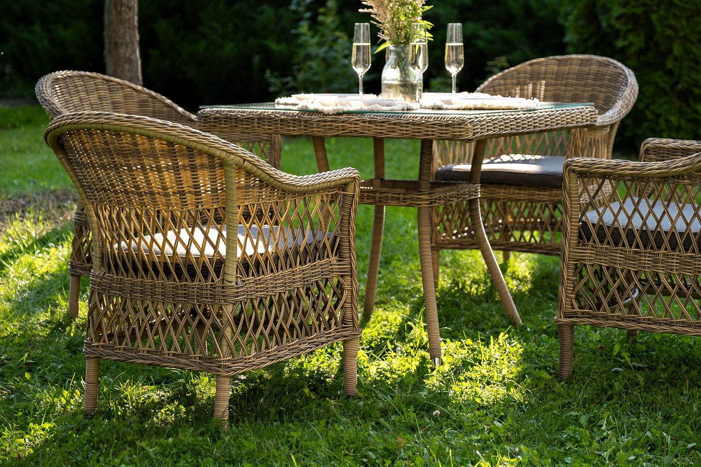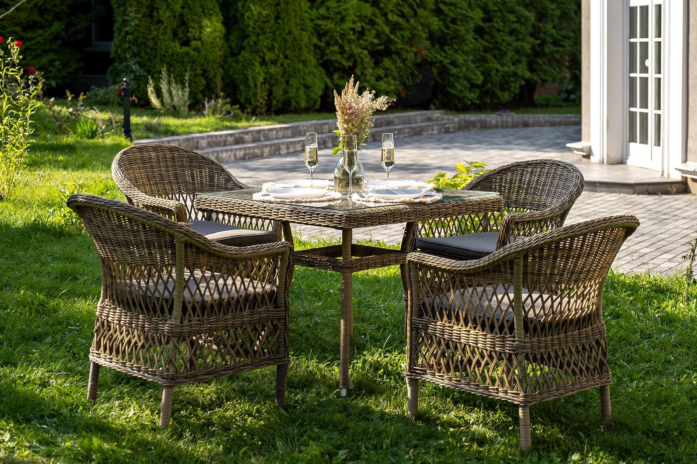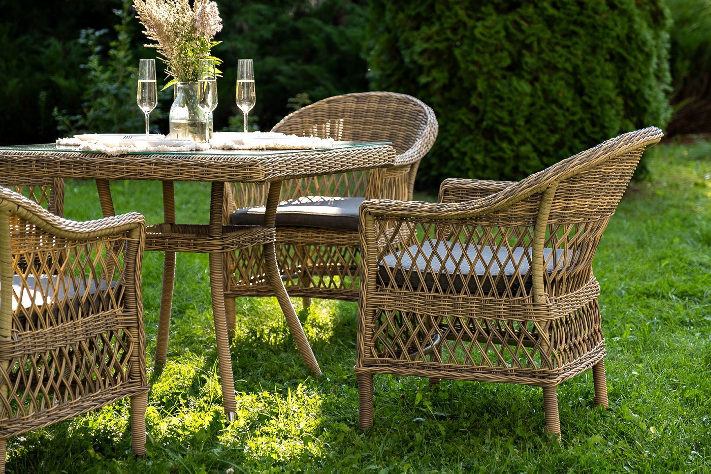 "Айриш" стол плетеный из искусственного ротанга, цвет соломенный 1шт. 900Х900Х750, "Сицилия" плетеный стул из искусственного ротанга, цвет соломенный 4шт. 590Х640Х820,