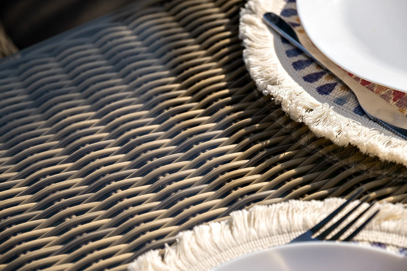 Мебель имеет надежный каркас из легкого алюминия. Изделия дополнительно оплетены ручным методом круглым искусственным ротангом натурального цвета соломы.