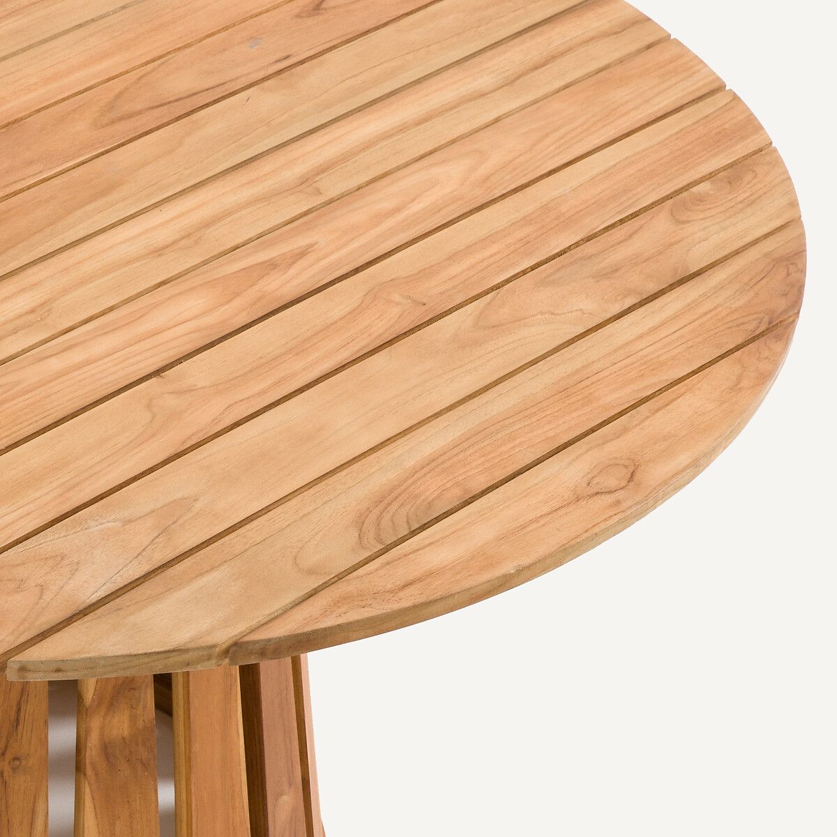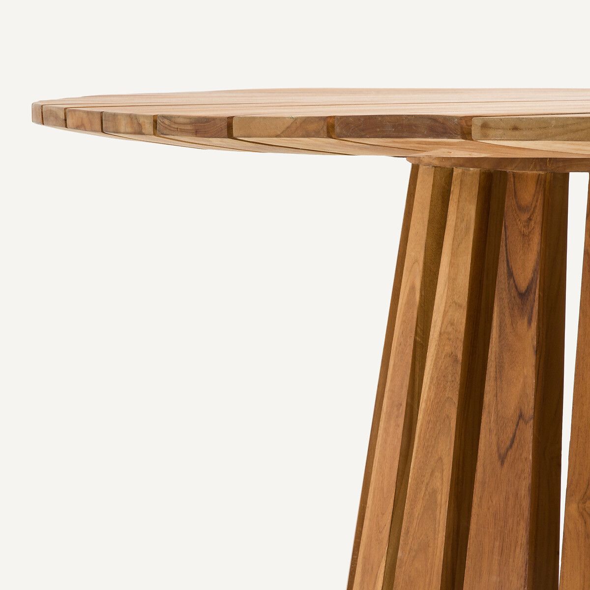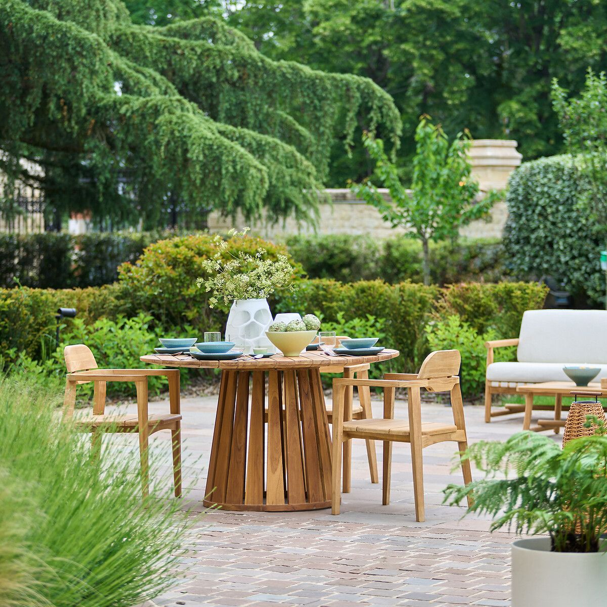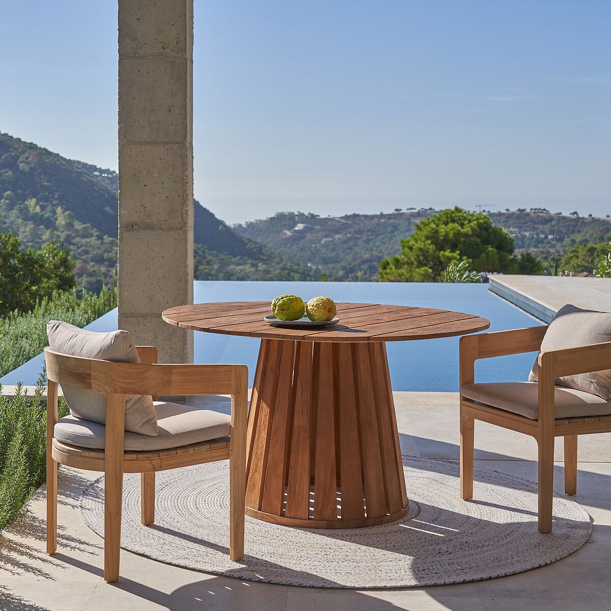 За этим обеденным столом из массива тика комфортно разместятся до шести человек. Его изысканный и компактный дизайн с расширяющейся книзу ножкой из деревянных реек создает впечатление невесомости. Современный стол Velizy можно использовать также и внутри помещения. Словно приглашение к продолжению лета. Эксклюзивное творение от AMPM.