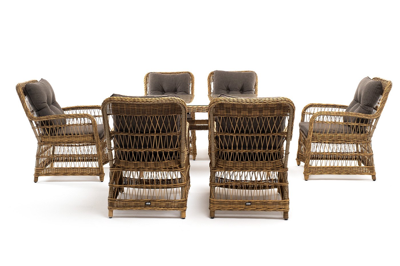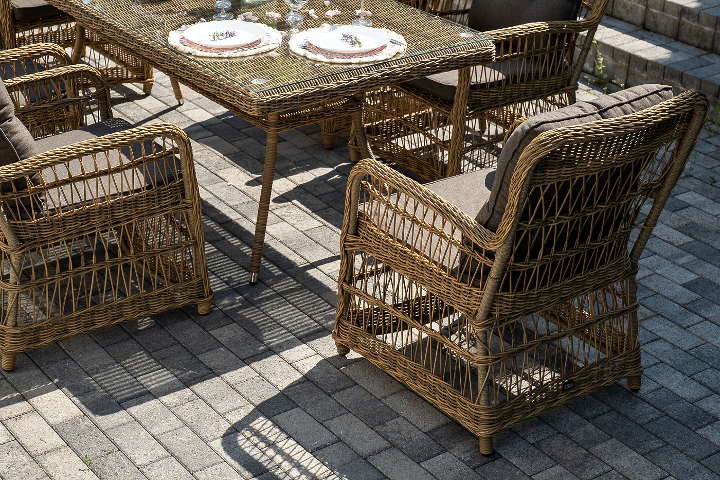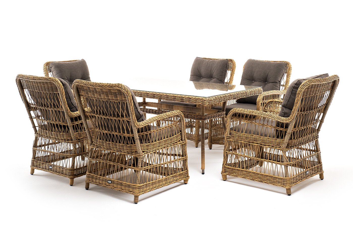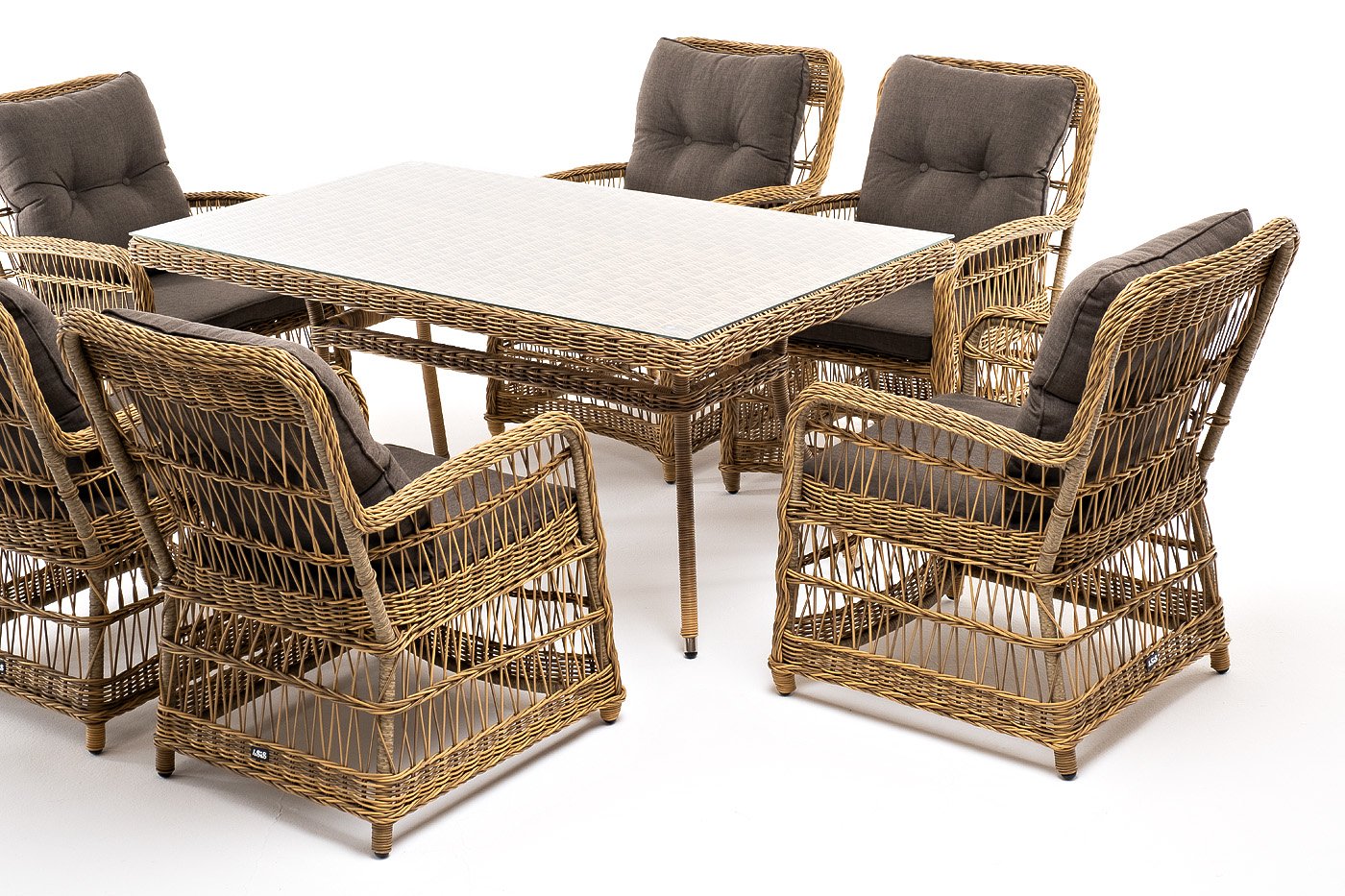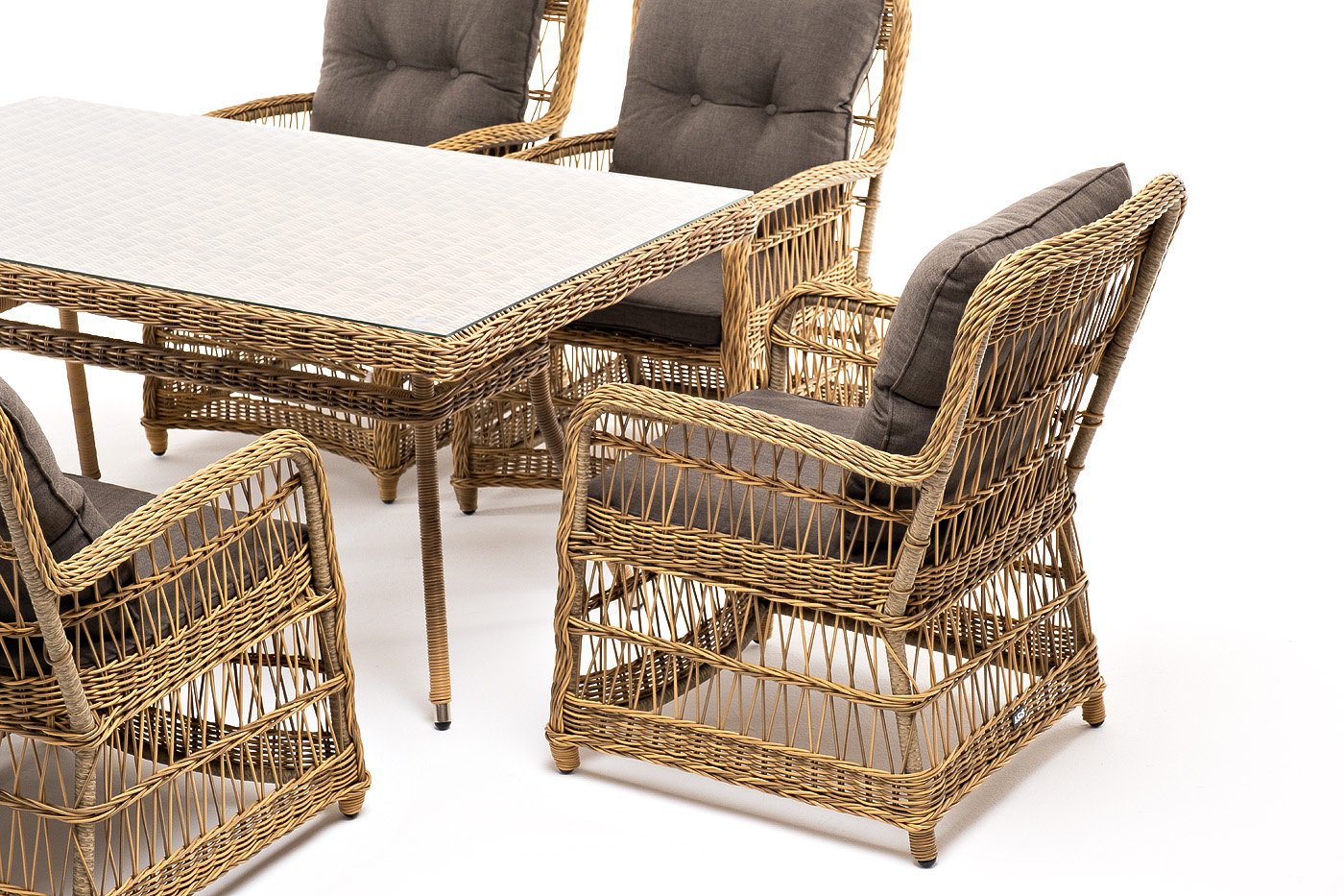 Вся мебель изготовлена из алюминия, вручную оплетенного круглым искусственным ротангом натурального соломенного оттенка. Столешница укомплектована ударопрочным стеклом, толщиной 5 мм. Данное стекло крепится к столу при помощи четырех вакуумных силиконовых присосок и поставляется в собранном виде.