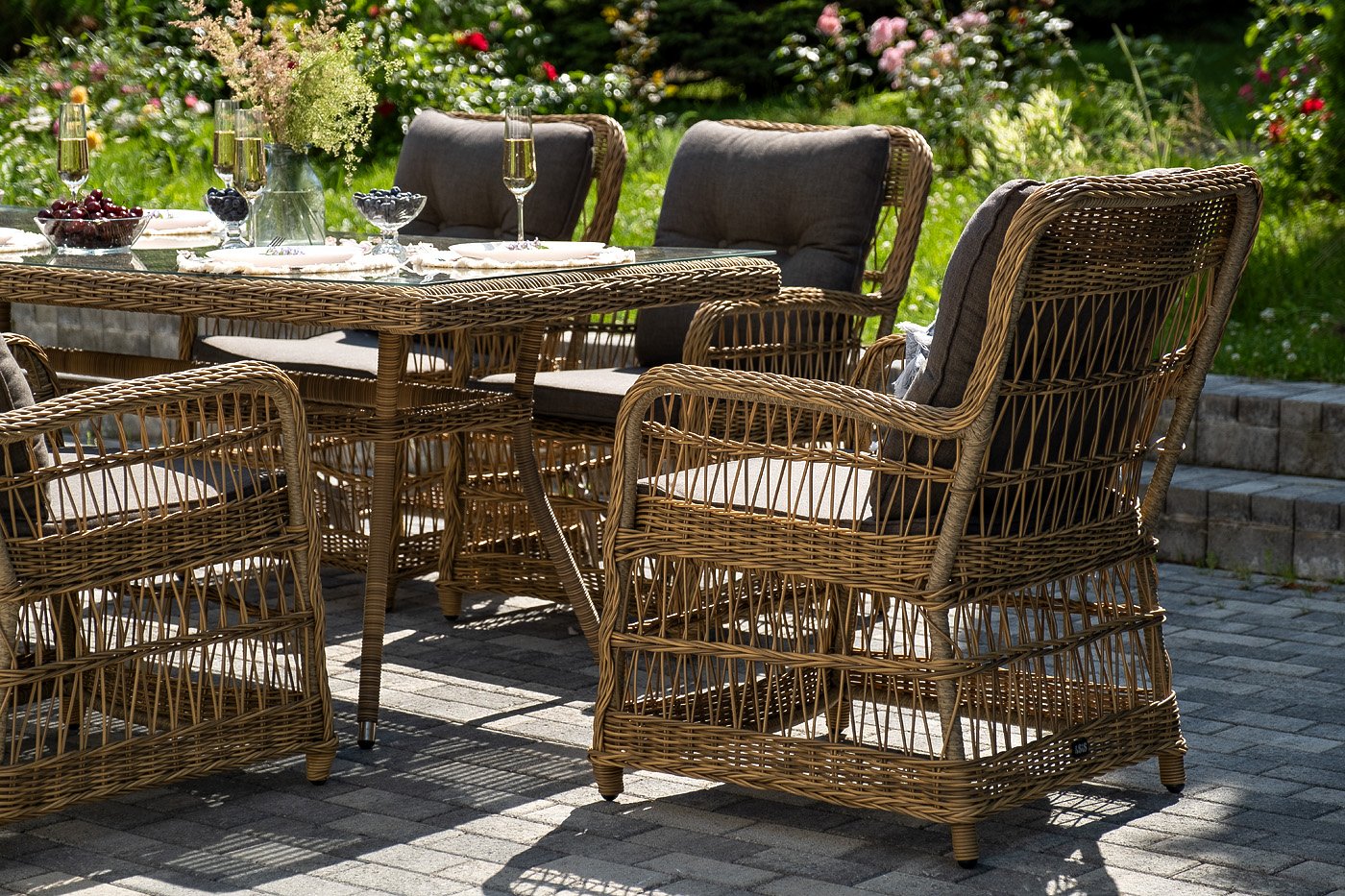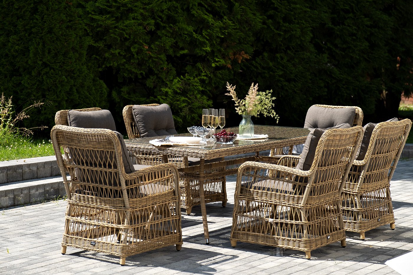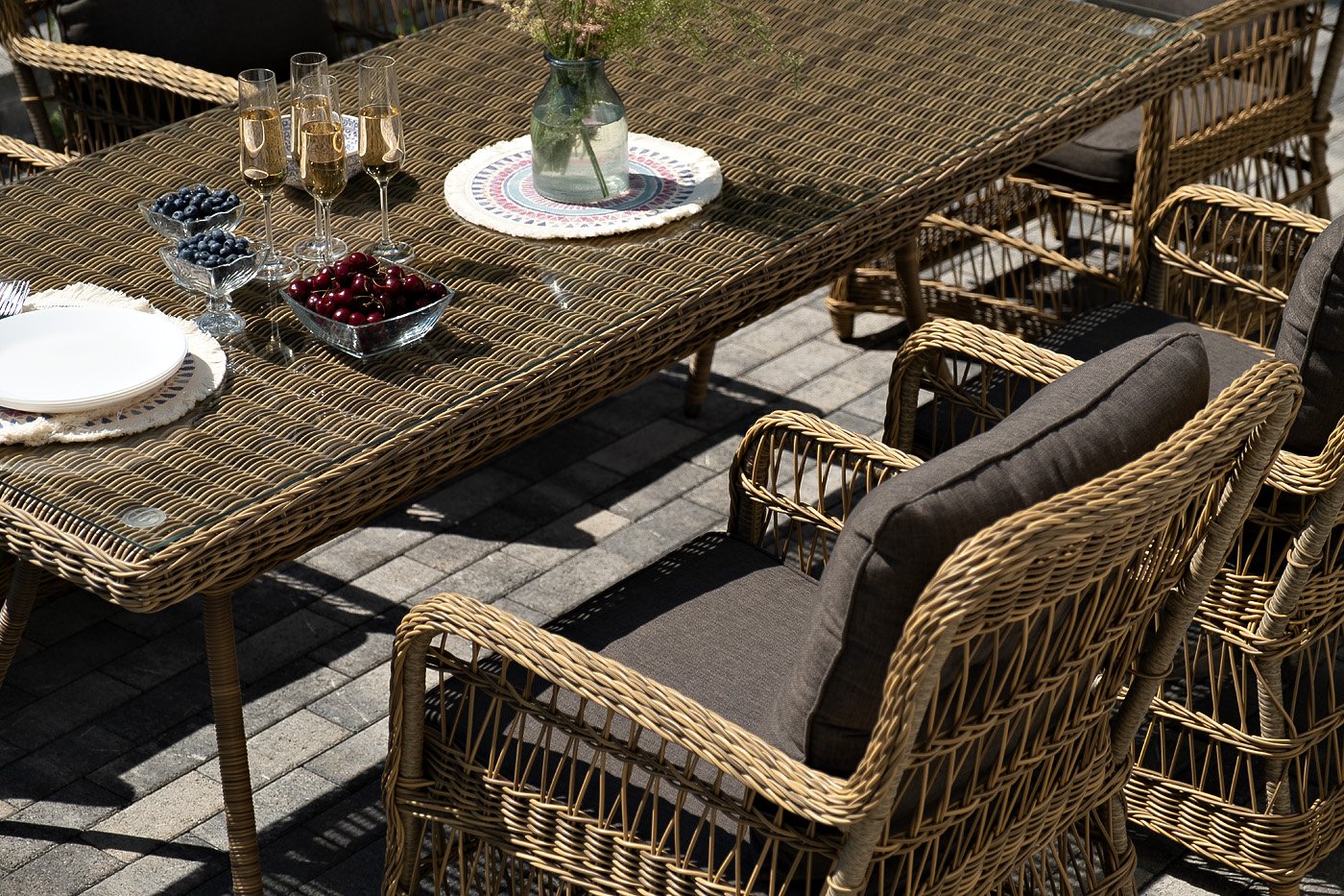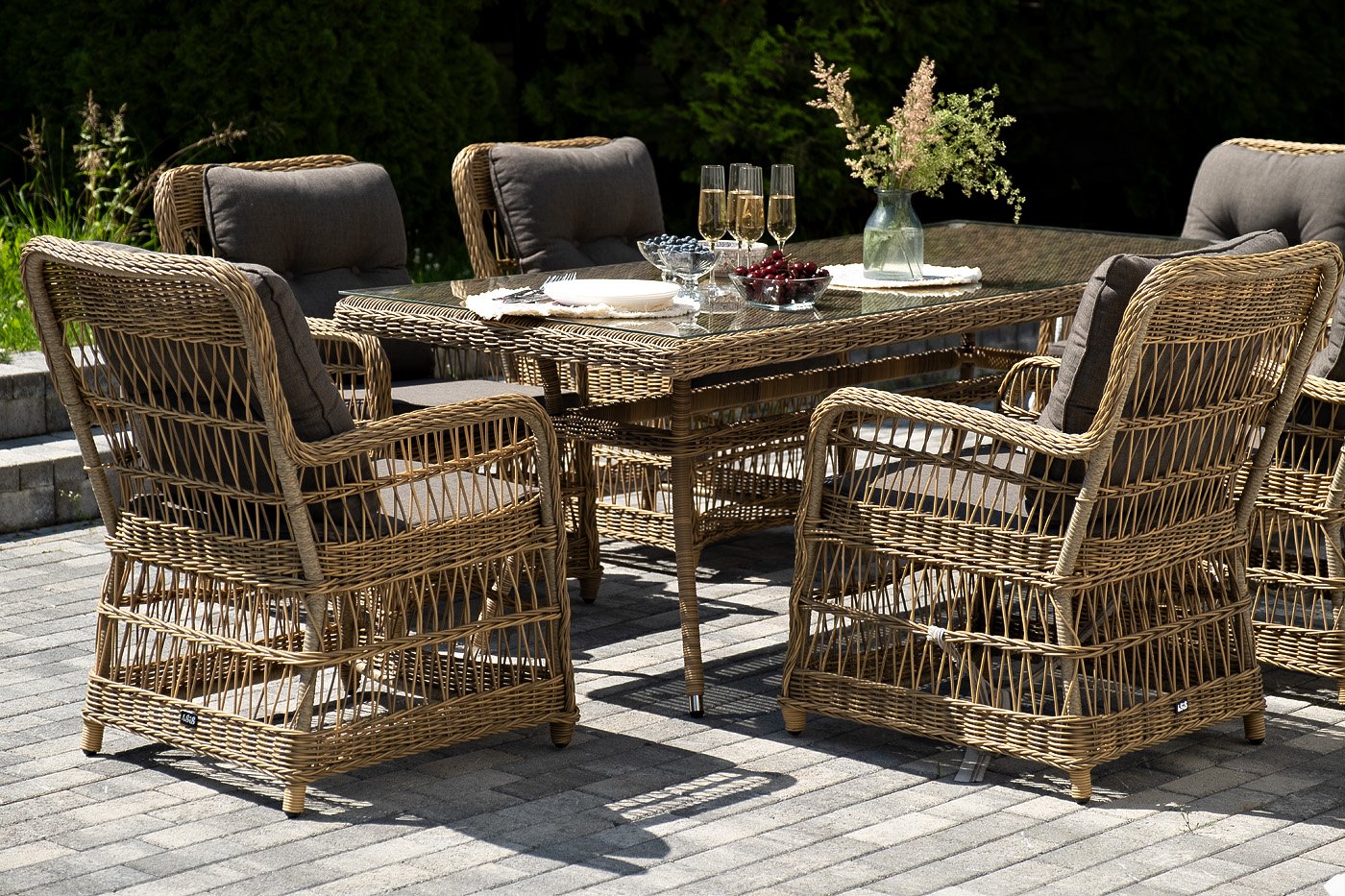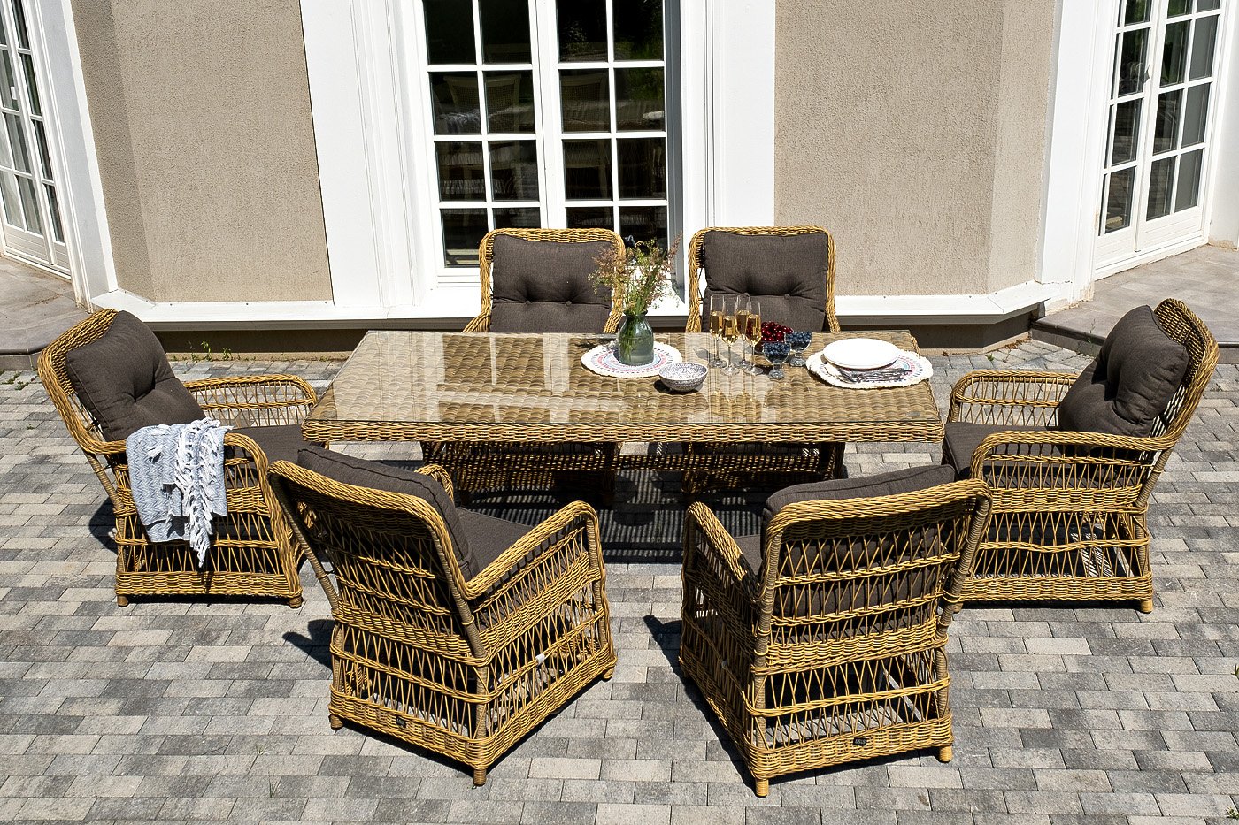 Вся мебель изготовлена из алюминия, вручную оплетенного круглым искусственным ротангом натурального соломенного оттенка. Столешница укомплектована ударопрочным стеклом, толщиной 5 мм. Данное стекло крепится к столу при помощи четырех вакуумных силиконовых присосок и поставляется в собранном виде.