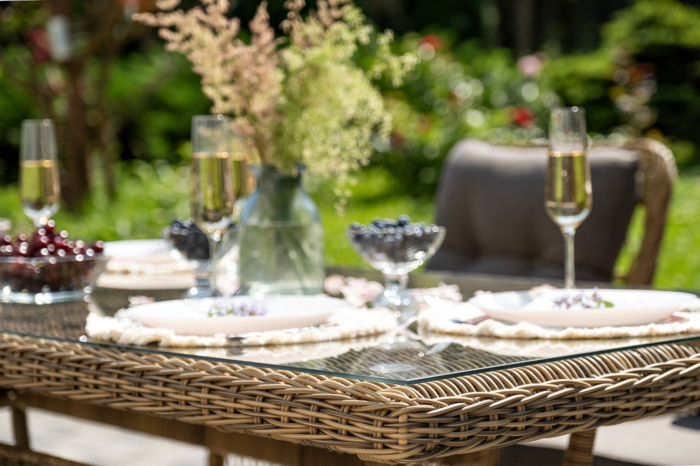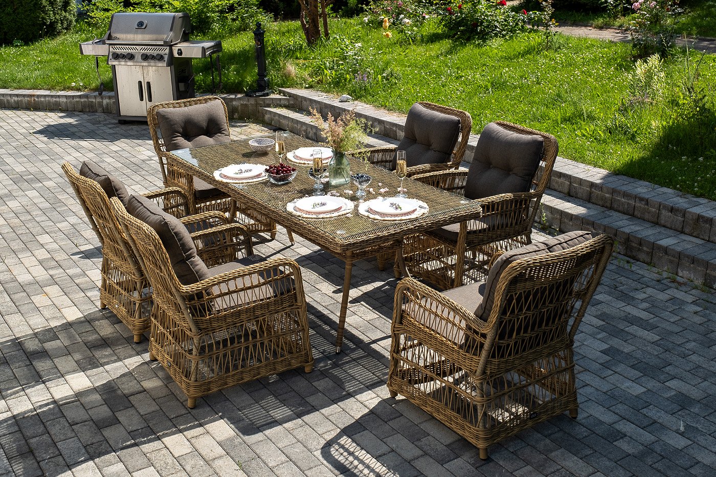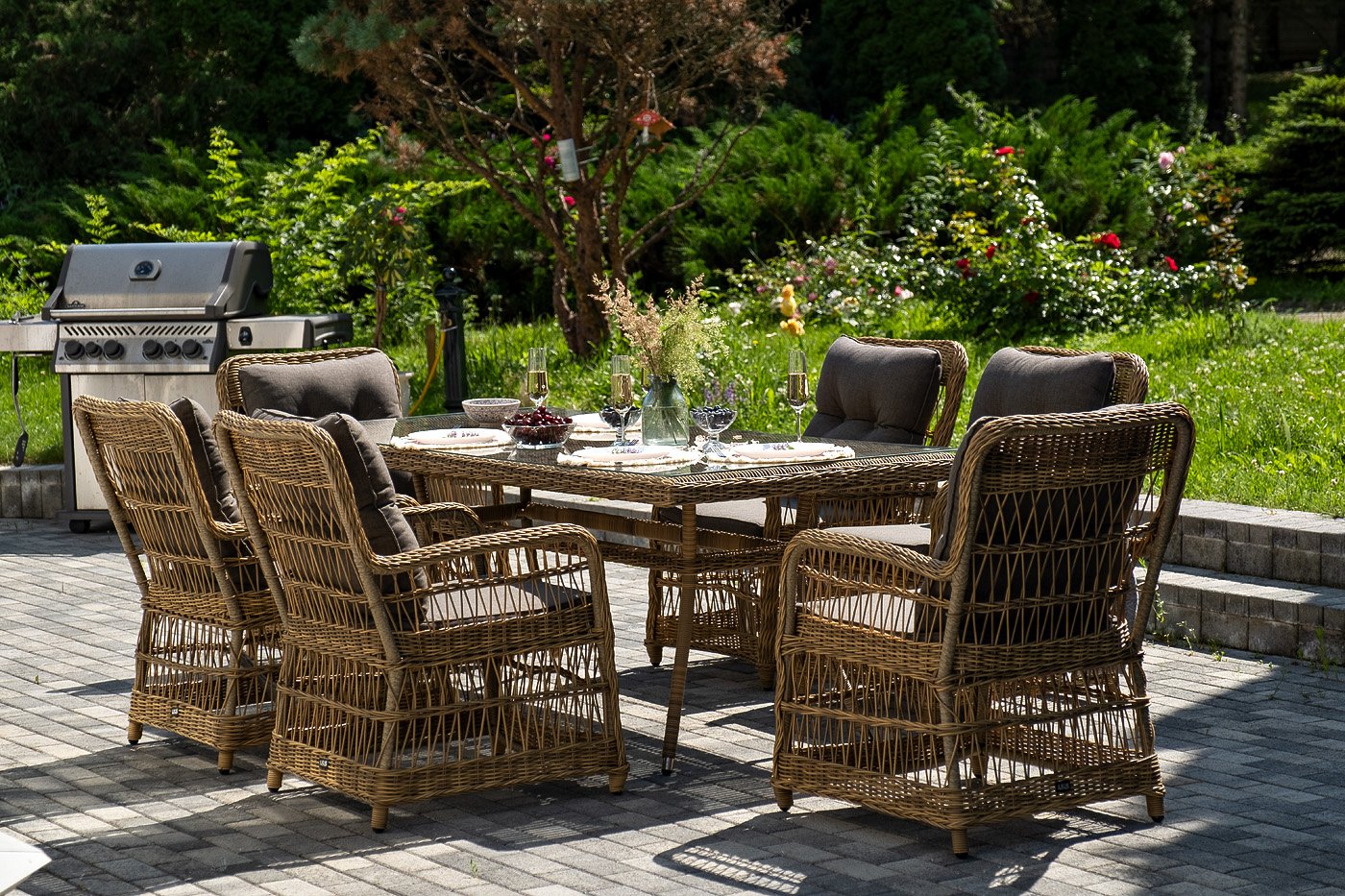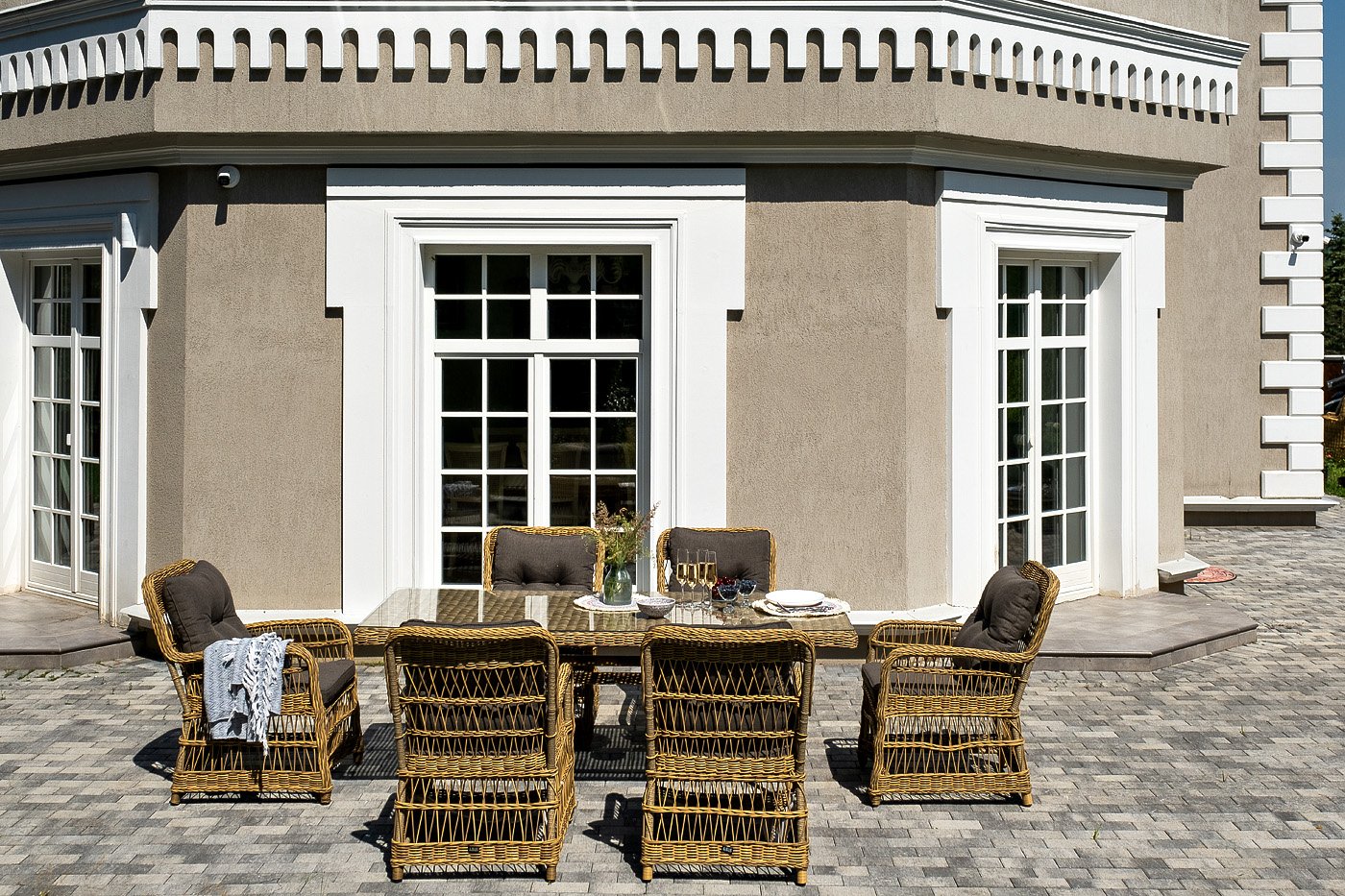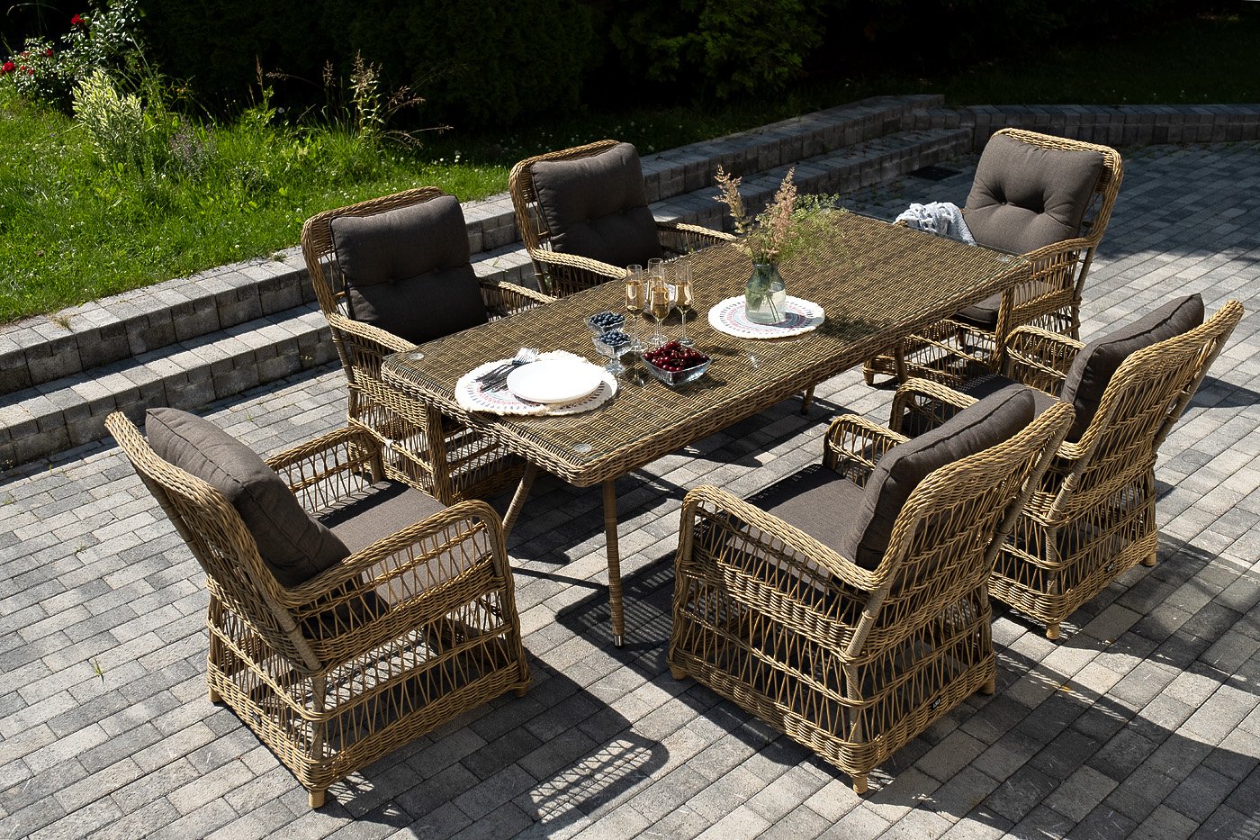 Вся мебель изготовлена из алюминия, вручную оплетенного круглым искусственным ротангом натурального соломенного оттенка. Столешница укомплектована ударопрочным стеклом, толщиной 5 мм. Данное стекло крепится к столу при помощи четырех вакуумных силиконовых присосок и поставляется в собранном виде.