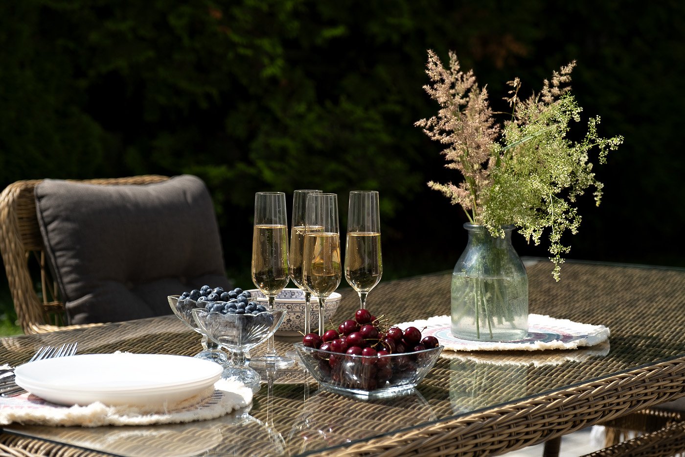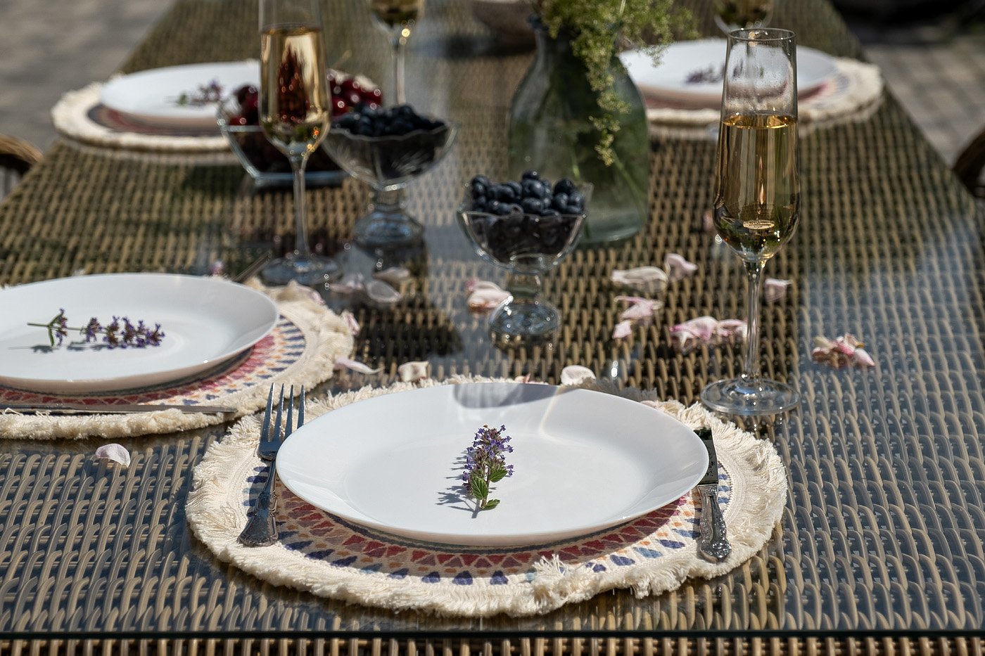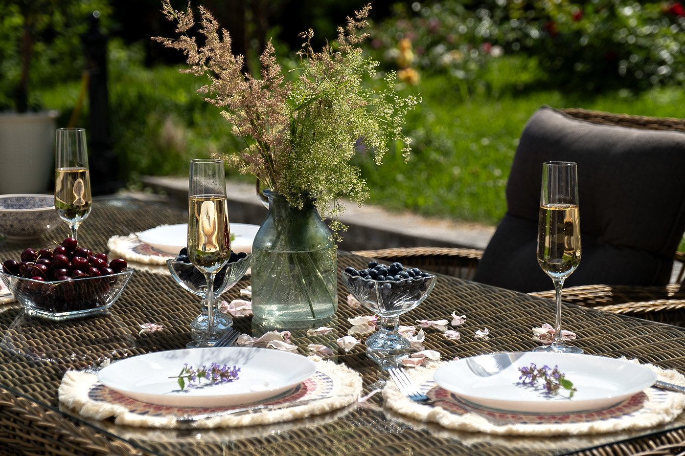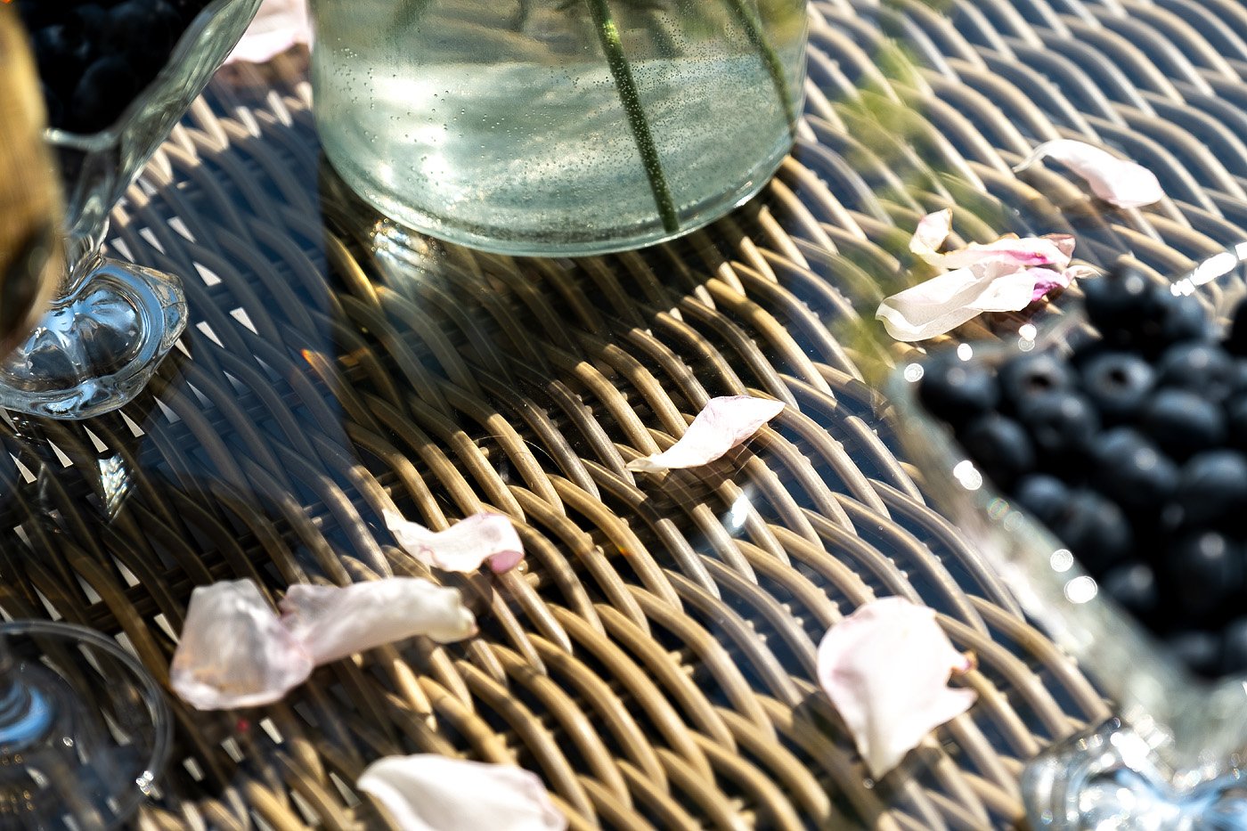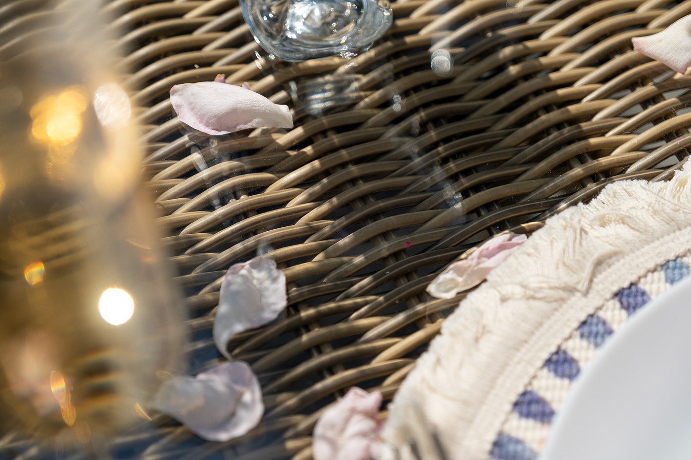 Вся мебель изготовлена из алюминия, вручную оплетенного круглым искусственным ротангом натурального соломенного оттенка. Столешница укомплектована ударопрочным стеклом, толщиной 5 мм. Данное стекло крепится к столу при помощи четырех вакуумных силиконовых присосок и поставляется в собранном виде.
