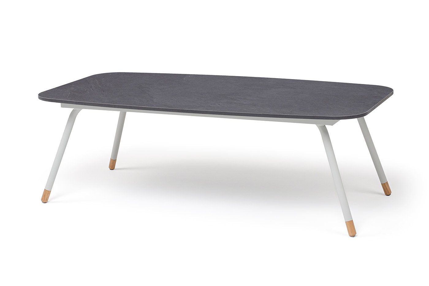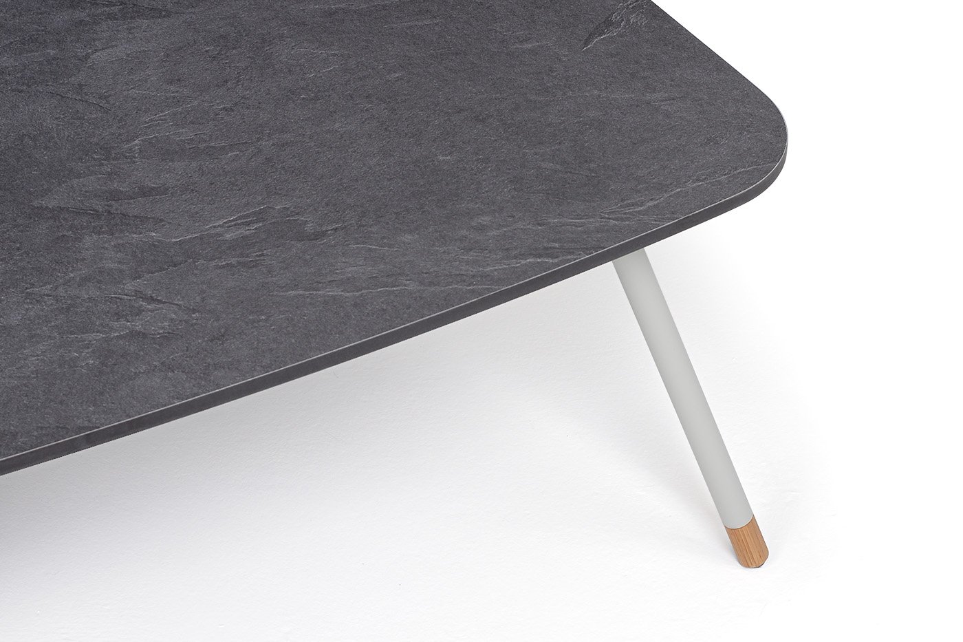 Каркас столика изготовлен из алюминия, окрашенного в светло-серый цвет. Алюминий является легким и прочным материалом, что обеспечивает долговечность и надежность изделия. На ножках столика идут дубовые наконечники (заглушки).