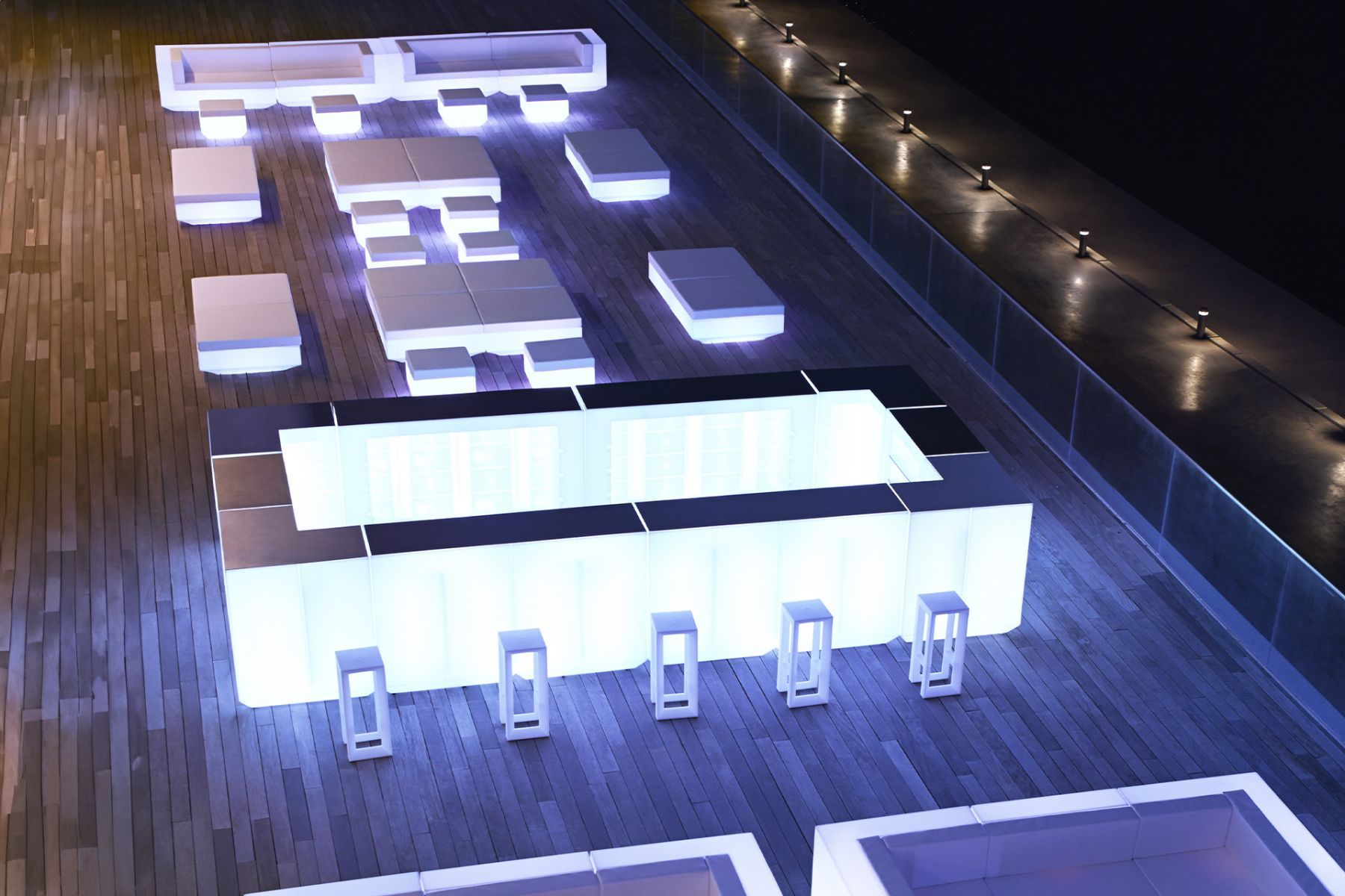 Модульная барная стойка Vela от модного испанского бренда Vondom предназначена для использования в помещении или на открытом воздухе. Она изготовлена из особого полиэтилена, который не выгорает на солнце, не деформируется и не выделяет токсичных веществ при нагревании. Барная стойка Vela доступна в разных цветах, а также в двух вариантах отделки – матовой или глянцевой. Внутри ее модулей может быть установлена LED подсветка. Светящуюся барную стойку Vela мы рекомендуем для использования в ночных клубах, барах и ресторанах. Она прекрасно подойдет для открытых террас. Простая модульная конструкция позволяет легко смонтировать барную стойку именно там, где это нужно, а затем столь же легко ее разобрать. Для барной стойки Vela доступны прямые и угловые модули, а также дверь. Купить модульную барную стойку из пластика с подсветкой Вы можете в нашем интернет-магазине.