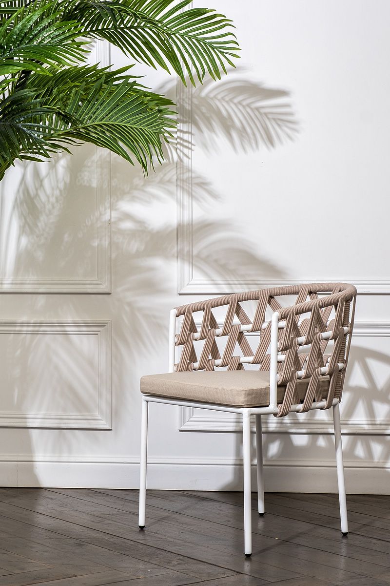 Каркас вручную оплетен бежевым роупом - эластичными синтетическими лентами из высокопрочных полиэфирных волокон.
