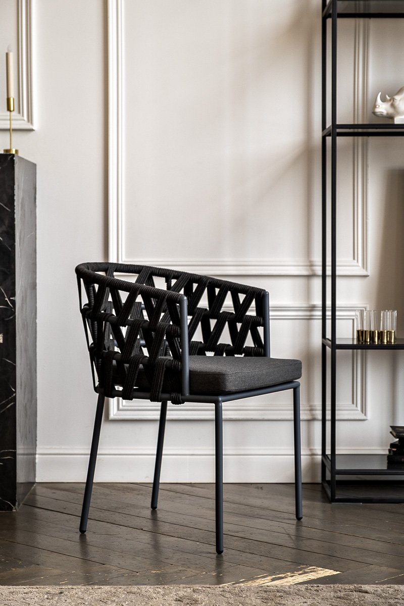 Каркас вручную оплетен темно-серым роупом - эластичными синтетическими лентами из высокопрочных полиэфирных волокон.